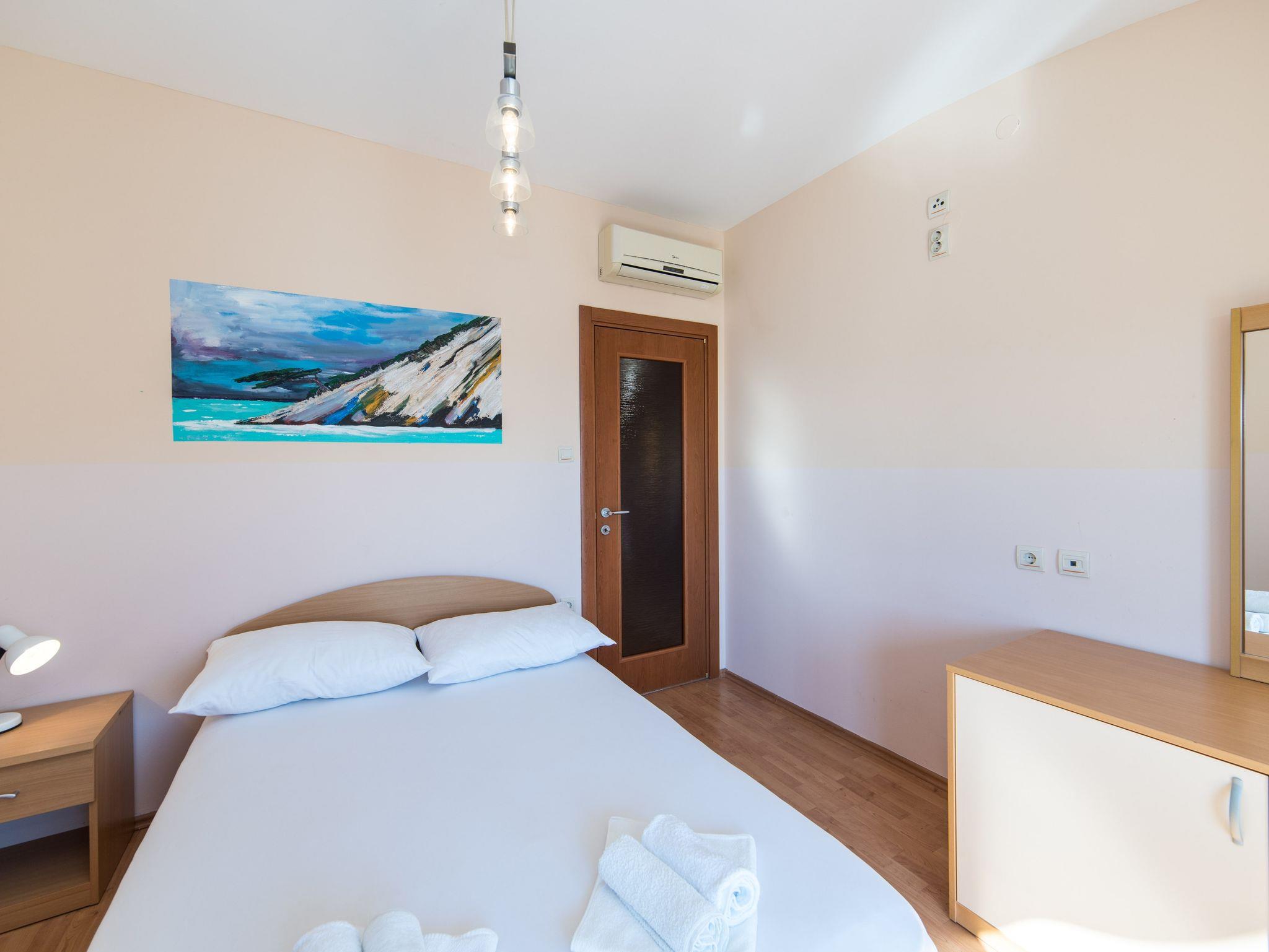 Ferienwohnung bietet Platz für 4 Gäste. Die Betten sind in Schlafzimmern, die es 2 gibt, innerhalb einer Gesamtfläche von 38m2, angeordnet. Die Gäste haben einen eigenen Balkon zur Verfügung, auf der sie in warmen Sommernächten genießen können. Das Apartment bietet Meerblick. Es ist erlaubt, Speisen auf dem Gemeinschafts-Grill vorzubereiten. IM PREIS INBEGRIFFEN: Kurtaxe, Endreinigung, Klimatisierung, Parkplatz, Internet, Bügeleisen, Bügelbrett, Föhn. VERBINDLICHE ZUSÄTZLICHE KOSTEN: Aufzahlung für Kurzaufenthalte (prozentualer Zuschlag pro Nächtigungsanzahl: 30% - 1, 20% - 2, 10% - 3). Die Verfügbarkeit zusätzlicher Dienstleistungen in Ihrem reservierten Termin und die Preise derselben (falls nicht aufgeführt) müssen im Voraus überprüft werden. Zusätzliche Dienstleistungen die in der Zahlungsaufforderung nicht aufgeführt sind werden direkt beim Vermieter bezahlt, angenommen der Gast nutzt auch diese. Ermäßigung auf den Grundpreis: Gratistag 14=13 (bei einem Aufenthalt von 14 Tagen oder mehr erhalten Sie einen Gratistag für den Aufenthalt bis 31.12.26).