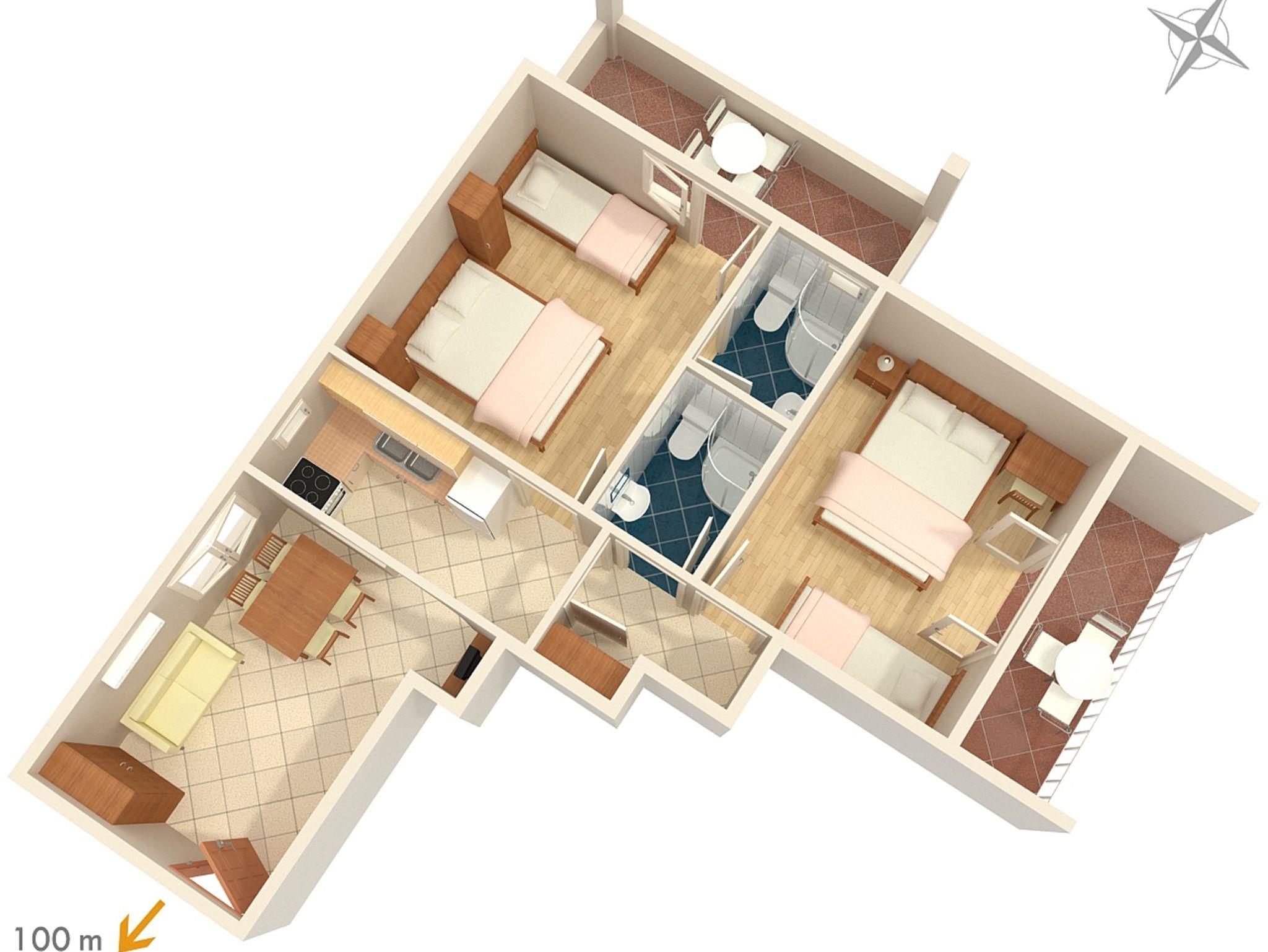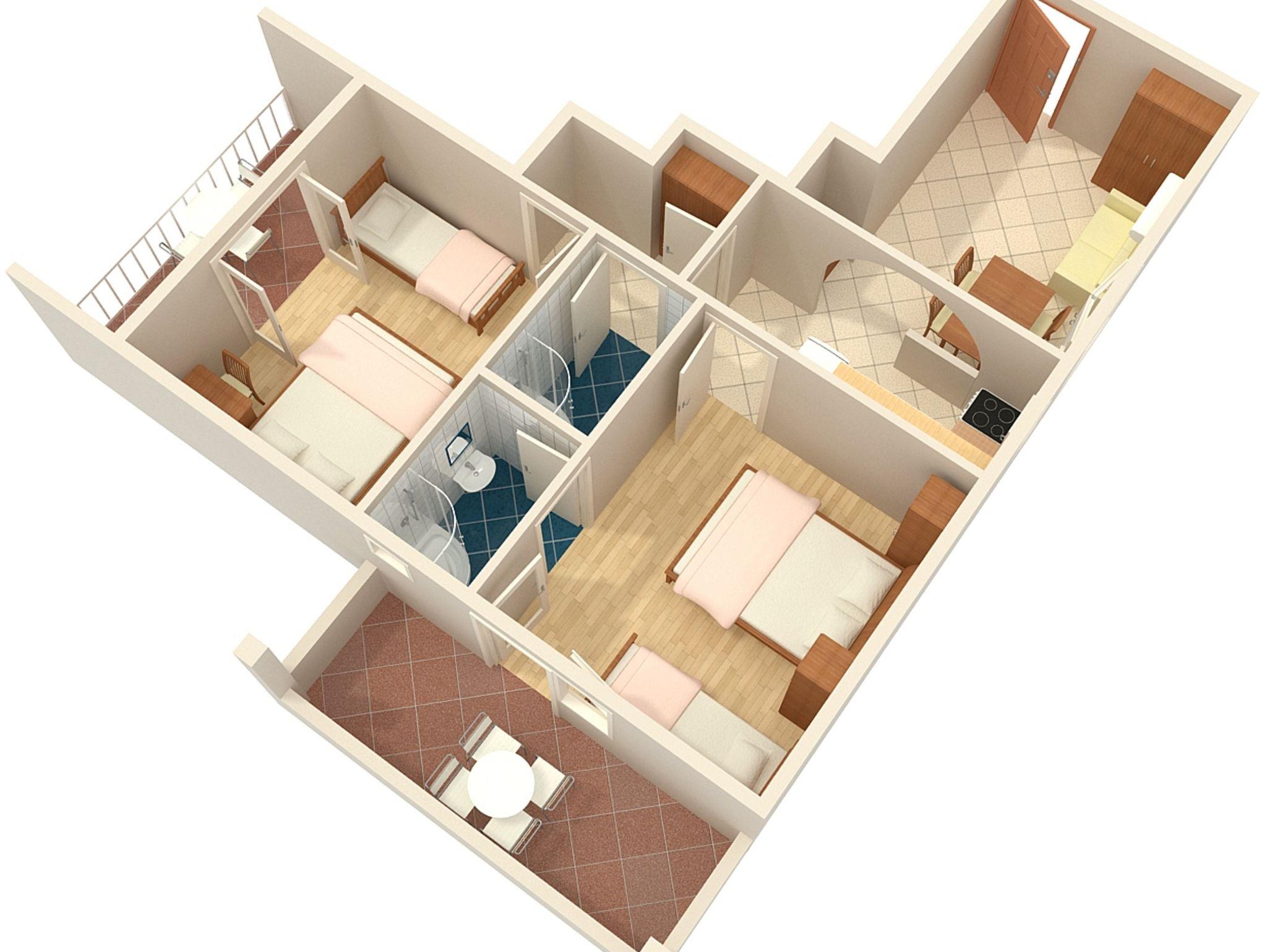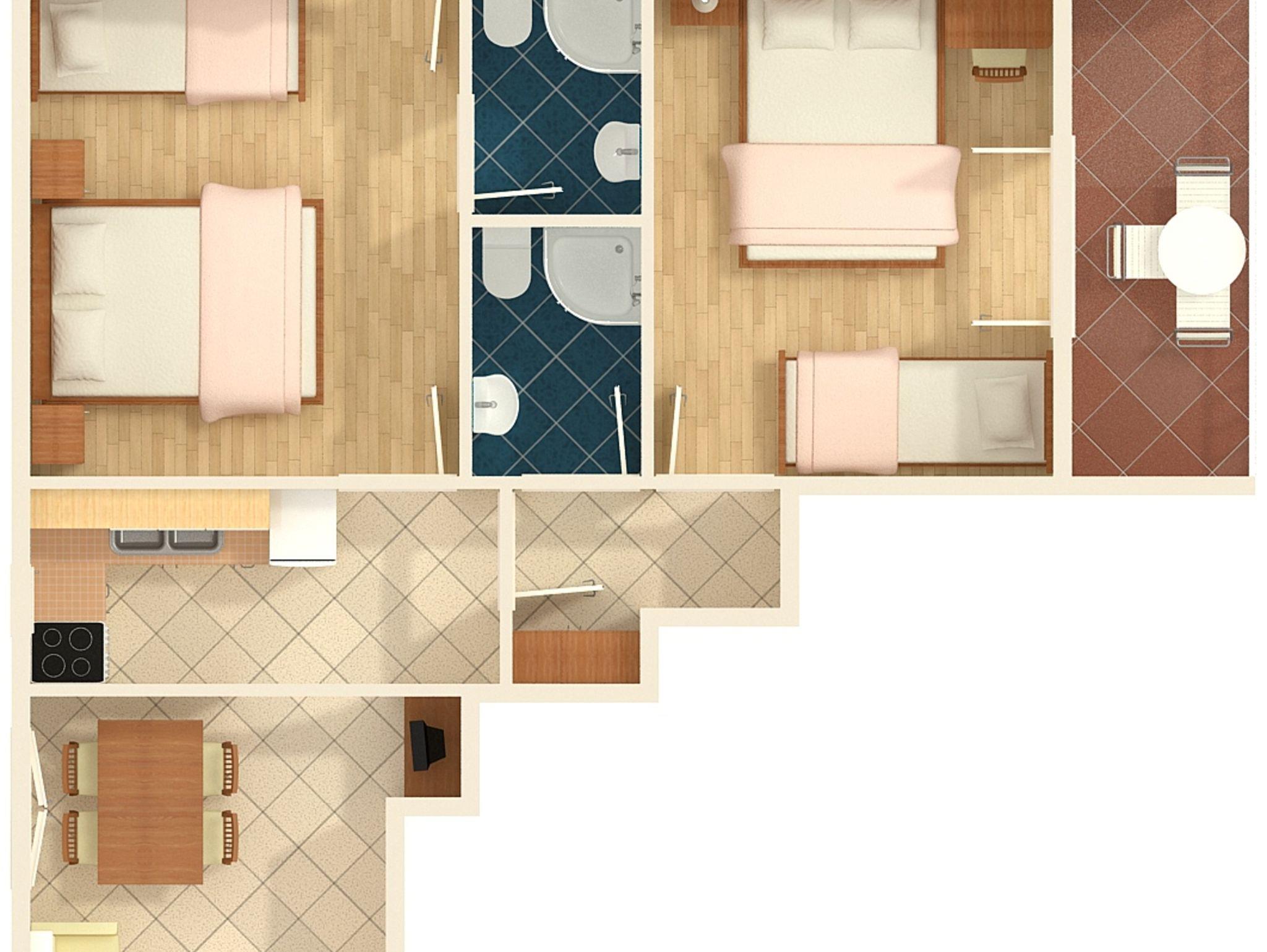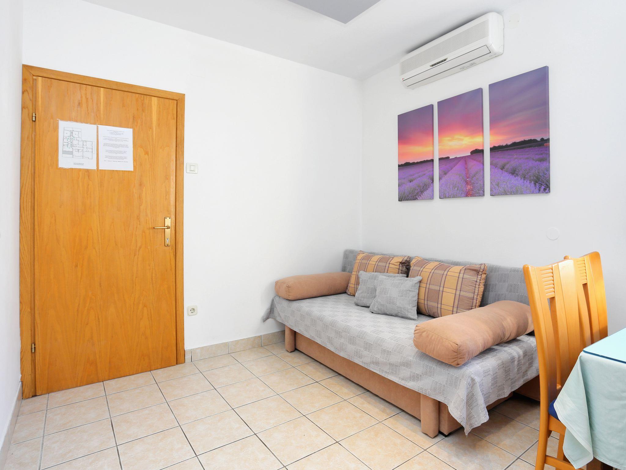 Ferienwohnung bietet Platz für 6 Gäste. Die Betten sind in Schlafzimmern, die es 2 gibt, innerhalb einer Gesamtfläche von 54m2, angeordnet. Die Gäste haben eine eigene Terrasse zur Verfügung, auf der sie in warmen Sommernächten genießen können. Es ist erlaubt, Speisen auf dem Gemeinschafts-Grill vorzubereiten. In der Unterkunftseinheit besteht die Möglichkeit des Mitbringens von Haustieren gegen Aufpreis. IM PREIS INBEGRIFFEN: Kurtaxe, Endreinigung, Klimatisierung, Parkplatz, Garage, Internet, Wäschewaschen, Kinderbett, Bügeleisen, Bügelbrett, Föhn. VERBINDLICHE ZUSÄTZLICHE KOSTEN: Aufzahlung für Kurzaufenthalte (prozentualer Zuschlag pro Nächtigungsanzahl: 30% - 1, 20% - 2, 10% - 3). UNVERBINDLICHE ZUSÄTZLICHE KOSTEN: Haustiere (10,00 € pro Nacht), Zusatzbett (10,00 € pro Nacht). Die Verfügbarkeit zusätzlicher Dienstleistungen in Ihrem reservierten Termin und die Preise derselben (falls nicht aufgeführt) müssen im Voraus überprüft werden. Zusätzliche Dienstleistungen die in der Zahlungsaufforderung nicht aufgeführt sind werden direkt beim Vermieter bezahlt, angenommen der Gast nutzt auch diese.