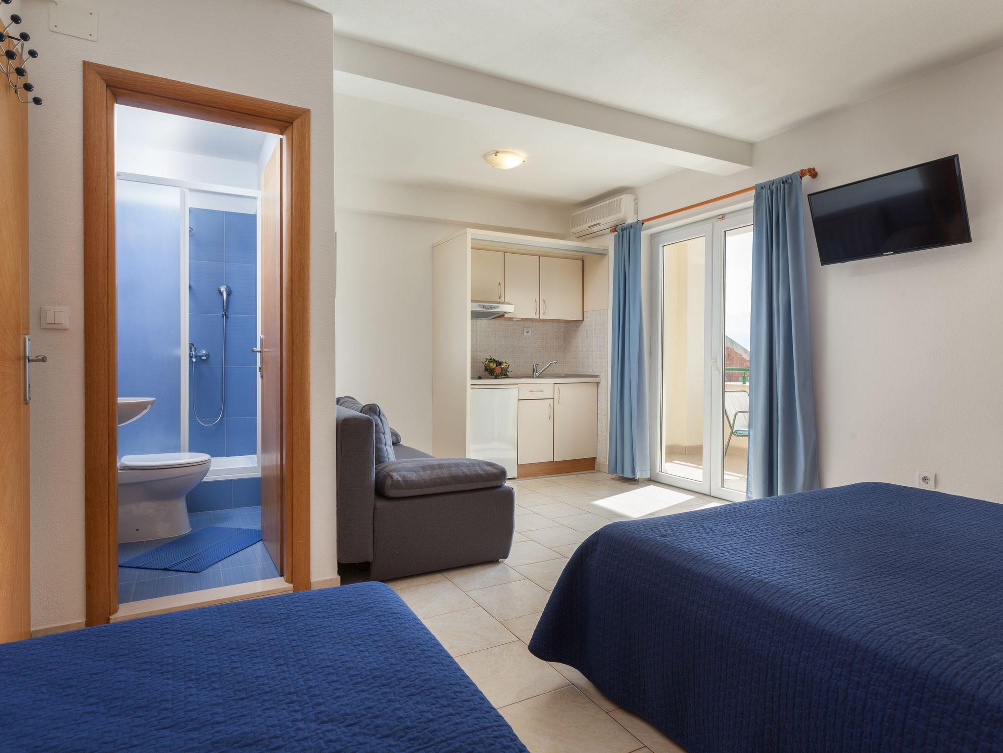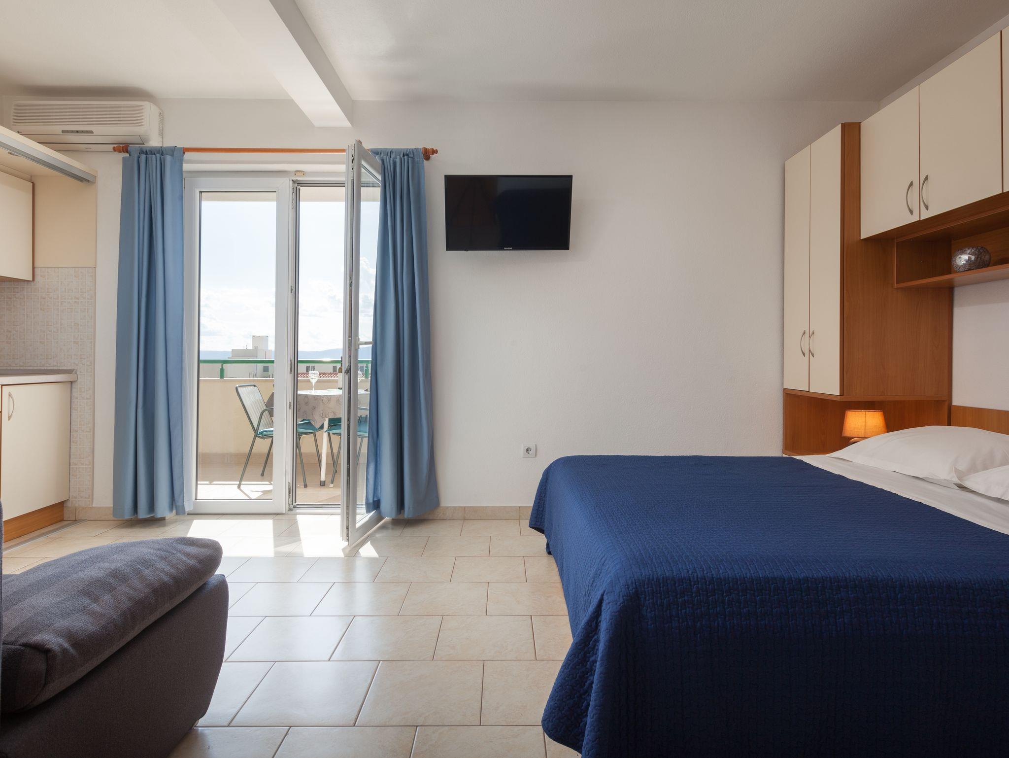 Studio bietet Platz für 4 Gäste. Die Betten sind in Schlafzimmern, die es 1 gibt, und in Wohnzimmer, innerhalb einer Gesamtfläche von 21m2, angeordnet. Die Gäste haben einen eigenen Balkon zur Verfügung, auf der sie in warmen Sommernächten genießen können. Das Studio-Apartment bietet Meerblick. IM PREIS INBEGRIFFEN: Kurtaxe, Endreinigung, Klimatisierung, Parkplatz, Internet, Kinderbett, Bügeleisen, Bügelbrett, Föhn, 1 Bett für Kinder (im Preis enthalten). VERBINDLICHE ZUSÄTZLICHE KOSTEN: Aufzahlung für Kurzaufenthalte (prozentualer Zuschlag pro Nächtigungsanzahl: 30% - 1, 20% - 2, 10% - 3). Die Verfügbarkeit zusätzlicher Dienstleistungen in Ihrem reservierten Termin und die Preise derselben (falls nicht aufgeführt) müssen im Voraus überprüft werden. Zusätzliche Dienstleistungen die in der Zahlungsaufforderung nicht aufgeführt sind werden direkt beim Vermieter bezahlt, angenommen der Gast nutzt auch diese.