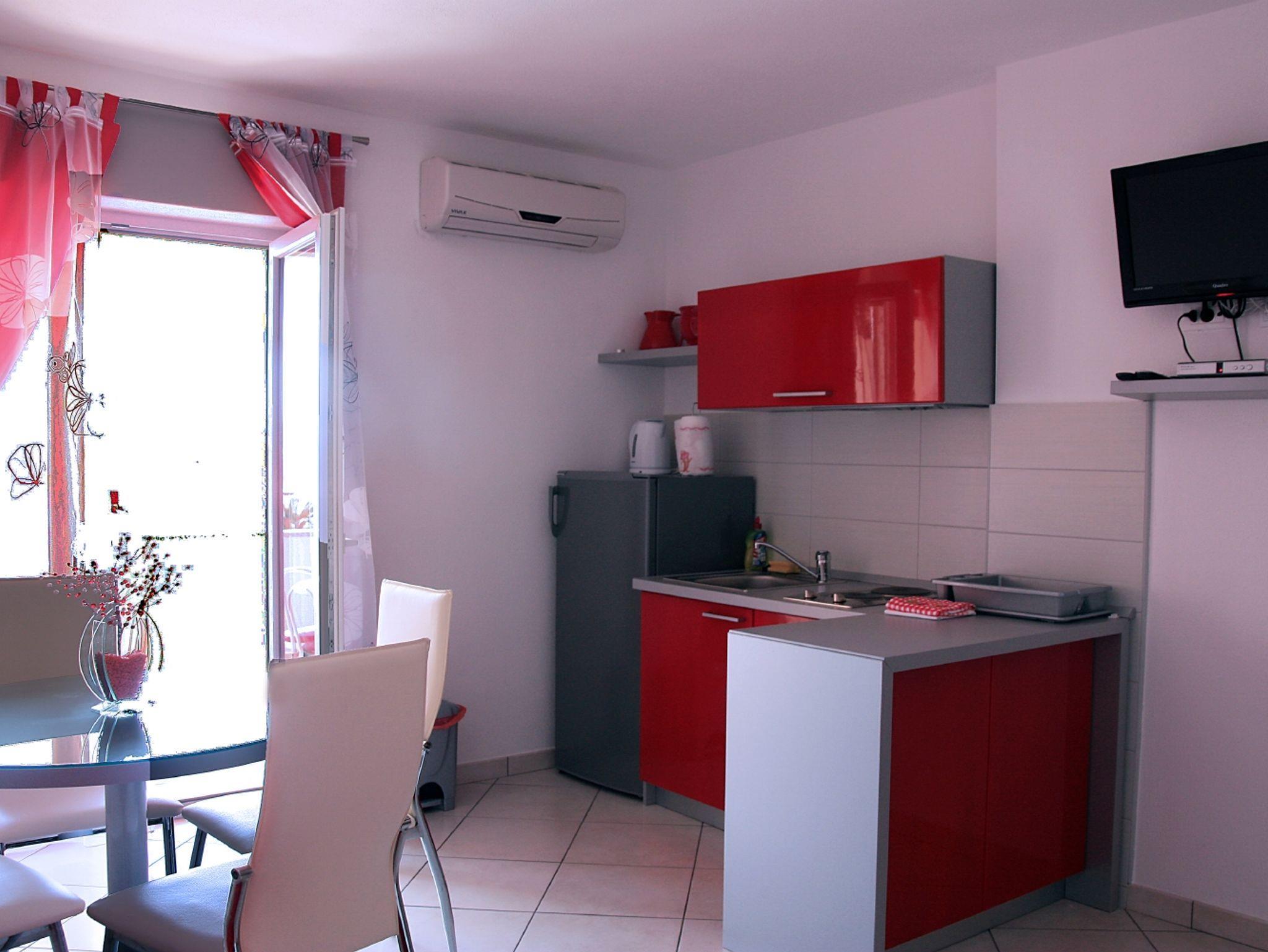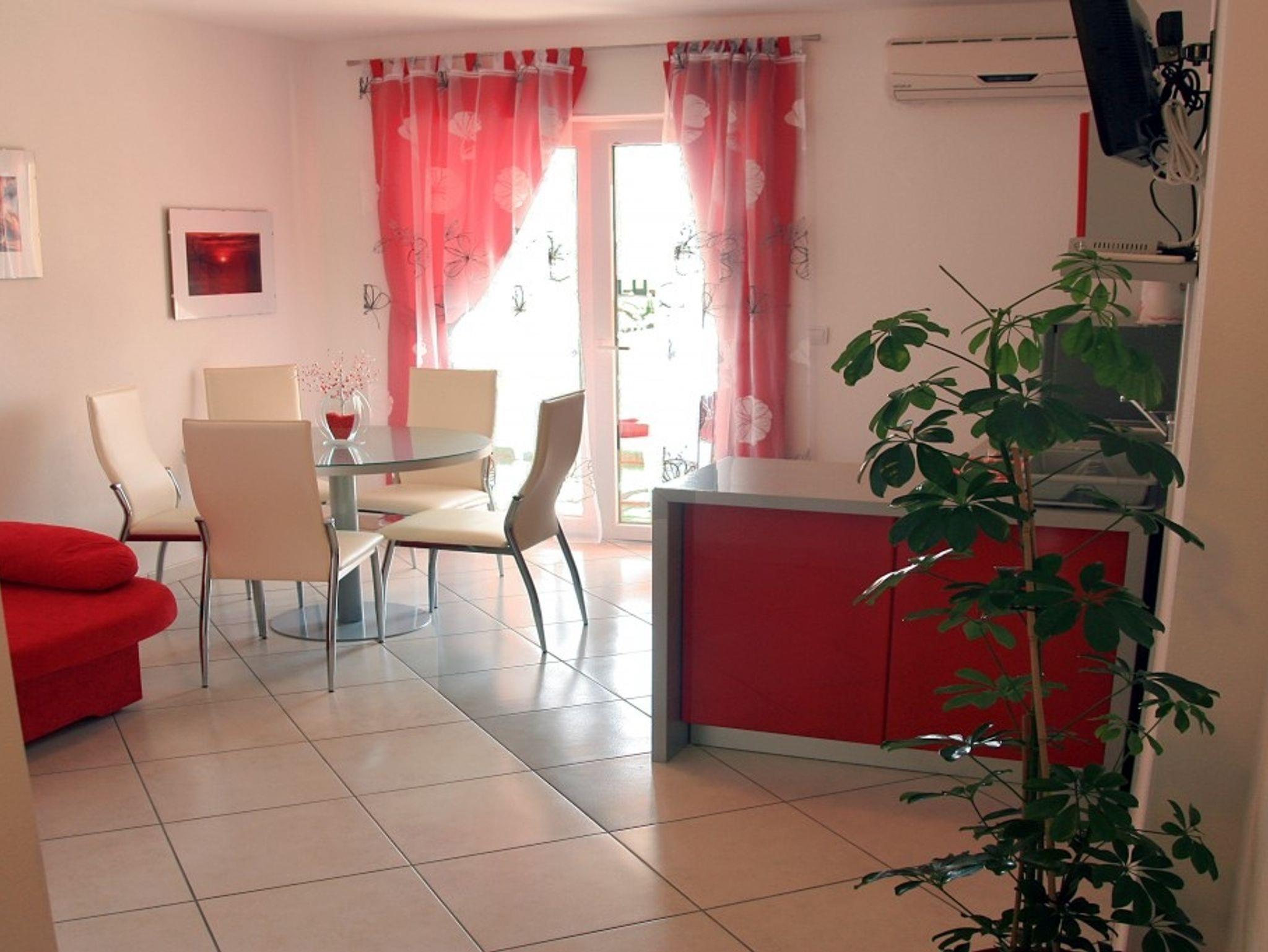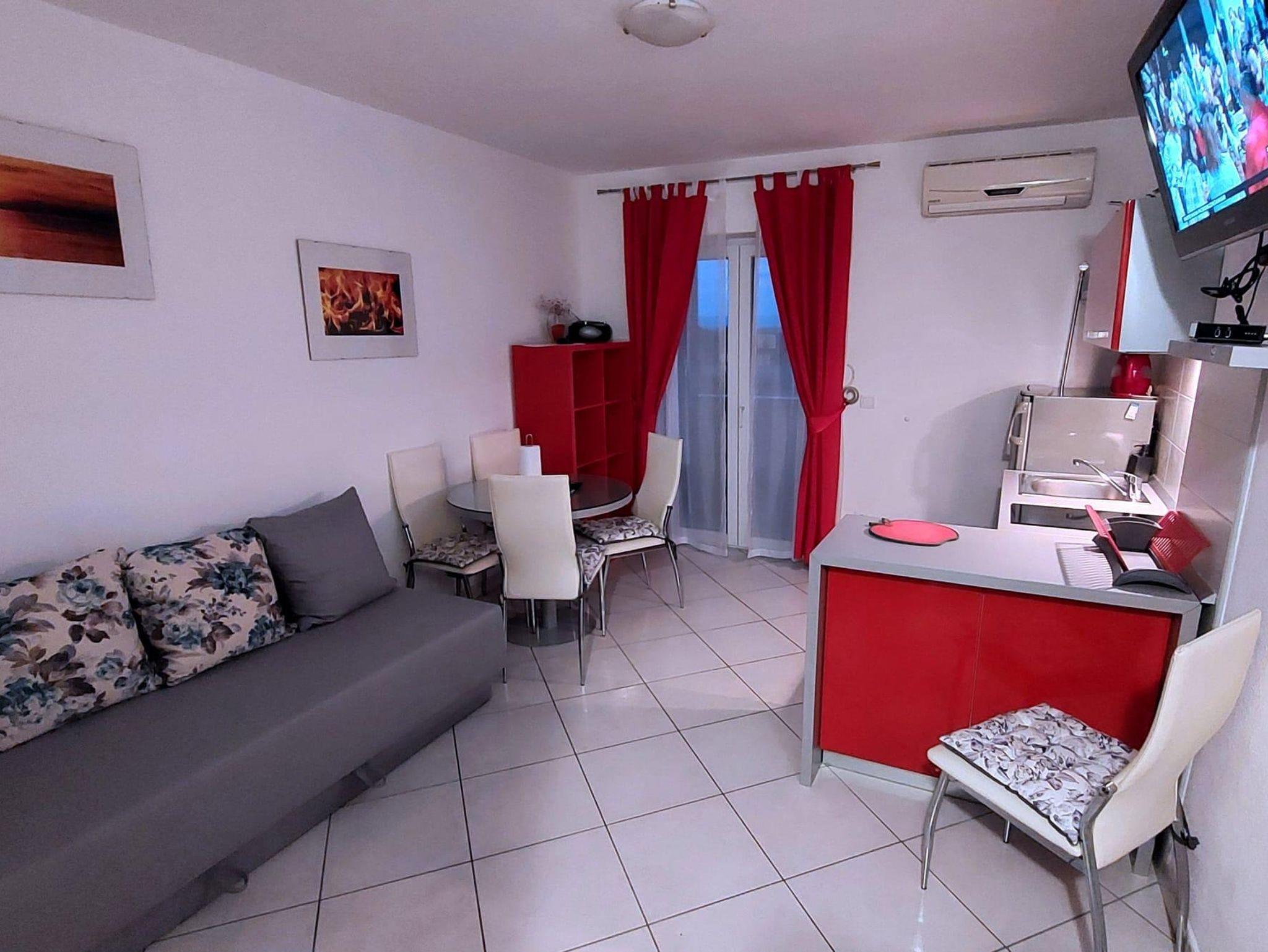 Ferienwohnung bietet Platz für 5 Gäste. Die Betten sind in Schlafzimmern, die es 1 gibt, und in Wohnzimmer, innerhalb einer Gesamtfläche von 29m2, angeordnet. Die Gäste haben eine eigene Terrasse zur Verfügung, auf der sie in warmen Sommernächten genießen können. Das Apartment bietet Meerblick. IM PREIS INBEGRIFFEN: Kurtaxe, Endreinigung, Klimatisierung, Parkplatz, Internet, Kinderbett, Föhn. VERBINDLICHE ZUSÄTZLICHE KOSTEN: Aufzahlung für Kurzaufenthalte (prozentualer Zuschlag pro Nächtigungsanzahl: 30% - 1, 20% - 2, 10% - 3). Die Verfügbarkeit zusätzlicher Dienstleistungen in Ihrem reservierten Termin und die Preise derselben (falls nicht aufgeführt) müssen im Voraus überprüft werden. Zusätzliche Dienstleistungen die in der Zahlungsaufforderung nicht aufgeführt sind werden direkt beim Vermieter bezahlt, angenommen der Gast nutzt auch diese.