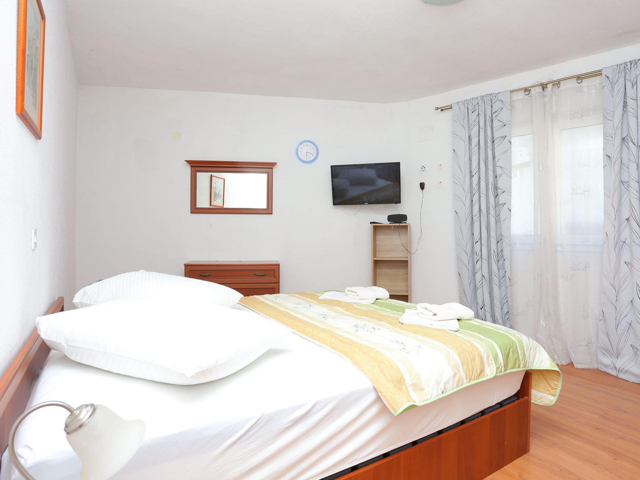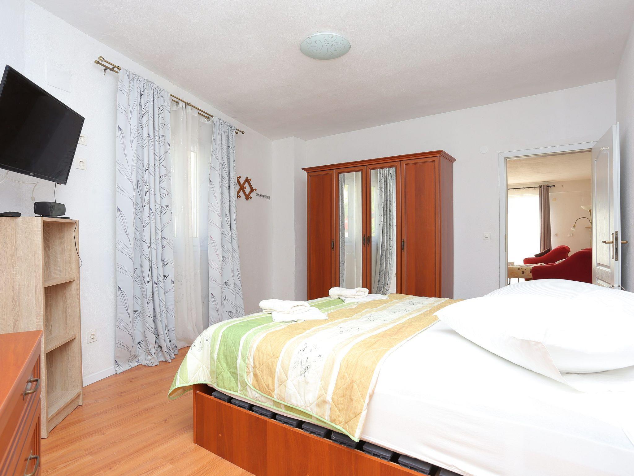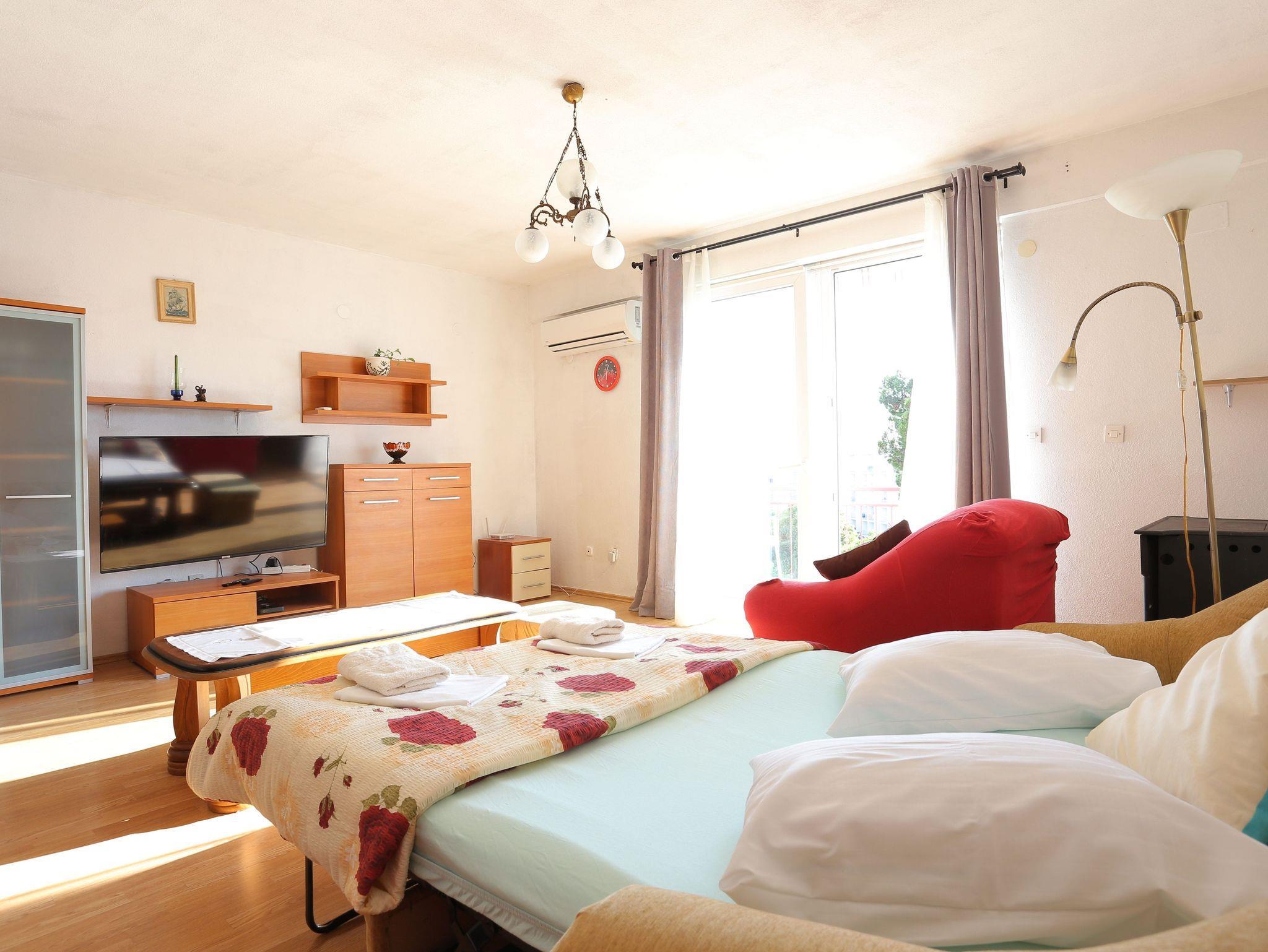 Ferienwohnung bietet Platz für 4 Gäste. Die Betten sind in Schlafzimmern, die es 1 gibt, und in Wohnzimmer, innerhalb einer Gesamtfläche von 68m2, angeordnet. Die Gäste haben einen eigenen Balkon zur Verfügung, auf der sie in warmen Sommernächten genießen können. Das Apartment bietet Meerblick. IM PREIS INBEGRIFFEN: Kurtaxe, Endreinigung, Klimatisierung, Parkplatz, Internet. VERBINDLICHE ZUSÄTZLICHE KOSTEN: Aufzahlung für Kurzaufenthalte (prozentualer Zuschlag pro Nächtigungsanzahl: 30% - 1, 20% - 2, 10% - 3). Die Verfügbarkeit zusätzlicher Dienstleistungen in Ihrem reservierten Termin und die Preise derselben (falls nicht aufgeführt) müssen im Voraus überprüft werden. Zusätzliche Dienstleistungen die in der Zahlungsaufforderung nicht aufgeführt sind werden direkt beim Vermieter bezahlt, angenommen der Gast nutzt auch diese. Ermäßigung auf den Grundpreis: Gratistag 14=13 (bei einem Aufenthalt von 14 Tagen oder mehr erhalten Sie einen Gratistag für den Aufenthalt bis 31.12.26).