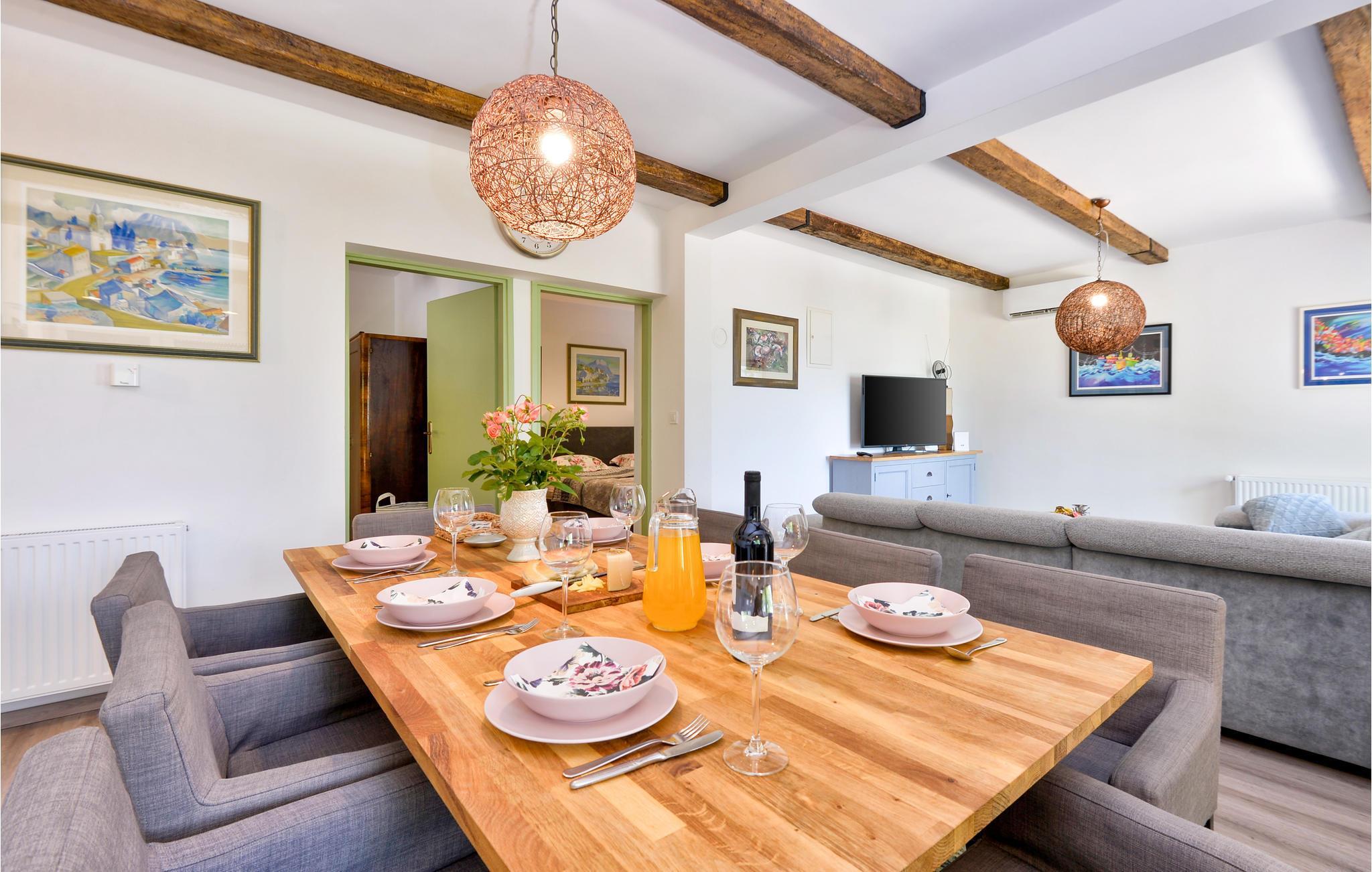 Freuen Sie sich auf einen Urlaub mit entspannten Tagen am Pool, leckeren Abendessen draußen und eine angenehme Einrichtung im Inneren des einladenden Ferienhauses. Das Haus bietet mit seinen zwei Schlafzimmern, einem Badezimmer, einem Wohnraum mit Küche und einem Aktivitätsraum viel Platz.