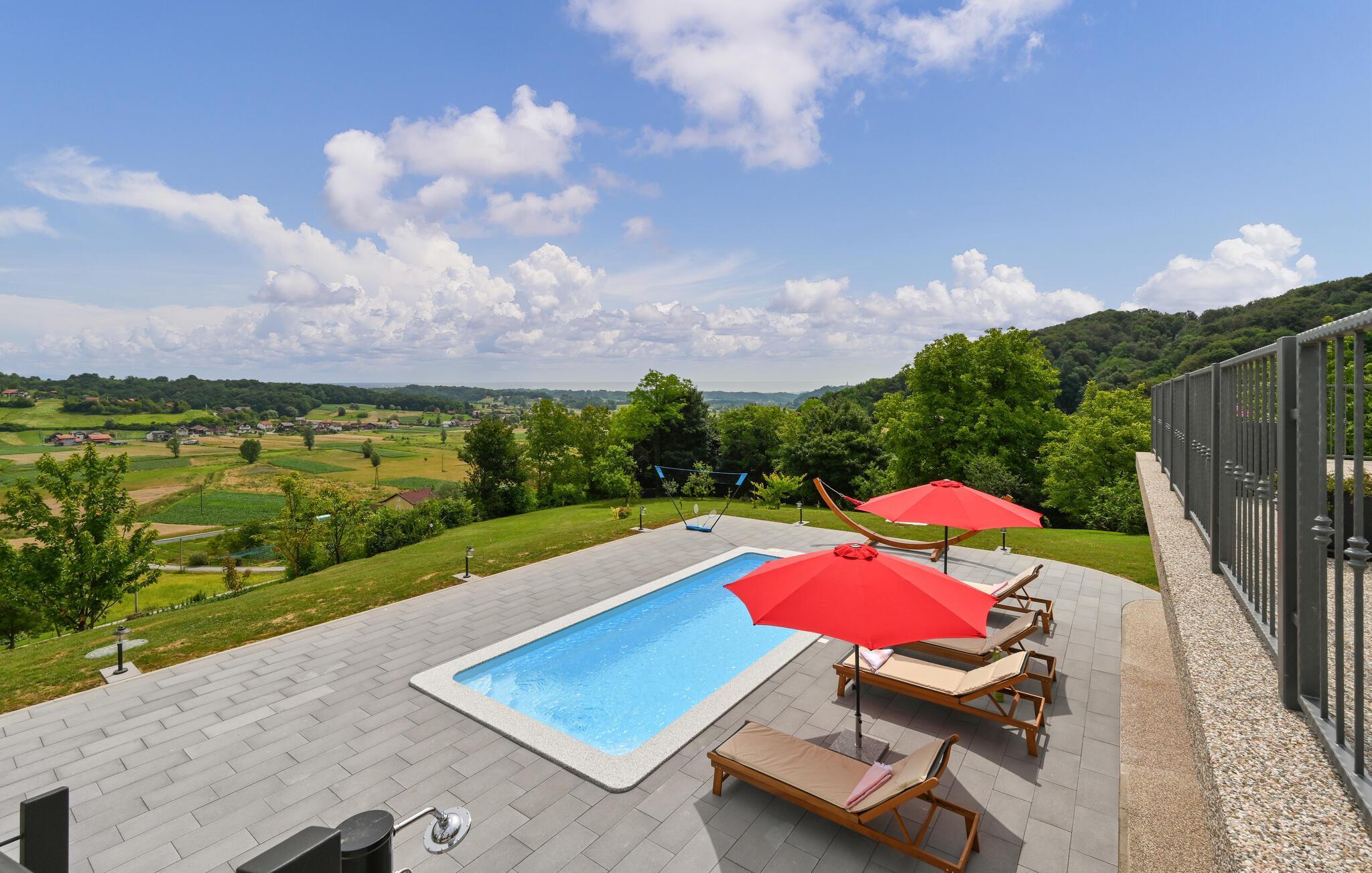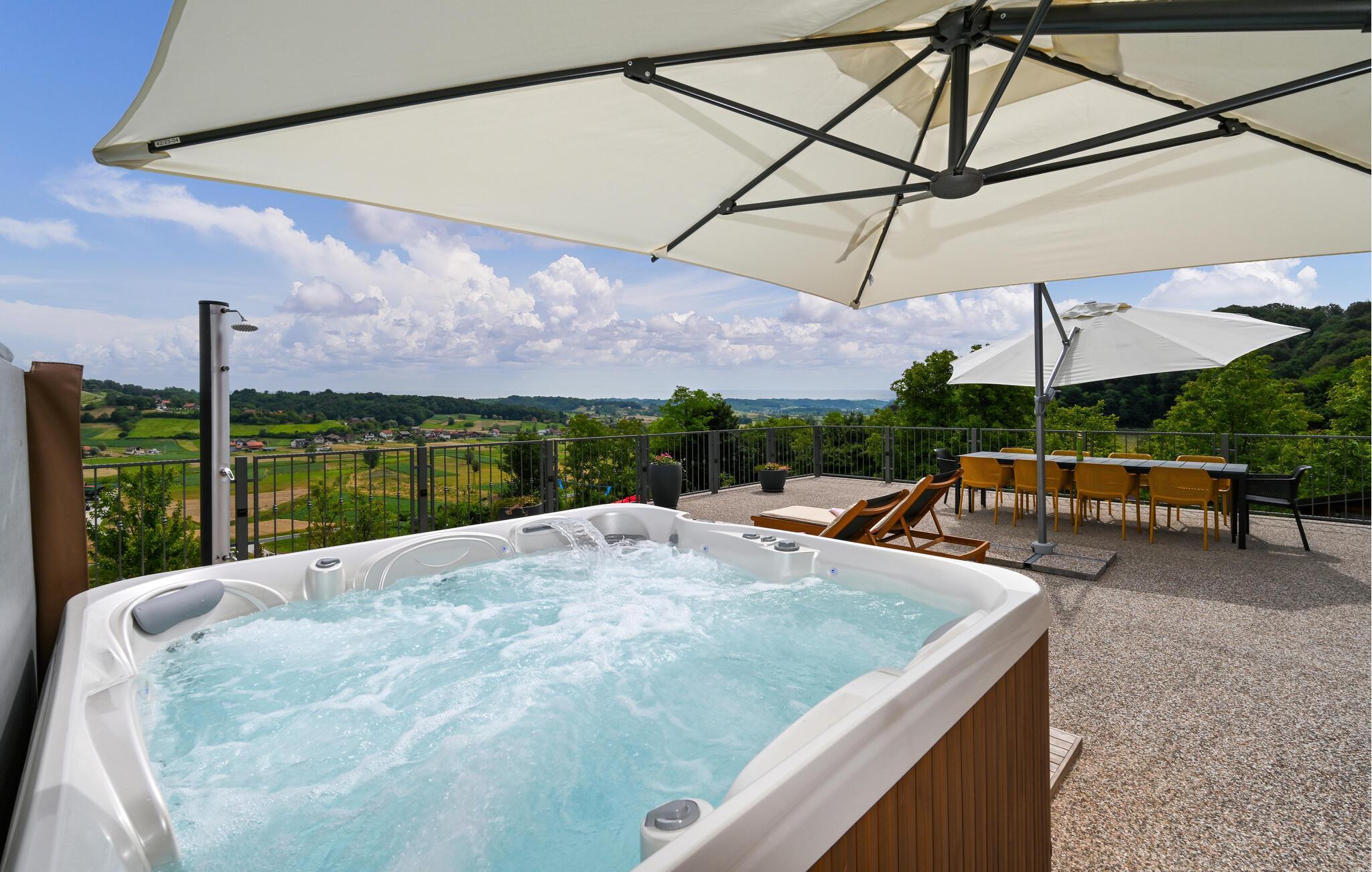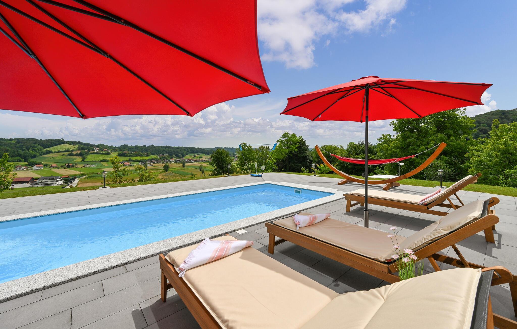 In den Sommermonaten lockt der Garten mit Swimmingpool und Whirlpool und einem fantastischen Panoramablick über die Landschaft