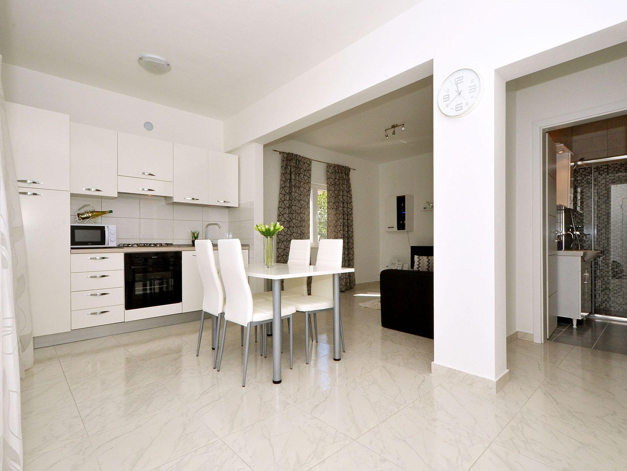 Haus bietet Platz für 5 Gäste. Die Betten sind in Schlafzimmern, die es 2 gibt, und in Wohnzimmer, innerhalb einer Gesamtfläche von 66m2, angeordnet. Die Gäste haben eine eigene Terrasse zur Verfügung, auf der sie in warmen Sommernächten genießen können. Das Haus bietet Meerblick. Für vollen Genuss und Entspannung gibt es einen privaten Grill für Gäste dieser Unterkunft. IM PREIS INBEGRIFFEN: Kurtaxe, Endreinigung, Klimatisierung, Parkplatz, Internet, Kinderbett, Bügeleisen, Bügelbrett, Föhn. VERBINDLICHE ZUSÄTZLICHE KOSTEN: Aufzahlung für Kurzaufenthalte (prozentualer Zuschlag pro Nächtigungsanzahl: 30% - 1, 20% - 2, 10% - 3). UNVERBINDLICHE ZUSÄTZLICHE KOSTEN: Bootsanlegeplatz (15,00 € pro Nacht). Die Verfügbarkeit zusätzlicher Dienstleistungen in Ihrem reservierten Termin und die Preise derselben (falls nicht aufgeführt) müssen im Voraus überprüft werden. Zusätzliche Dienstleistungen die in der Zahlungsaufforderung nicht aufgeführt sind werden direkt beim Vermieter bezahlt, angenommen der Gast nutzt auch diese. Ermäßigung auf den Grundpreis: Gratistag 14=13 (bei einem Aufenthalt von 14 Tagen oder mehr erhalten Sie einen Gratistag für den Aufenthalt bis 31.12.26).