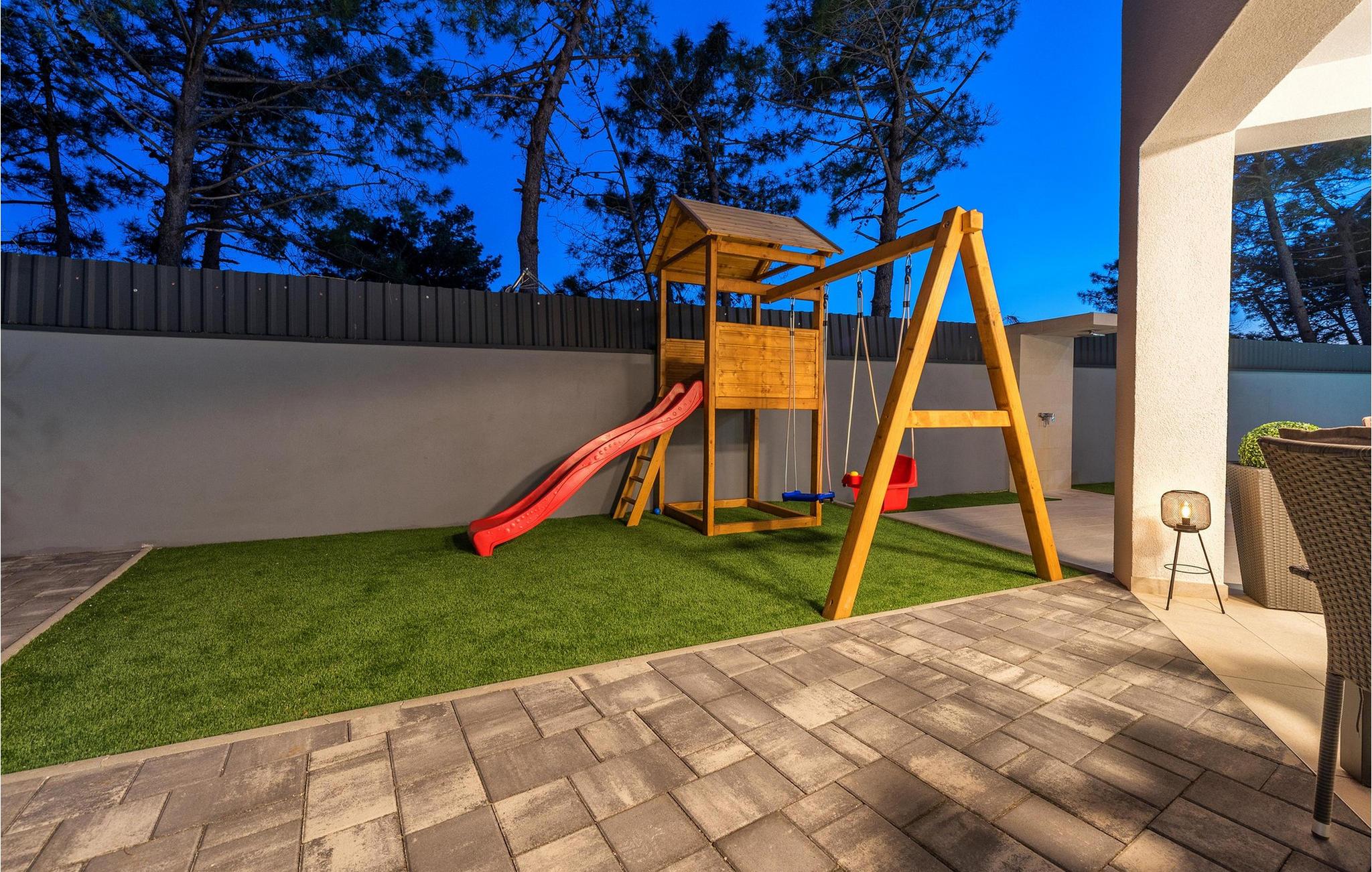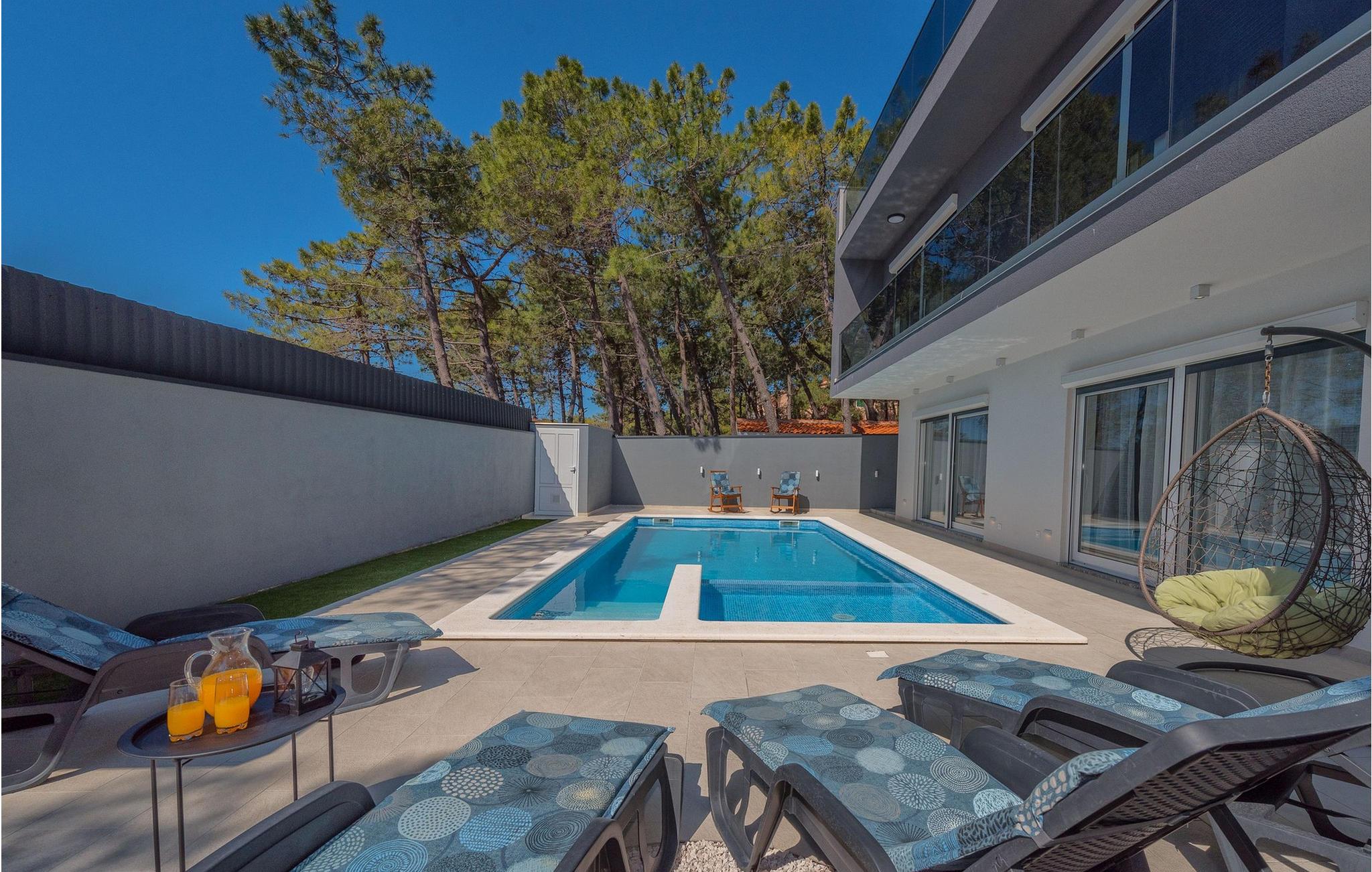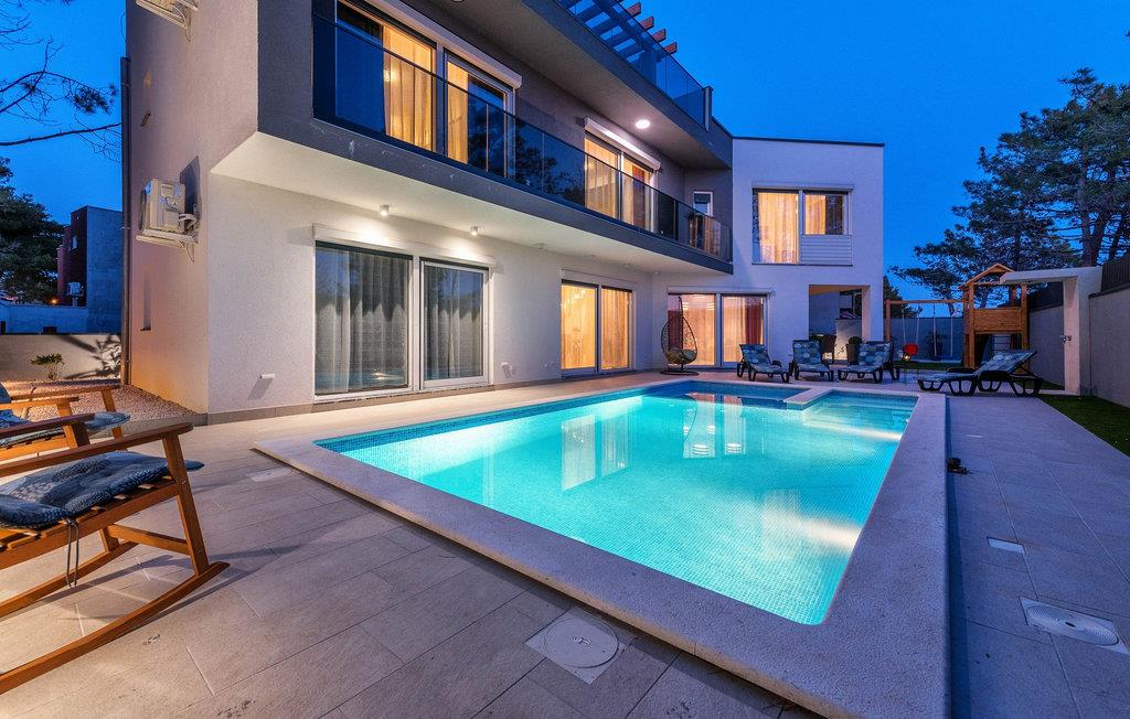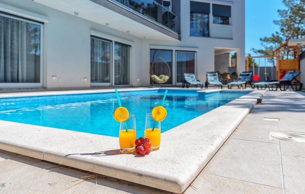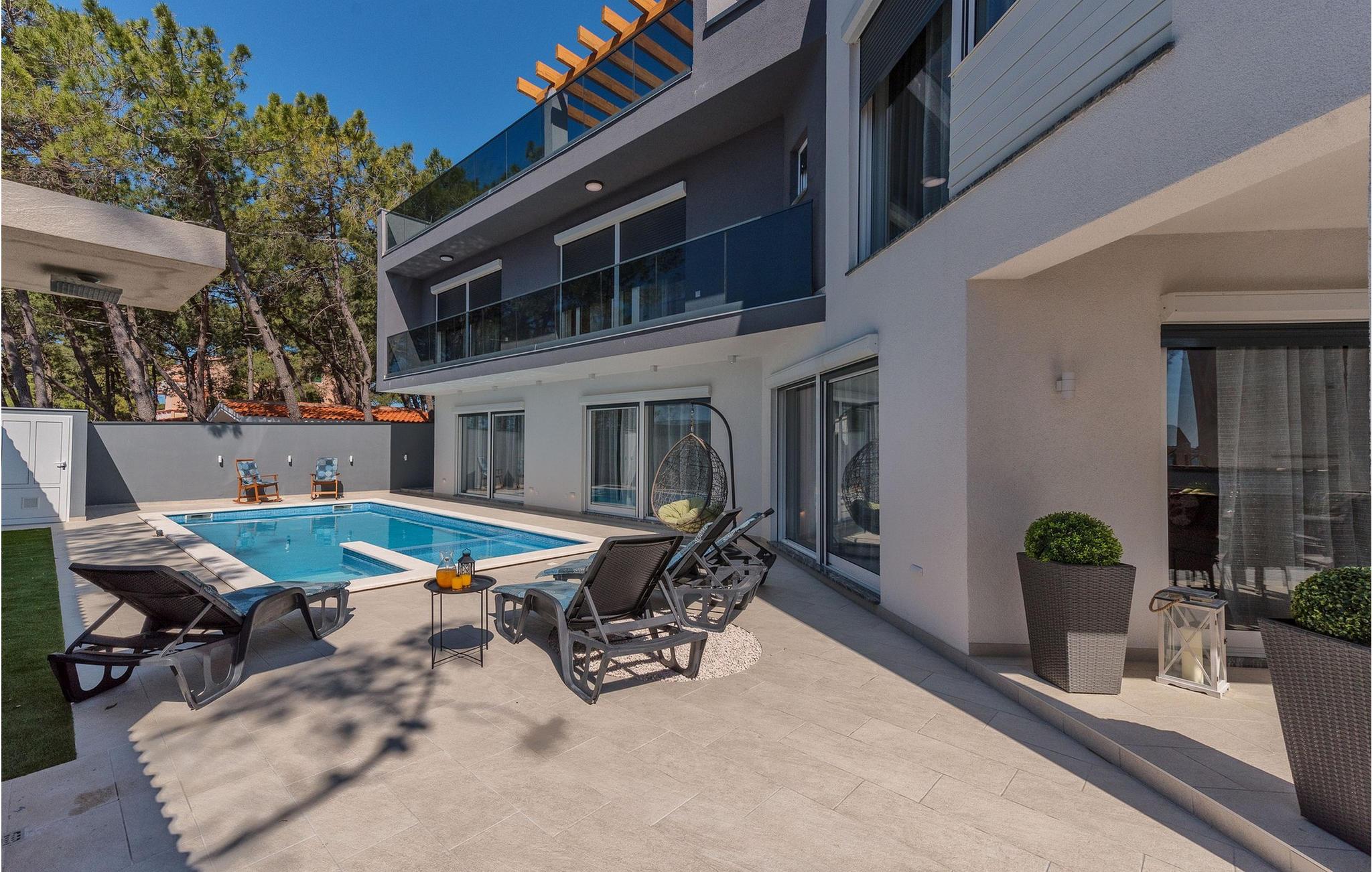 Im Außenbereich der Villa Karlo verschmelzen Entspannung und mediterranes Lebensgefühl zu einem einzigartigen Urlaubserlebnis. Ziehen Sie Ihre Bahnen im eleganten Pool, lassen Sie auf den bequemen Liegen die Sonne auf sich wirken oder genießen Sie erfrischende Drinks im Schatten des modernen Lounge-Bereichs. Auf der großzügigen Terrasse mit Blick auf das Meer erleben Sie unvergessliche Sonnenuntergänge, während Sie gemeinsam essen. Für die jüngsten Gäste sorgt der kleine Spielplatz im Garten für fröhliche Momente, während die Erwachsenen die Ruhe und Privatsphäre dieses stilvollen Rückzugsortes genießen.