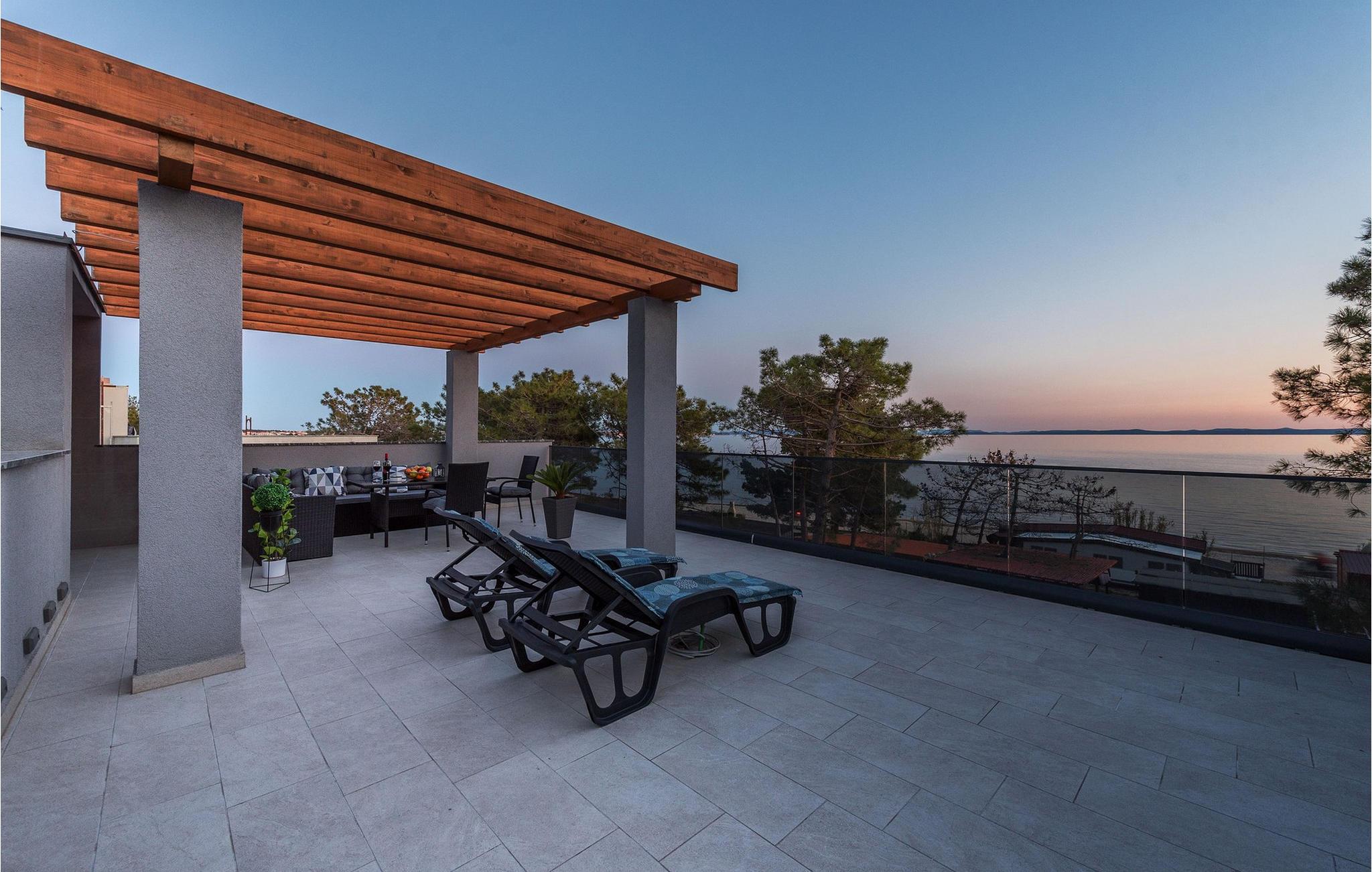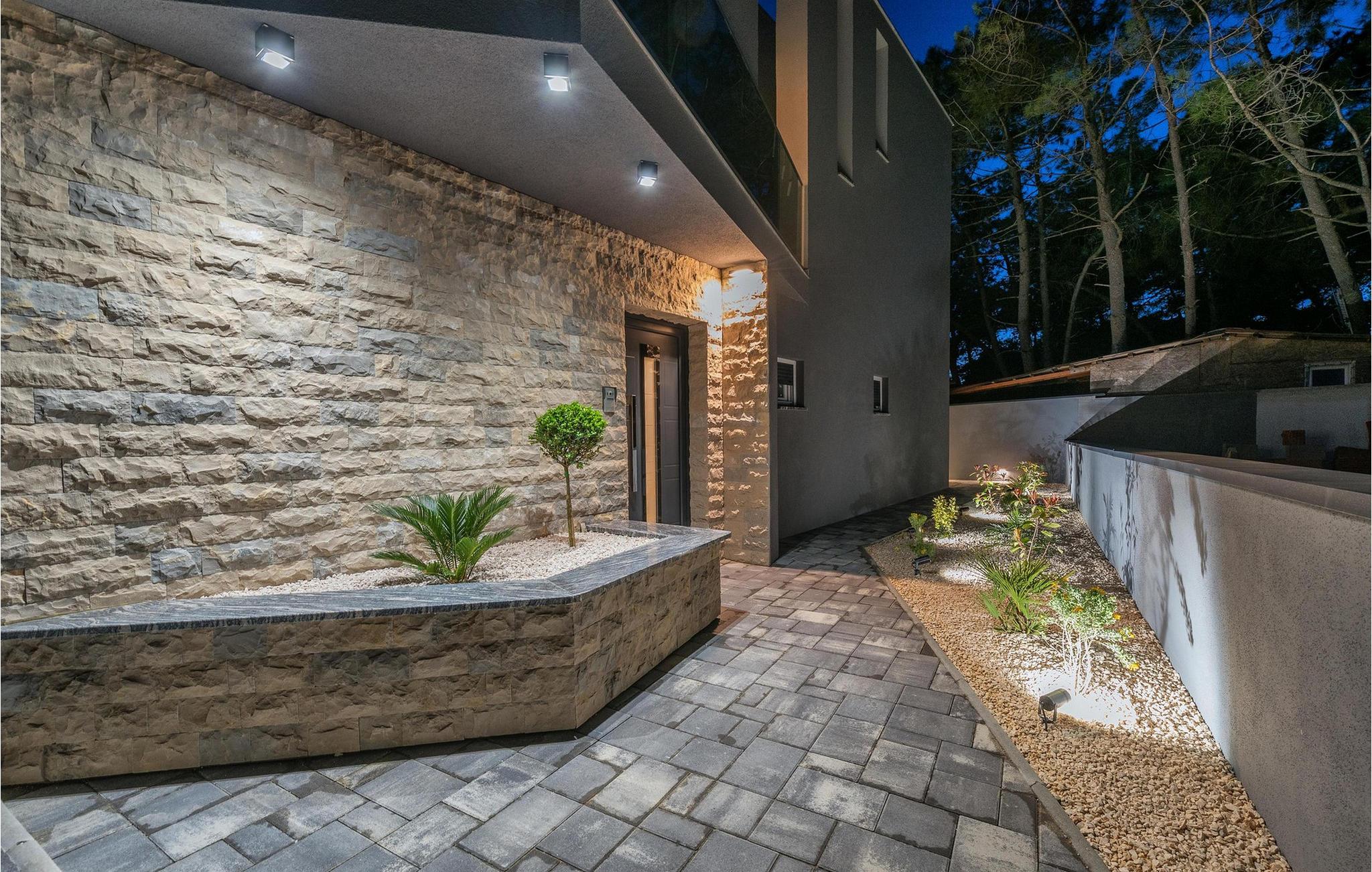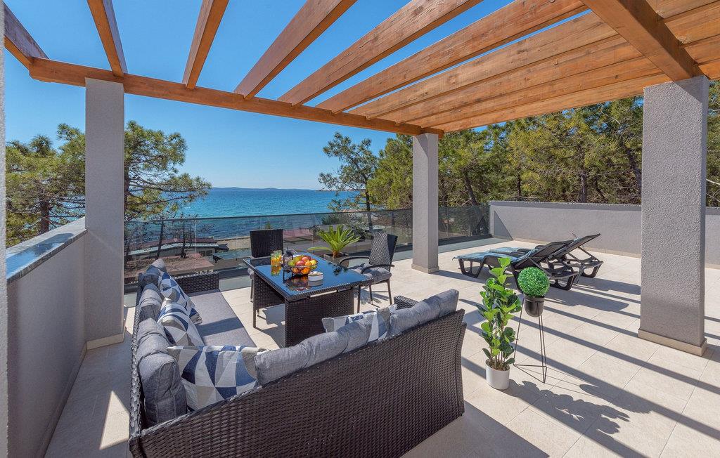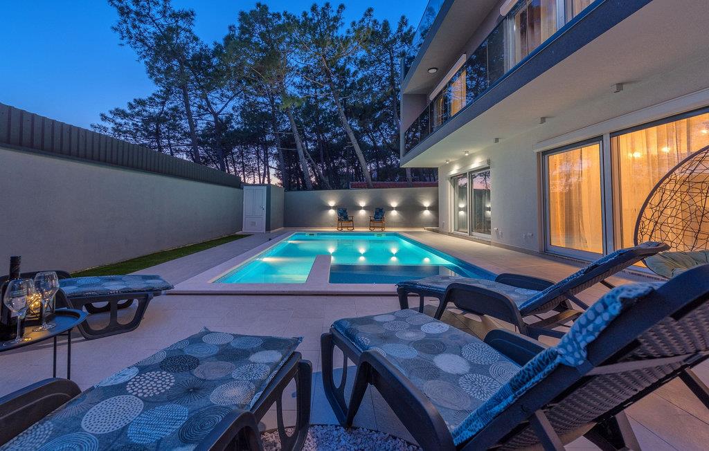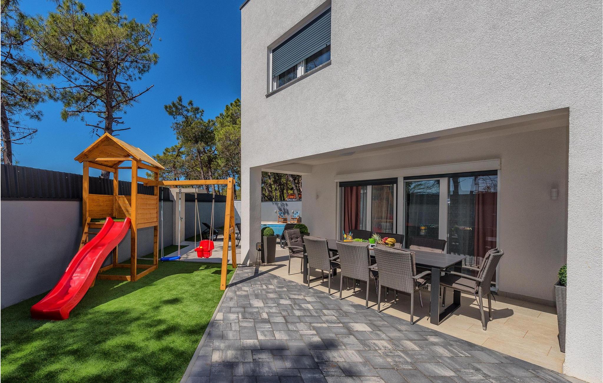 Im Außenbereich der Villa Karlo verschmelzen Entspannung und mediterranes Lebensgefühl zu einem einzigartigen Urlaubserlebnis. Ziehen Sie Ihre Bahnen im eleganten Pool, lassen Sie auf den bequemen Liegen die Sonne auf sich wirken oder genießen Sie erfrischende Drinks im Schatten des modernen Lounge-Bereichs. Auf der großzügigen Terrasse mit Blick auf das Meer erleben Sie unvergessliche Sonnenuntergänge, während Sie gemeinsam essen. Für die jüngsten Gäste sorgt der kleine Spielplatz im Garten für fröhliche Momente, während die Erwachsenen die Ruhe und Privatsphäre dieses stilvollen Rückzugsortes genießen.