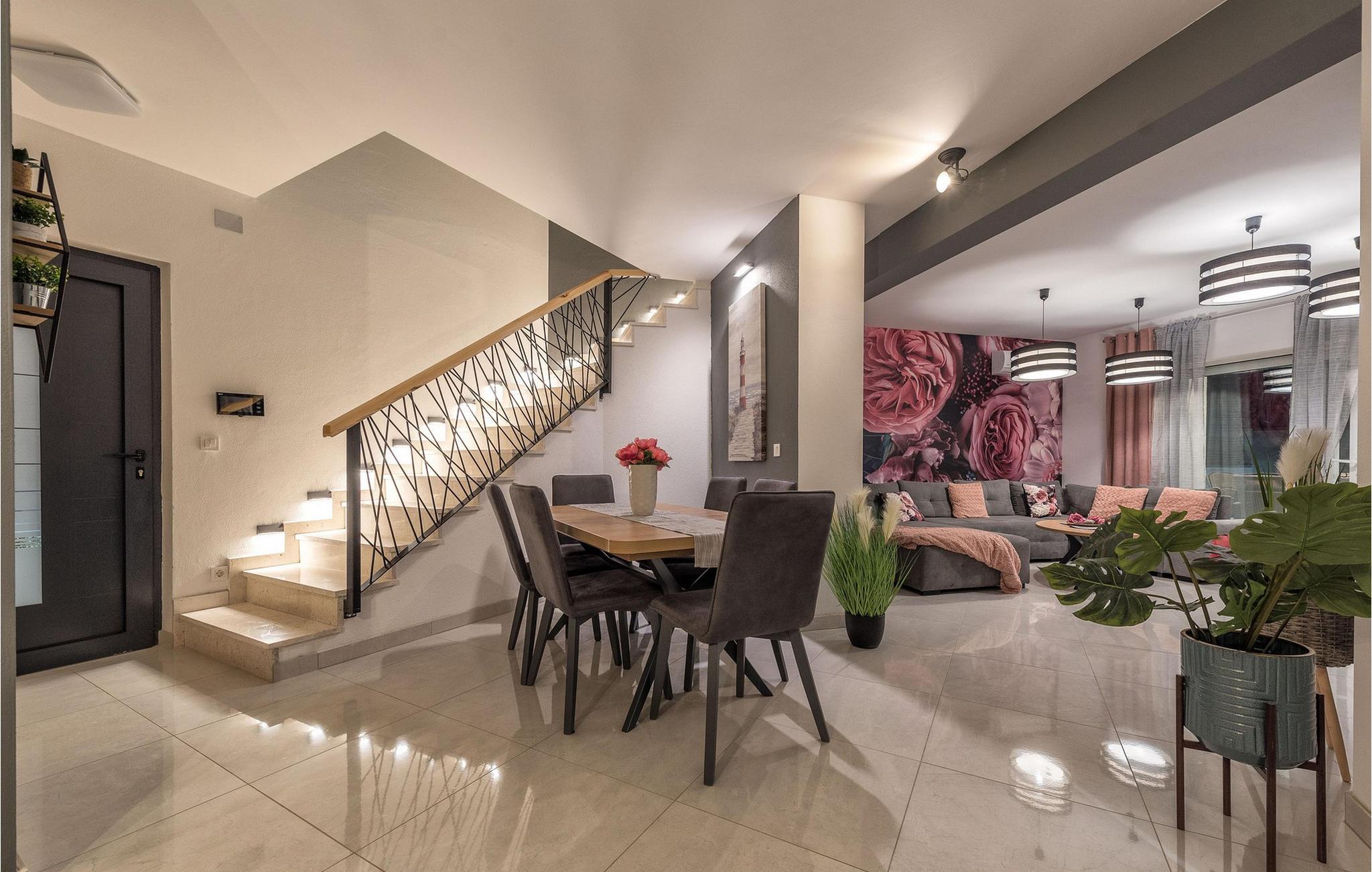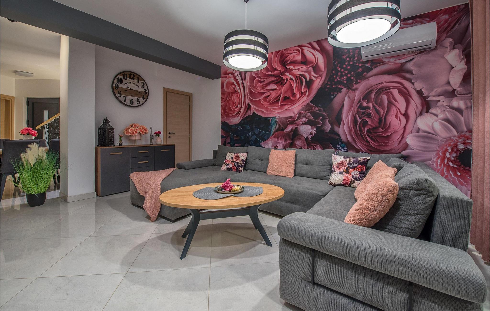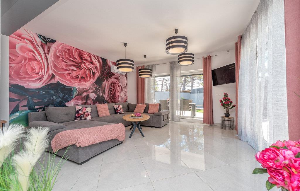 Im Inneren der Villa Karlo sorgt die eindrucksvolle Rosentapete für ein unverwechselbares Ambiente, das dem Wohnbereich eine elegante, fast künstlerische Note verleiht. Die Kombination aus sanften Grautönen, rosafarbenen Akzenten und modernen Leuchten schafft eine warme, einladende Atmosphäre, in der Sie sich sofort wohlfühlen. Lehnen Sie sich auf dem großen Sofa zurück, genießen Sie den Blick in den Garten oder verbringen Sie gesellige Abende bei einem Glas Wein. Die offene Küche mit ihrem edlen Holzdesign und der angrenzende Essbereich laden dazu ein, gemeinsam zu kochen, lange Gespräche zu führen und den Urlaub in vollen Zügen zu genießen.