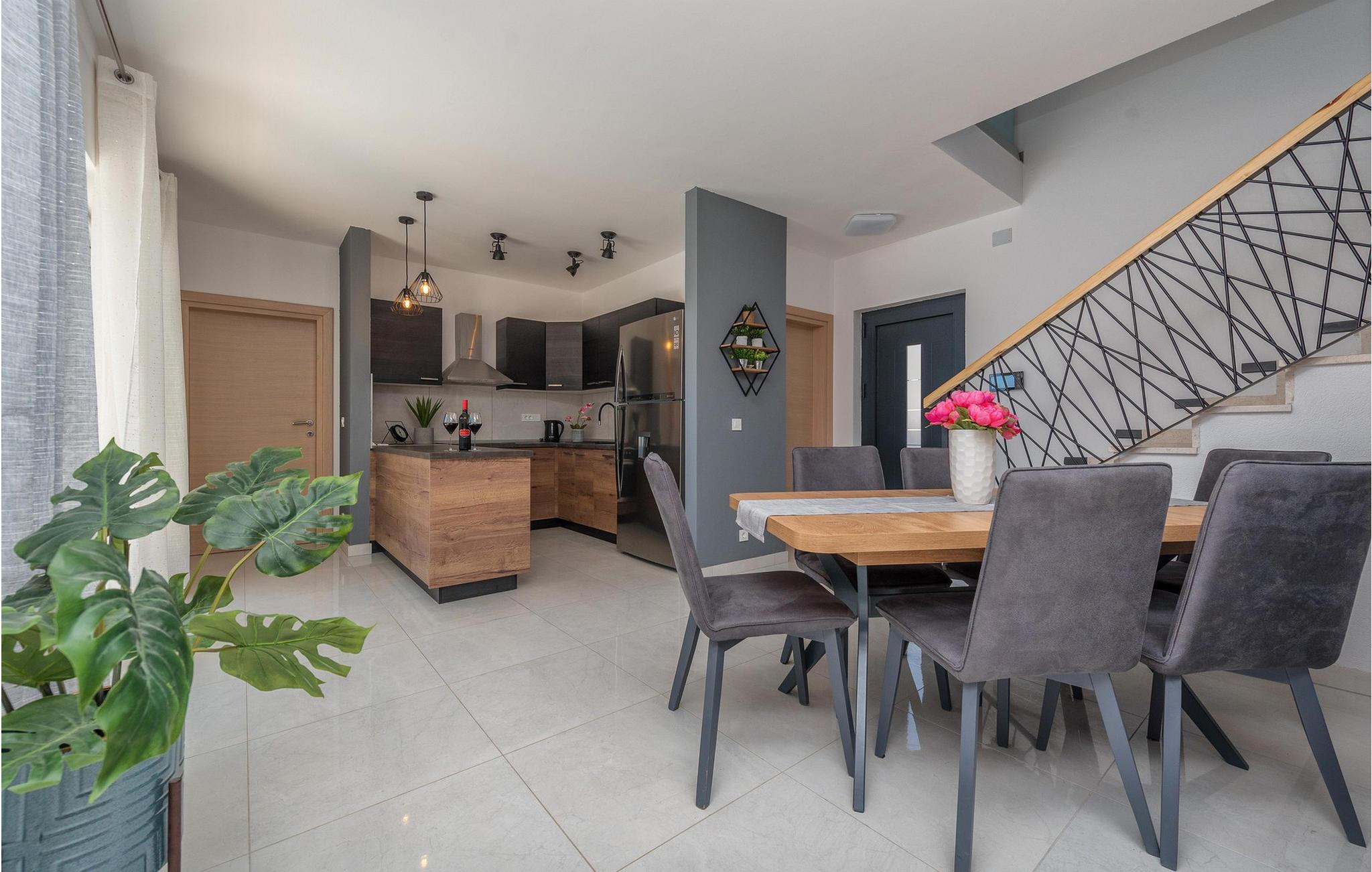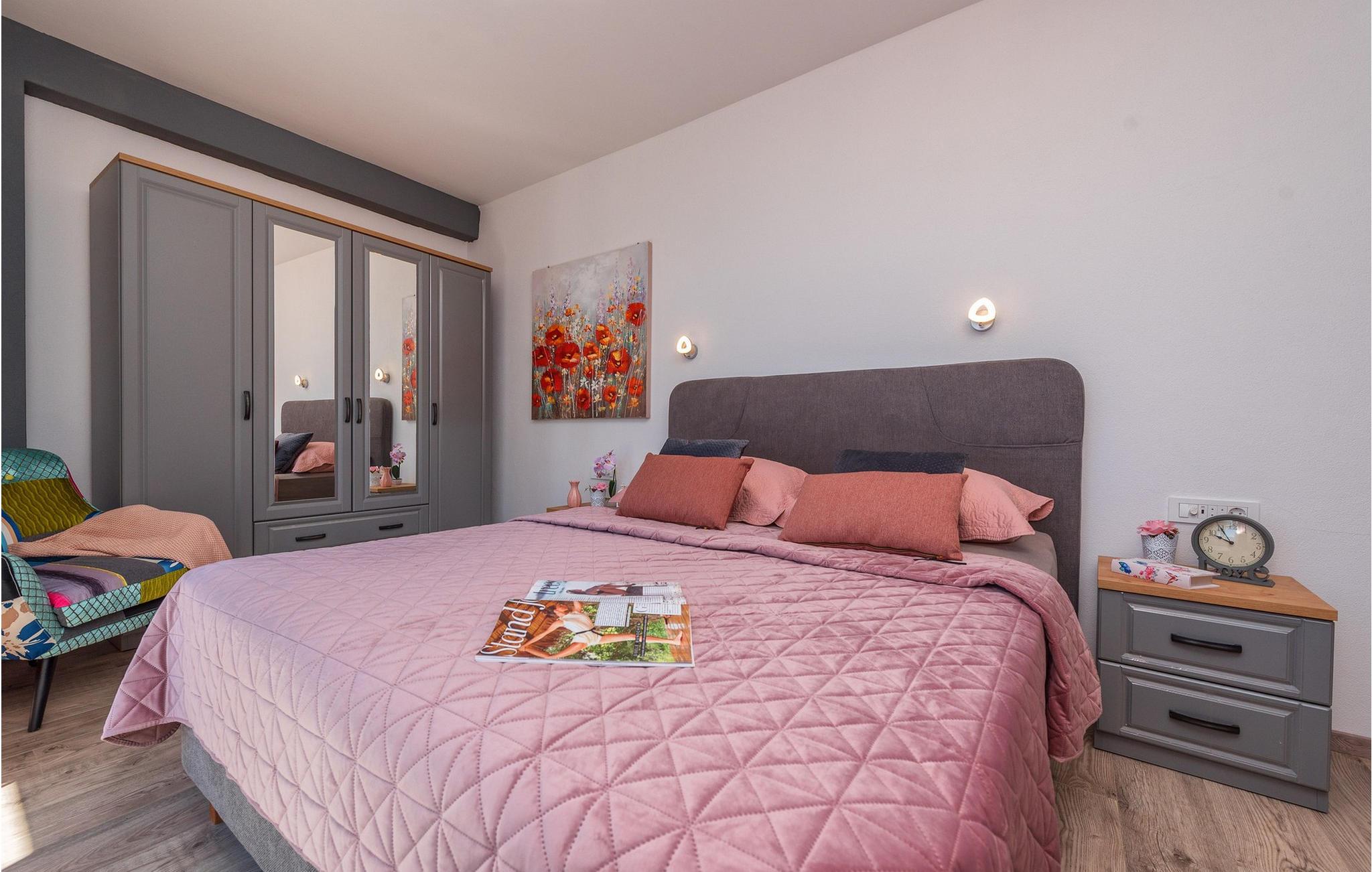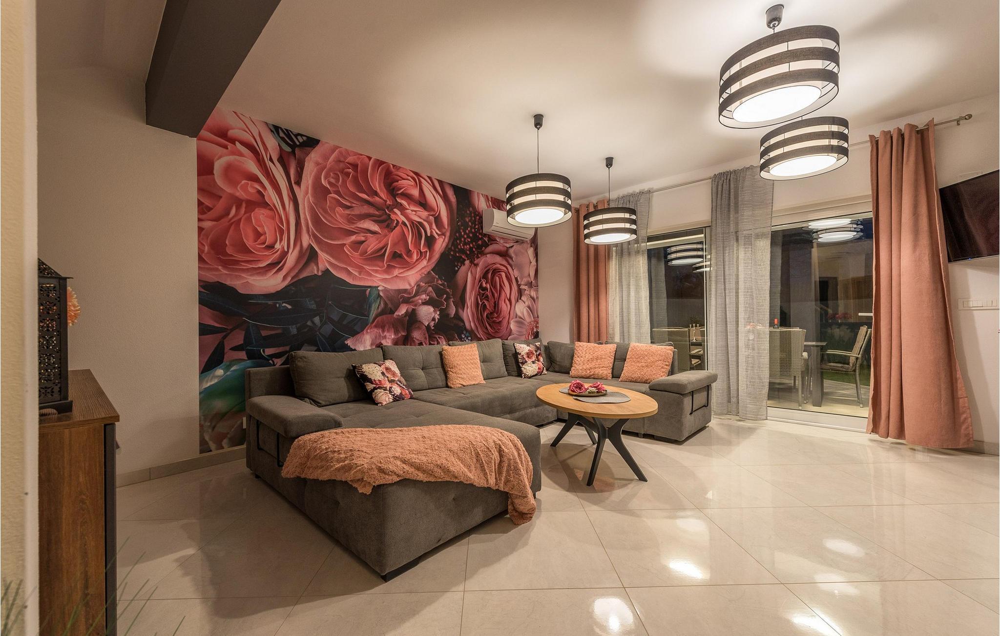 Im Inneren der Villa Karlo sorgt die eindrucksvolle Rosentapete für ein unverwechselbares Ambiente, das dem Wohnbereich eine elegante, fast künstlerische Note verleiht. Die Kombination aus sanften Grautönen, rosafarbenen Akzenten und modernen Leuchten schafft eine warme, einladende Atmosphäre, in der Sie sich sofort wohlfühlen. Lehnen Sie sich auf dem großen Sofa zurück, genießen Sie den Blick in den Garten oder verbringen Sie gesellige Abende bei einem Glas Wein. Die offene Küche mit ihrem edlen Holzdesign und der angrenzende Essbereich laden dazu ein, gemeinsam zu kochen, lange Gespräche zu führen und den Urlaub in vollen Zügen zu genießen.