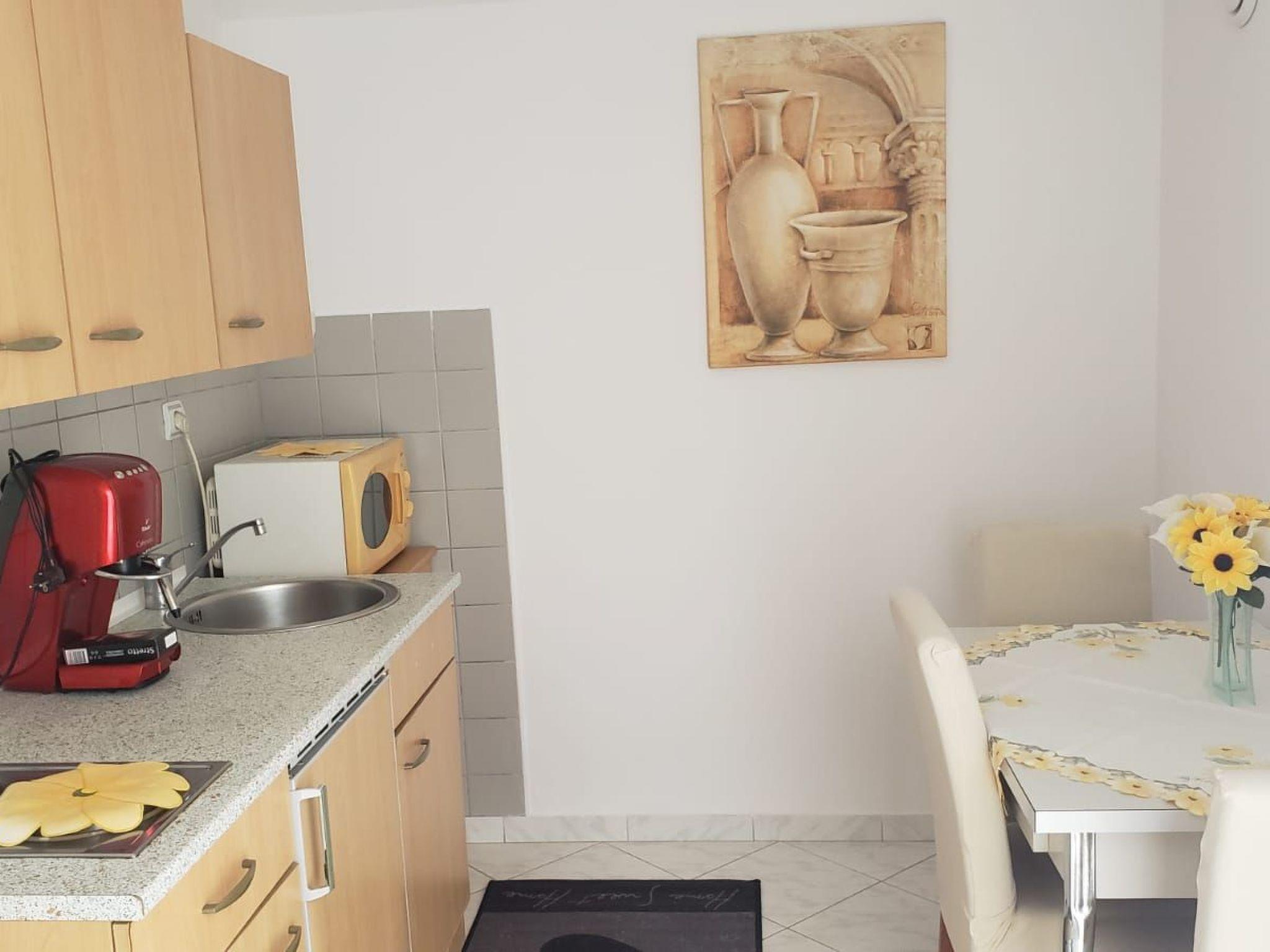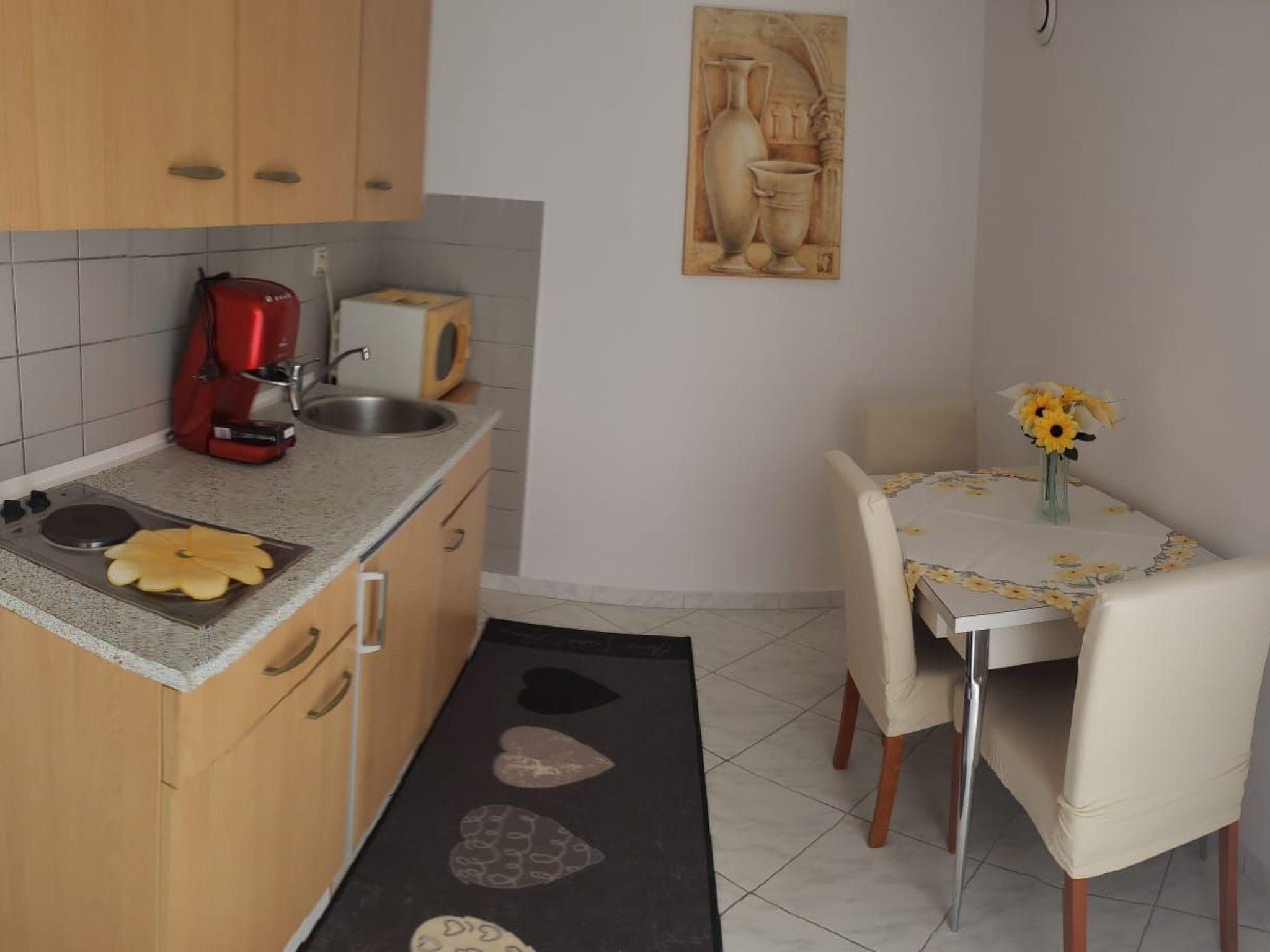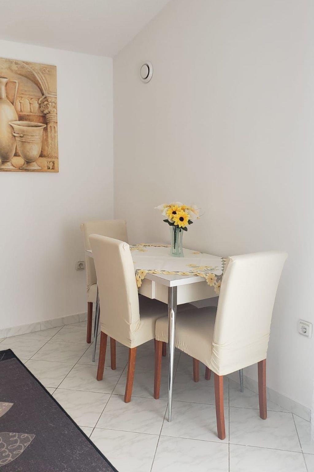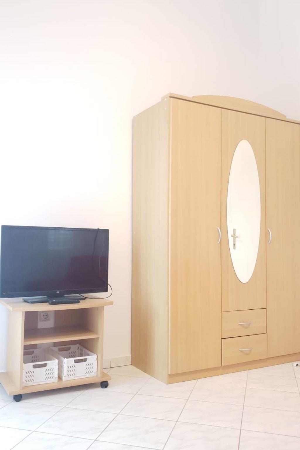 Diese Ferienwohnung unterteilt sich in ein Schlafzimmer, eine Wohnküche und ein Badezimmer. Das Schlafzimmer bietet Ihnen ein Doppelbett (140 cm x 200 cm), das von zwei beidseitigen Nachttischen mit Leselampen umgeben ist. Neben dem Bett finden Sie Entspannung auf einer ausziehbaren Couch am Abend. Die Couch eignet sich im ausgezogenen Zustand ideal für zwei Kinder. Der Fernseher mit Sat.-TV sorgt am Abend für Unterhaltung und die Klimaanlage für eine angenehme Raumtemperatur. Die Wohnküche bietet Ihnen zwei Kochplatten, einen Kühlschrank, eine Mikrowelle und eine Kaffeemaschine zu Ihrer unkomplizierten Selbstversorgung. In der Wohnküche und auf dem Balkon nehmen Sie an einem Esstisch mit vier Stühlen zu gemeinsamen Speisen Platz. Das Tageslichtduschbad verfügt über eine Duschkabine mit Duschvorhang, ein WC, ein Handwaschbecken und ein Badezimmerfenster.