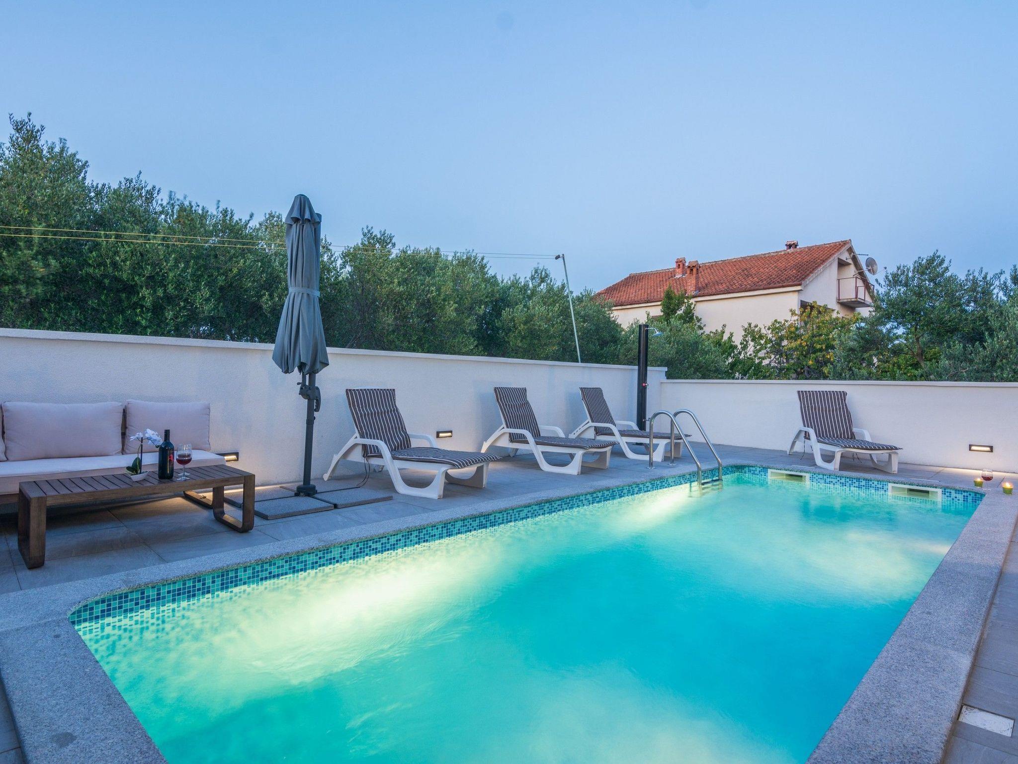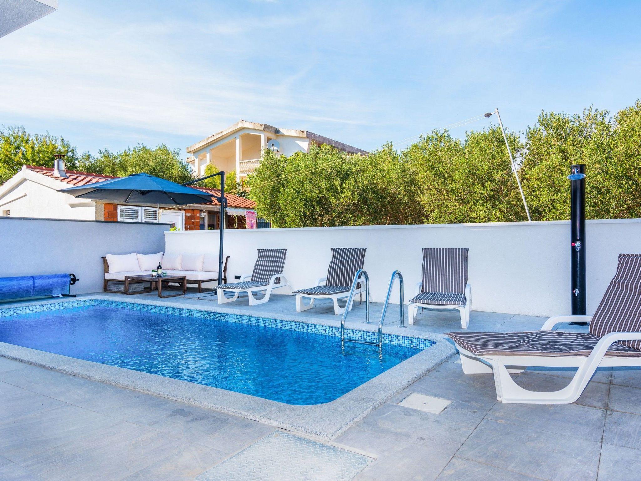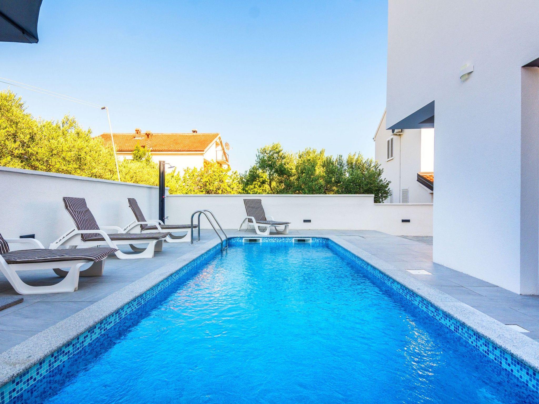 Der Ferienwohnung nur 400 m von Strand Jadro entfernt teilt sich auf ein Wohnbereich und Esszimmer mit voll ausgestattet Küche, Doppelzimmer mit Doppelbett, Schlafzimmer mit zwei getrennten Betten, ein Badezimmer mit Dusche und 50 m² und eine überdachte und möblierte Terrasse. Im Wohnzimmer gibt es ein Schlafsofa für zwei weitere Personen. Parkplatz auf dem Grundstück, Klimaanlage, SAT-TV, Internet per WLAN, Waschmaschine, Geschirrspüler, Kinderbett und Hochstuhl zählen zu den weiteren Ausstattungsmerkmalen. Zu die Wohnung gehört ein privater beheizter Swimmingpool von 27m2 (6m lang, 3m breit und 1,5m tief) mit Liegestühlen und Sonnenschirme für private Nutzung ebenso eine überdachte und möblierte Dachterrasse mit Außenküche und Außentoilette. Dieser beliebter Kieselstrand Jadro mit zahlreichen Freizeit- und Unterhaltungsprogrammen für Kinder und Erwachsene ist eine Promenade entlang die Küste. Ideal für entspannende Abendspaziergänge. Nur 200 m vom Haus entfernt befinden sich ein Restaurant und nur 150 m vom Haus entfernt blendet sich das Zentrum der Insel Vir und ein Einkaufsladen.