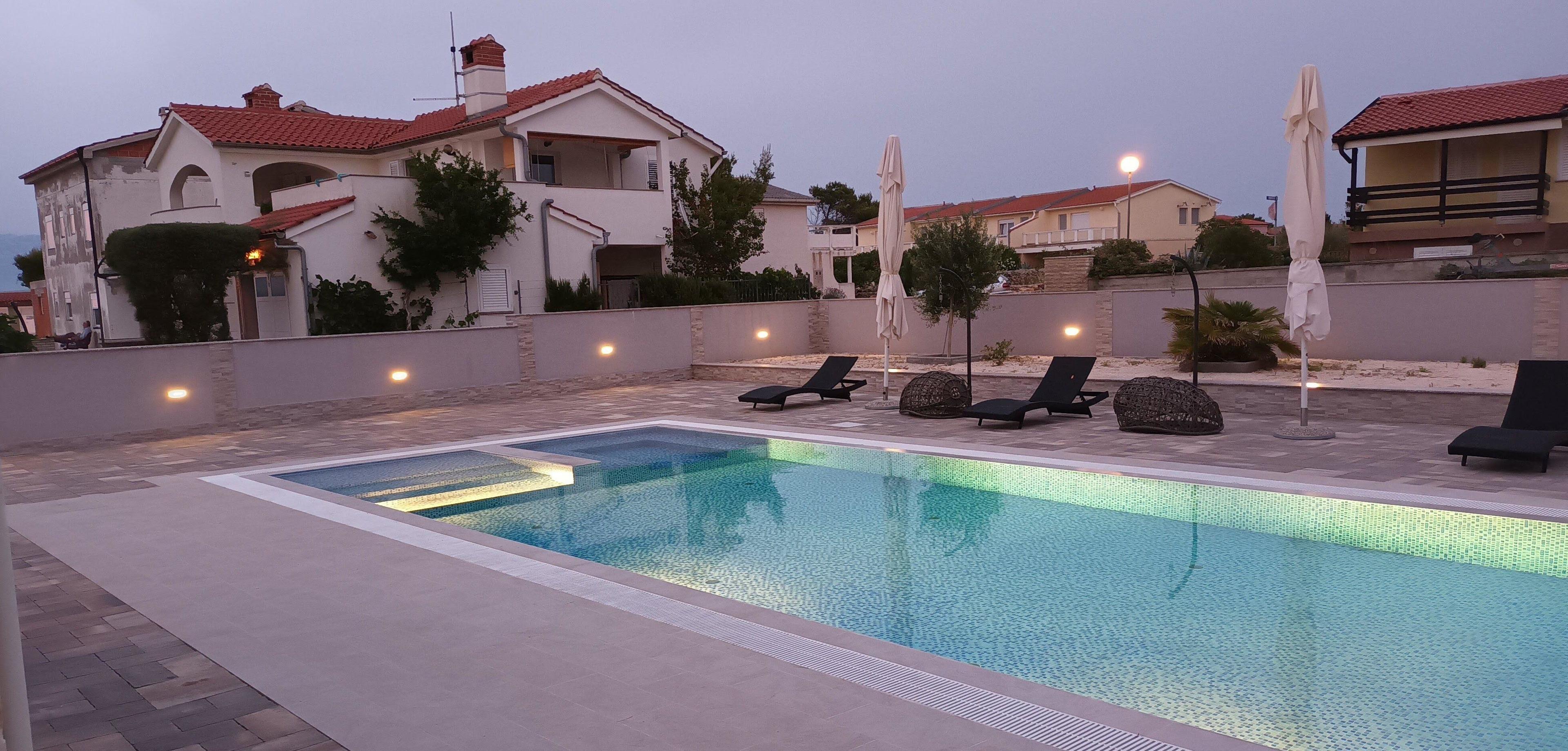 Auf dem ummauerten, abgeschlossenen Grundstück von einer Grösse vom 690 qm, befindet sich der 65 qm grosse, 1,5m tiefe, beheizbare Swimmingpool mit Massagedüsen und Wasserfall, sowie einer Aussendusche. Ebenfalls ein Grill, sowie Sitz- und Liegegelegenheiten, und ausreichen Sonnenschirmen.