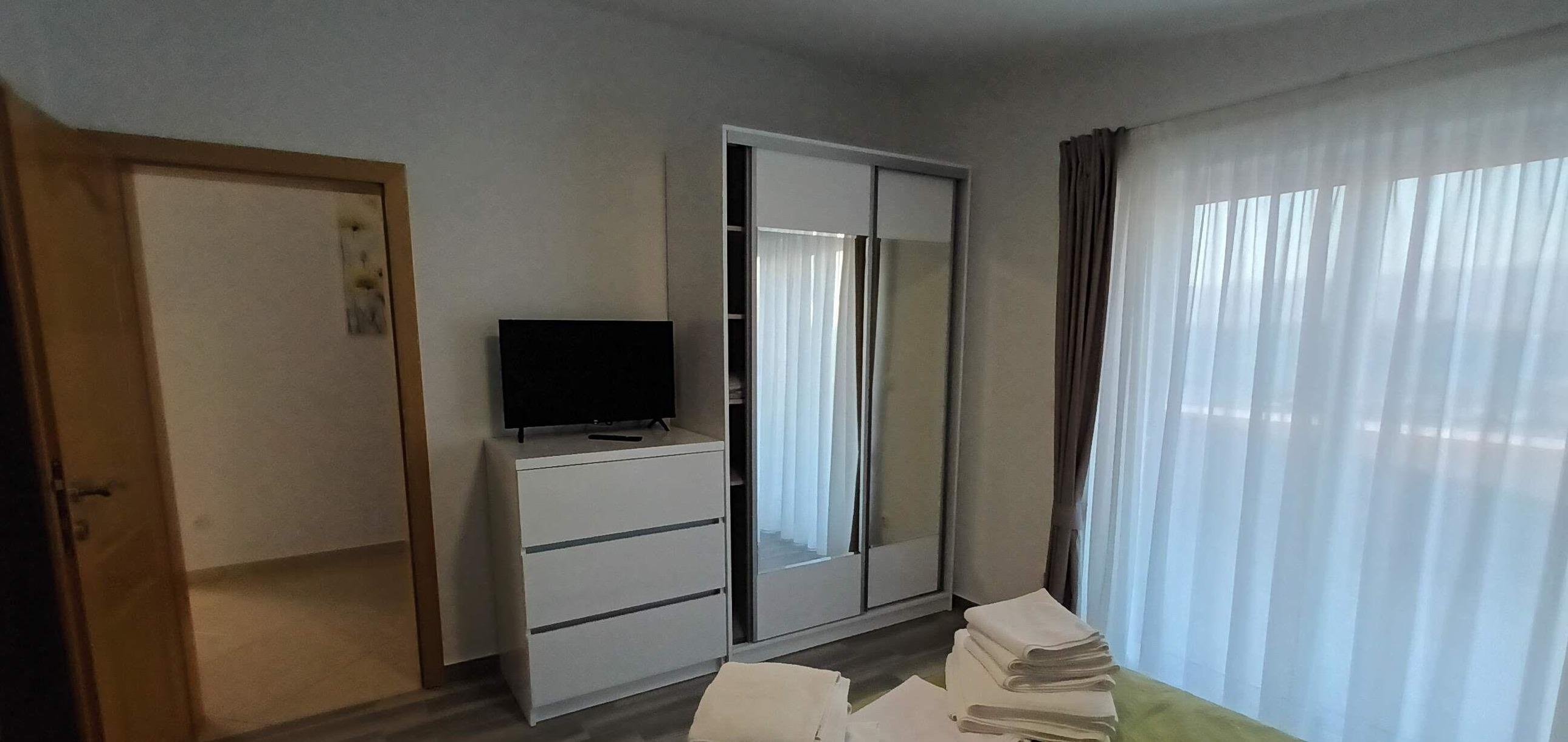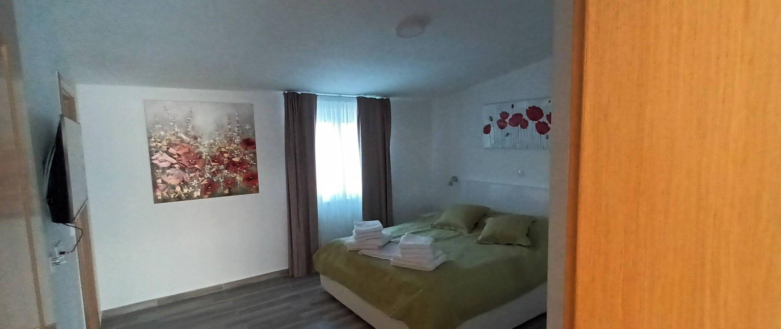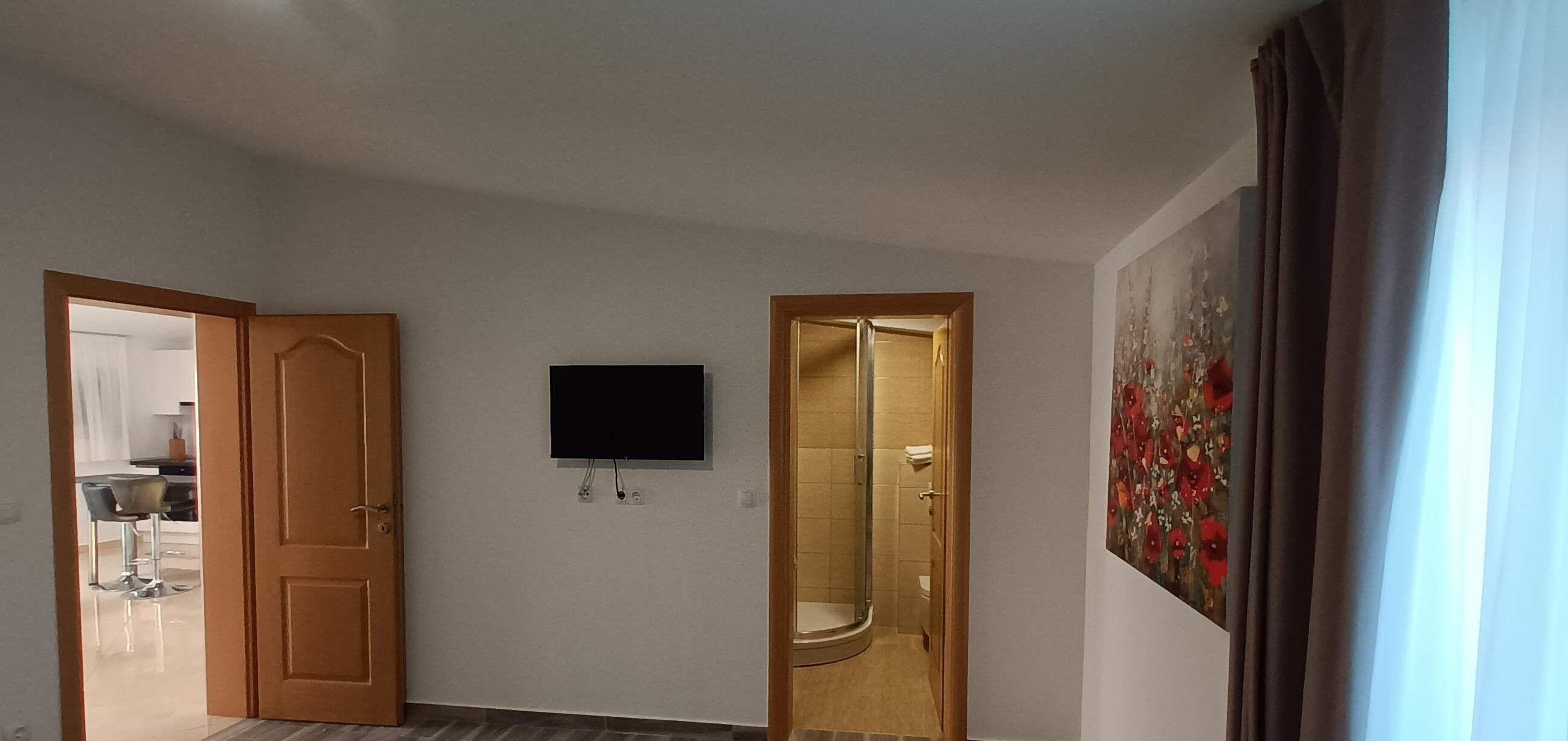 Ein kleinerer Teil der Villa ist als Studio mit einem Schlafzimmer mit Doppelbett, einem Schlafsofa, sowie Küchenzeile mit Kühlschrank, Cerankochfeld und einem Badezimmer ausgestattet
