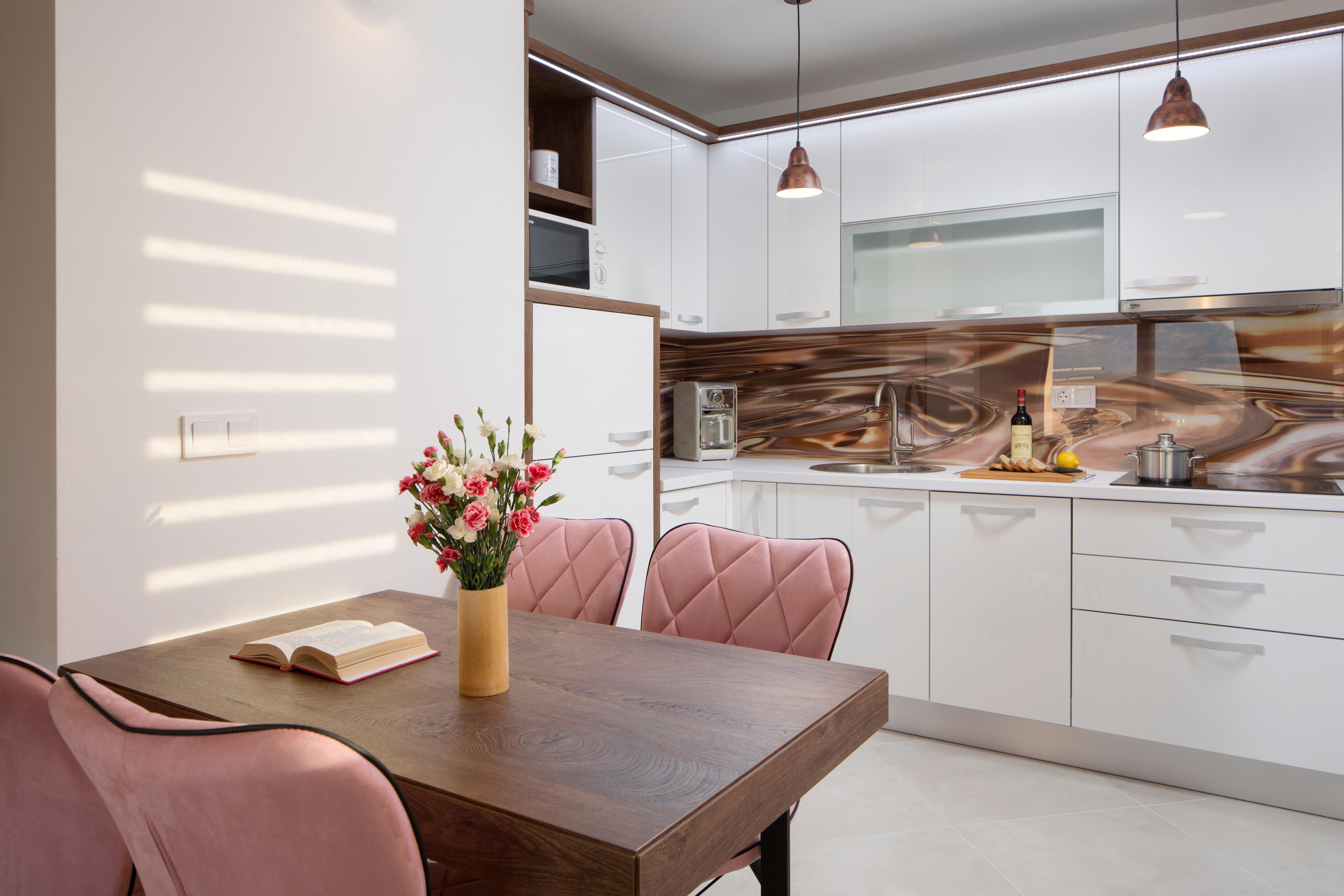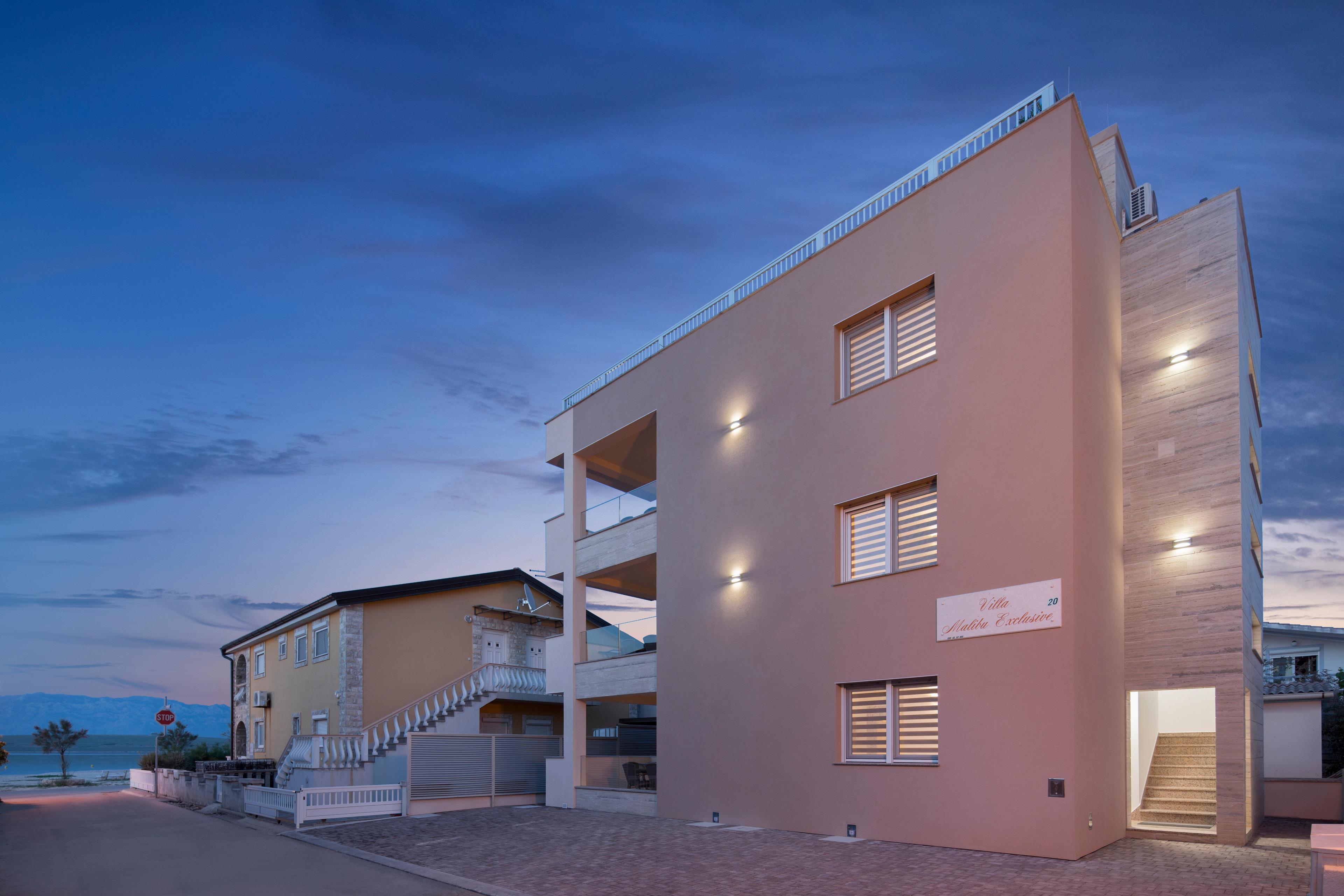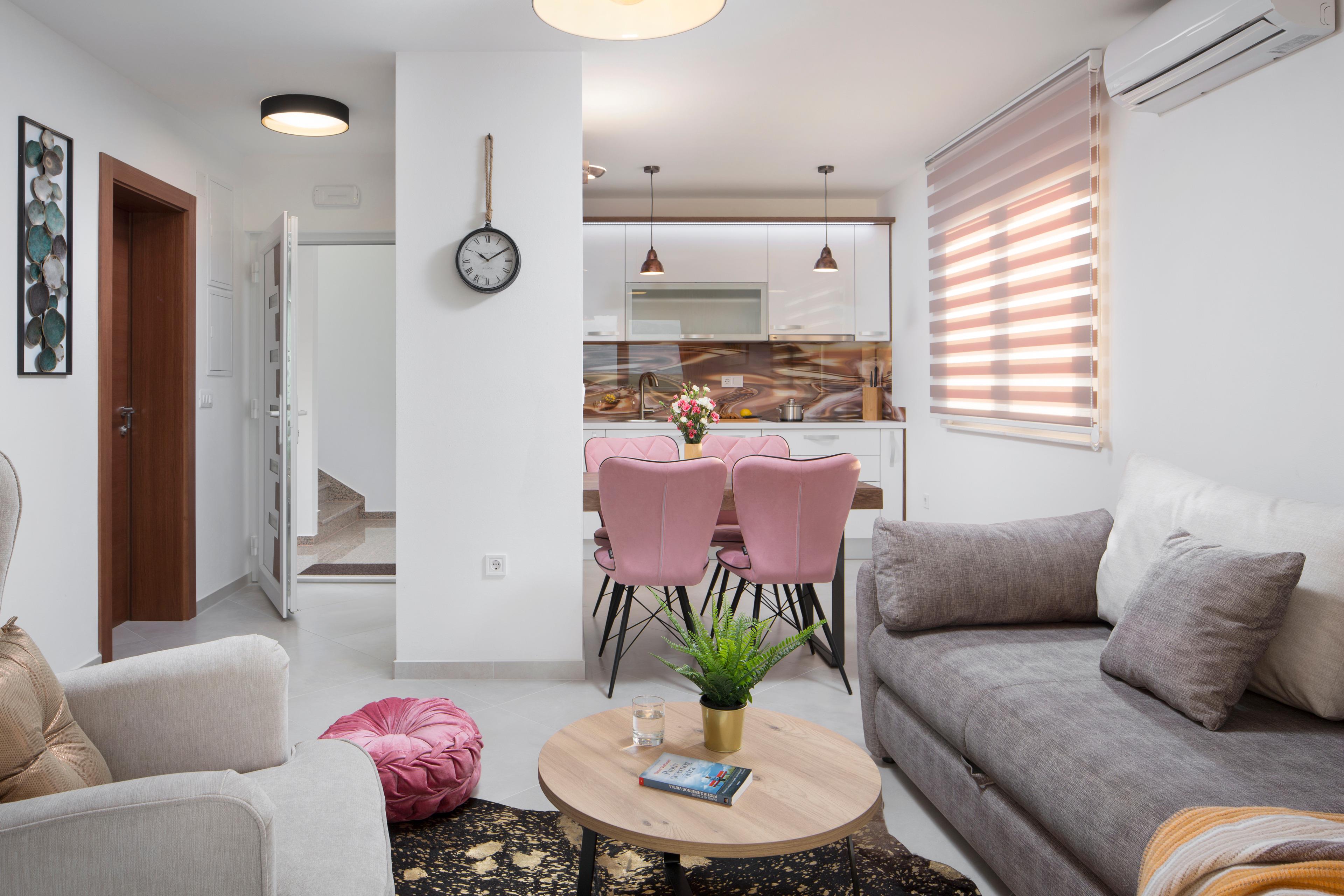 Die 63 m² Ferienunterkunft im dritten Stock des Hauses teilt sich auf ein Wohn- /Essbereich mit voll ausgestatteter Küche, zwei Schlafzimmern mit Doppelbett und ein Badezimmer mit Duschkabine. Zur Wohnung gehört eine 9 m² überdachte Balkon mit Tisch und Stühlen und mit Meerblick. Zu den weiteren Annehmlichkeiten gehören Waschmaschine, Geschirrspüler, Klimaanlage, Internet per WLAN, Sat-TV, Safe und Parkplatz auf dem Grundstück. Ein gemeinsamer Balkon und Lounge Bereich (85 m²) auf dem Dach des Hauses (3. Stock) mit Grill Pavillon, Sitzgarnitur, Liegestühlen und einem atemberaubenden Meerblick ist ein idealer Ort, um dem Alltag in den abendlichen Sonnenuntergang Atmosphäre zu entkommen. Am nahegelegenen Kiesstrand Lucica mit kristallklarem Meer können Sie Sonnenbaden, Schwimmen und Tauchen. Entlang der Küste erstreckt sich eine 7 km lange Promenade. Für diejenigen, die einen mehr aktiven Ferienurlaub bevorzugen, ist diese Promenade ideal für schnelles Gehen oder Laufen. Shops und Restaurants sind nur wenige Gehminuten entfernt.