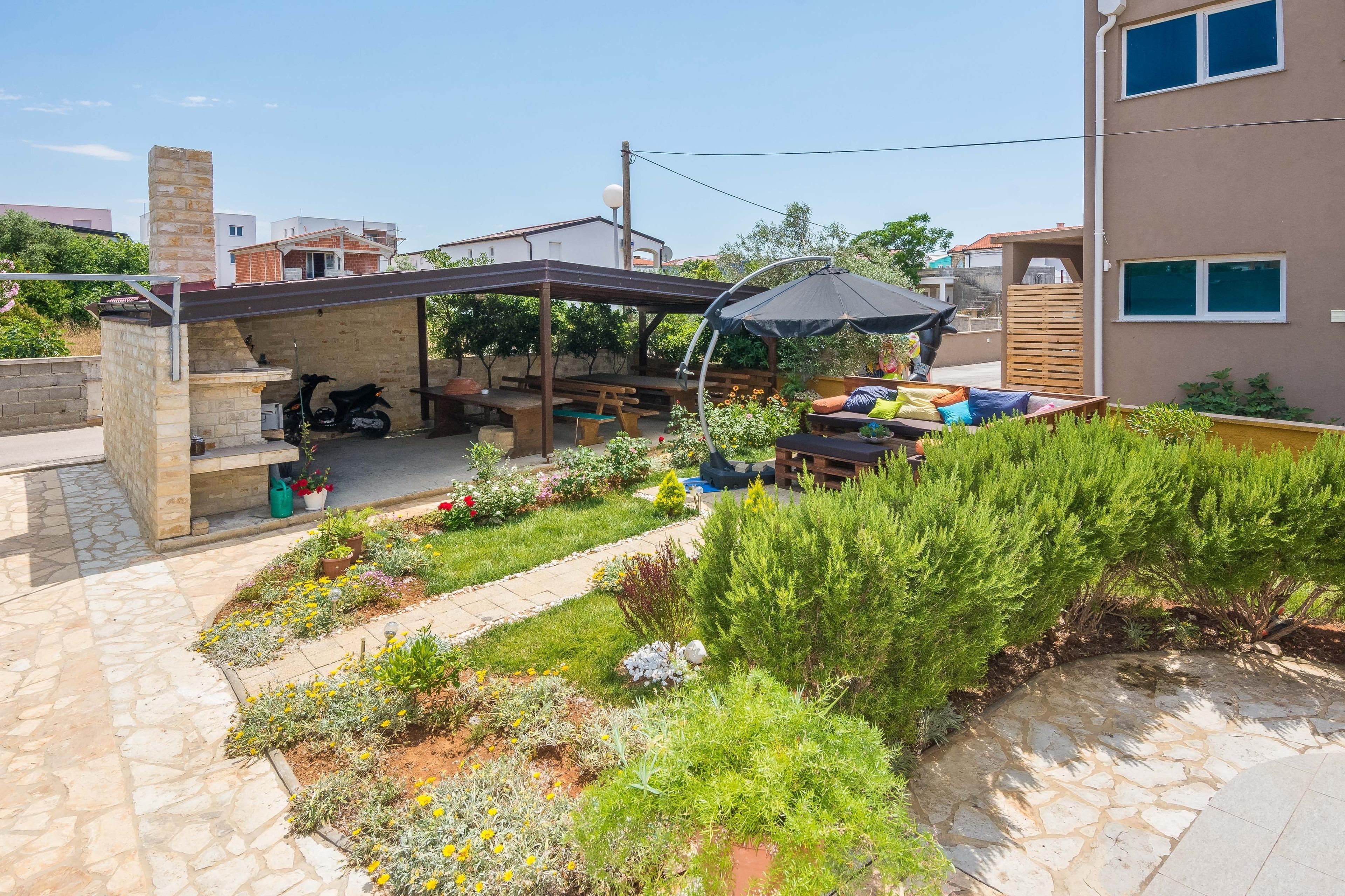 Der Balkon ist 10 m² groß, überdacht und möbliert. Im Wohnbereich ist eine zusätzliche Schlafcouch für zwei Personen. Einkaufsmöglichkeiten und Restaurants erreichen Sie innerhalb weniger Gehminuten. Ungefähr 150 m vom Haus entfernt erwarten Sie schöne Kieselstrände und betonierte Liegeflächen, die zum Sonnenbaden einladen.