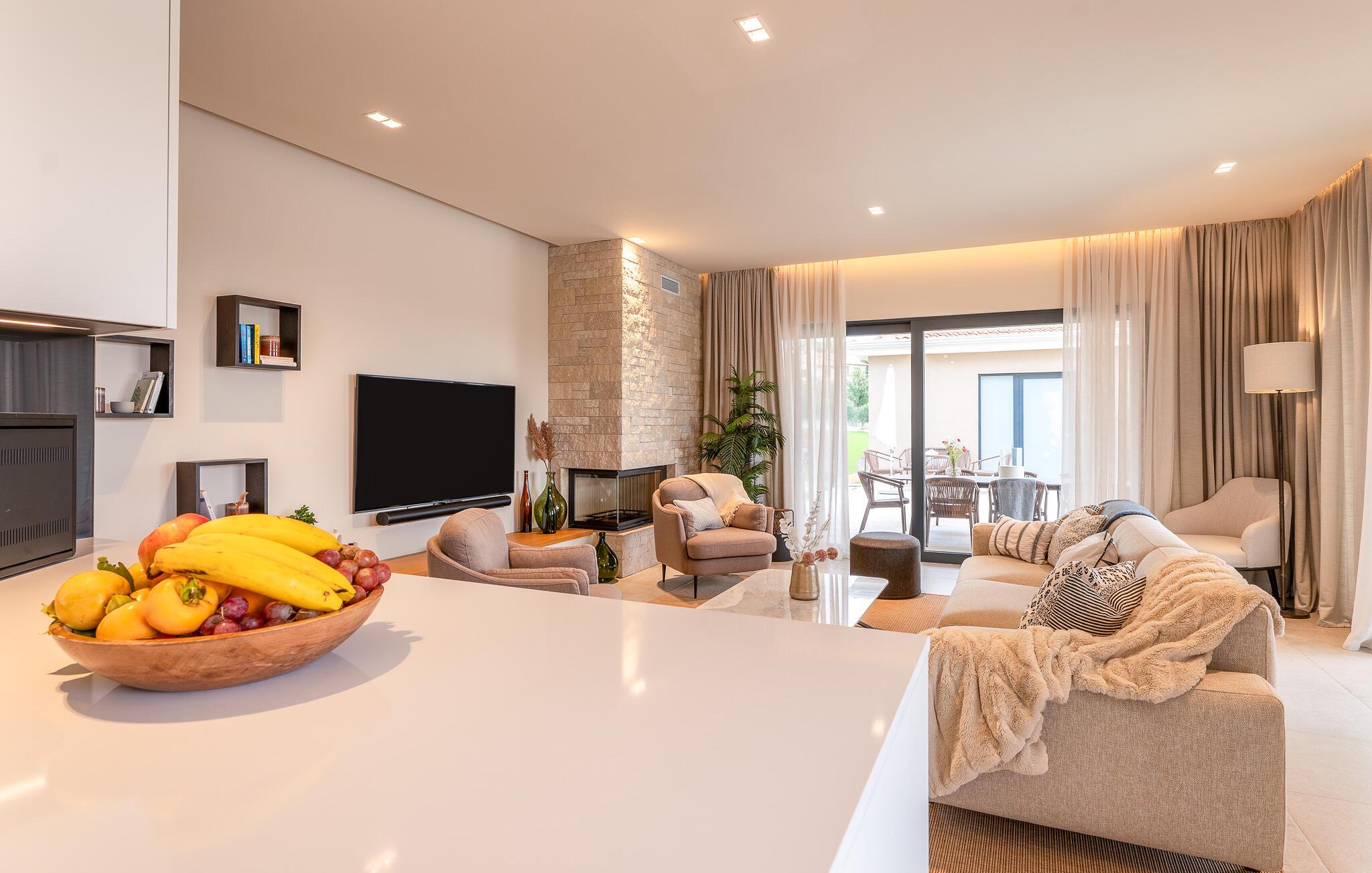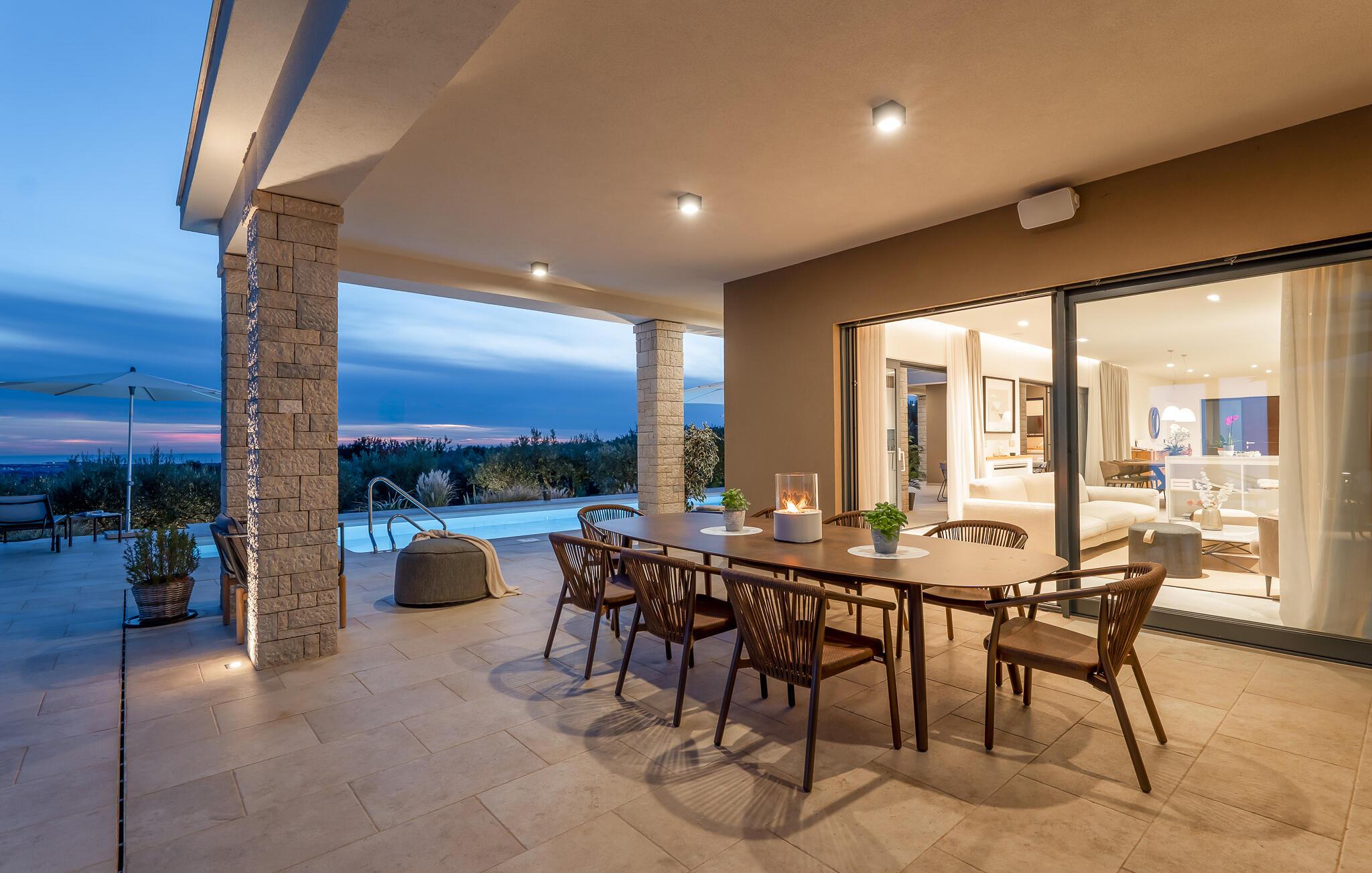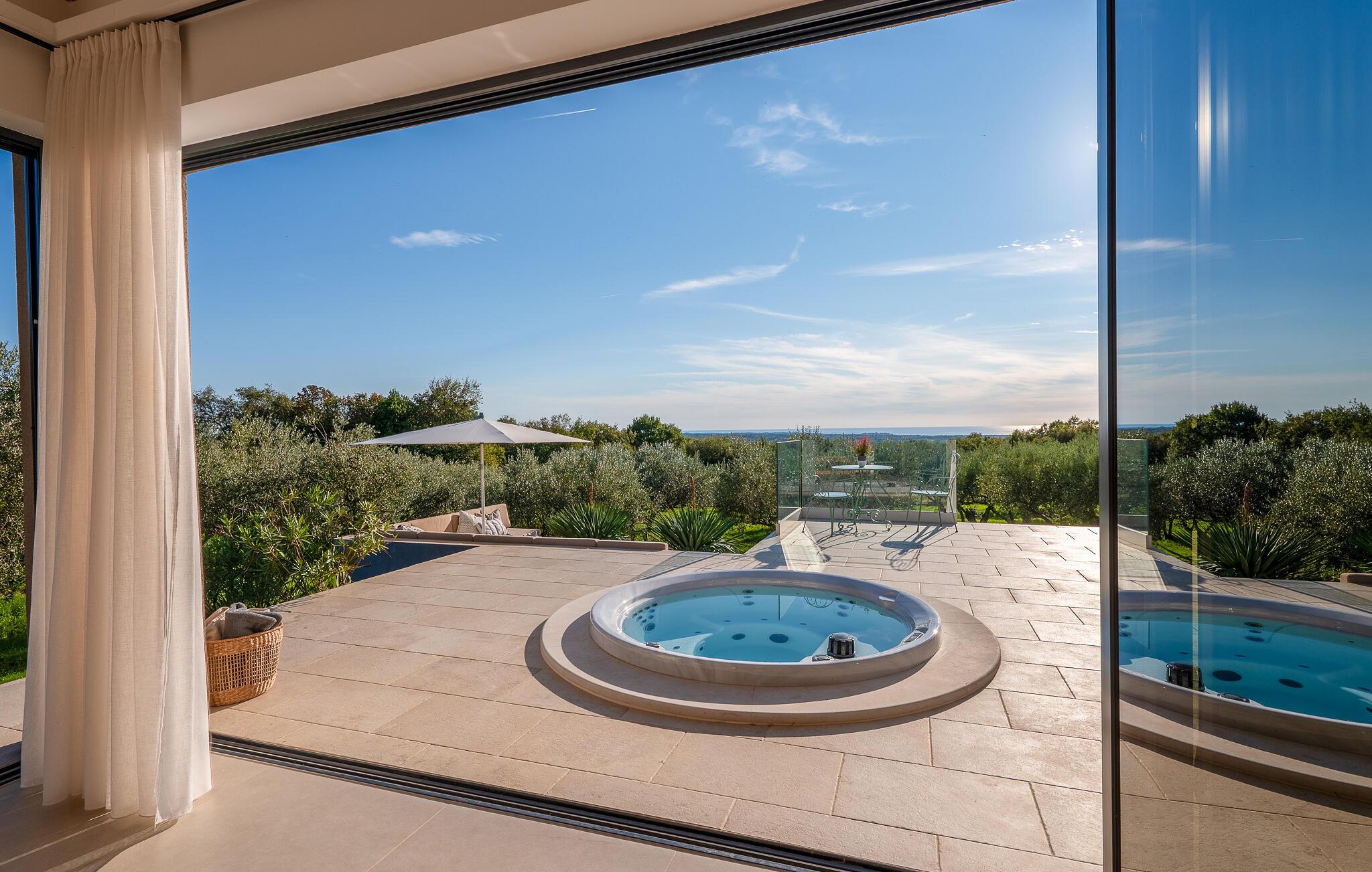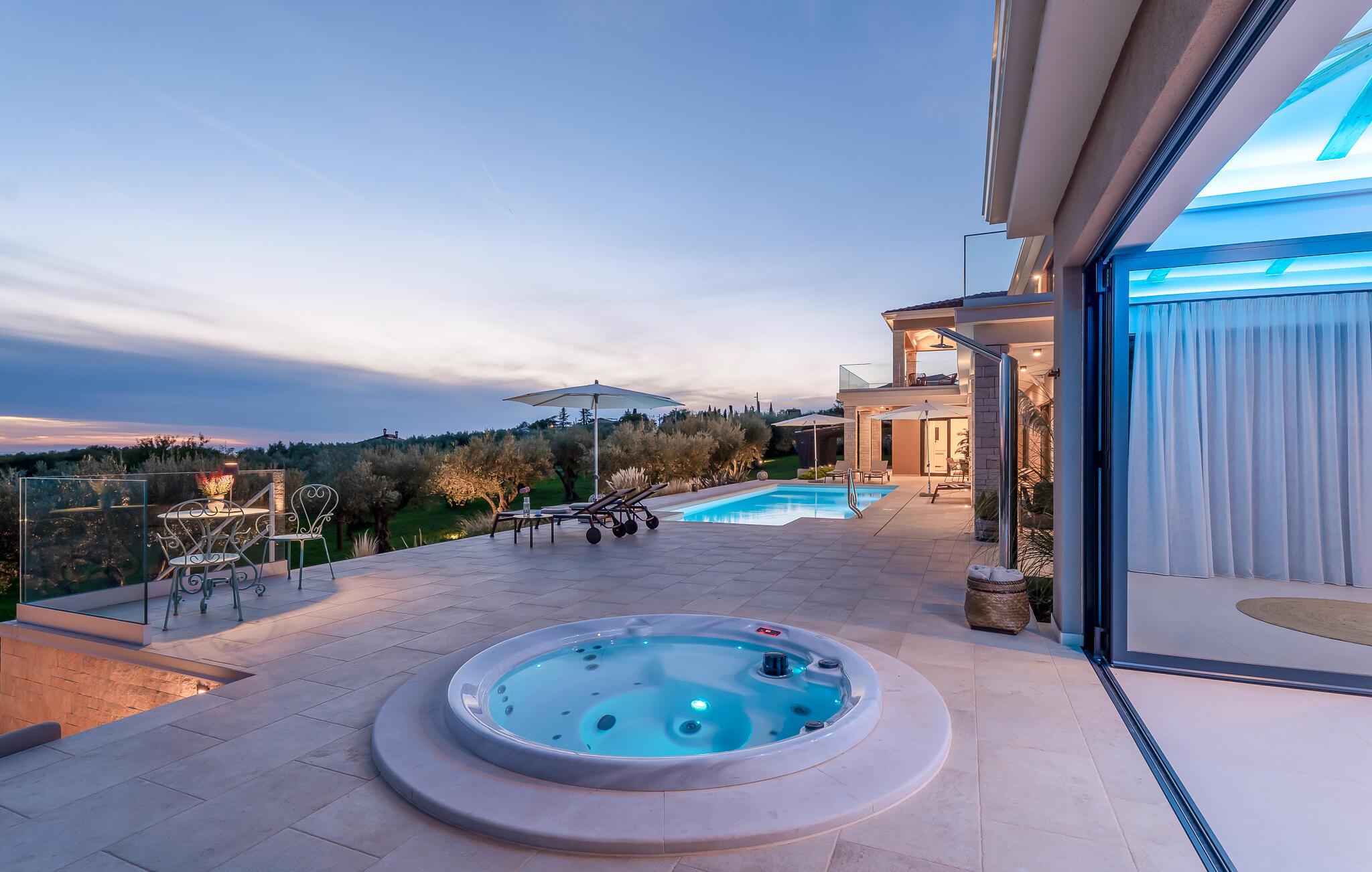 Die Highlights, wie der private Pool und der Außenwhirlpool werden nur noch durch eine fantastische Panoramaaussicht über den privaten Olivenhain hinweg getoppt. Der nächste Strand ist nur eine kurze Autofahrt von der Villa entfernt.