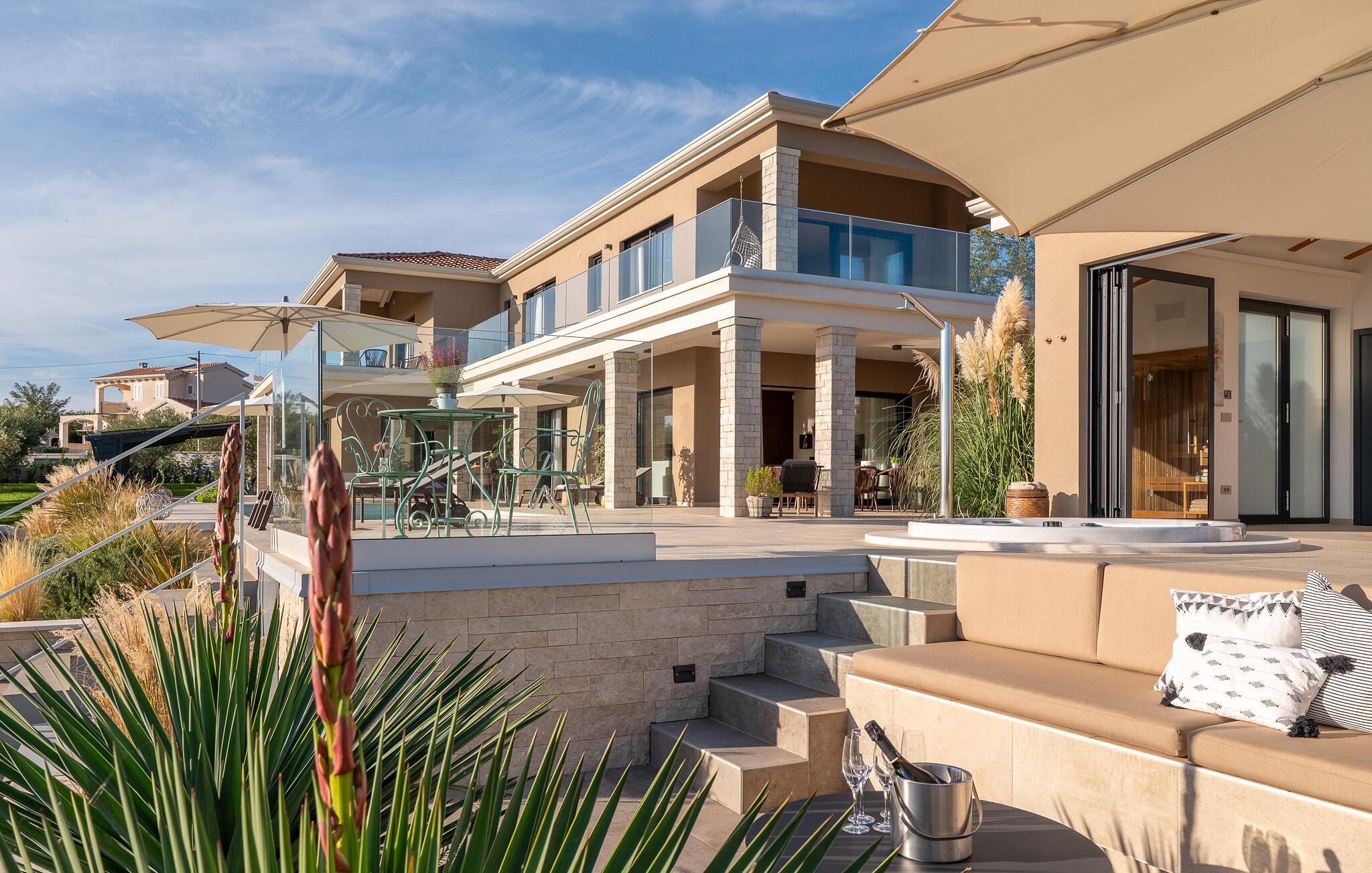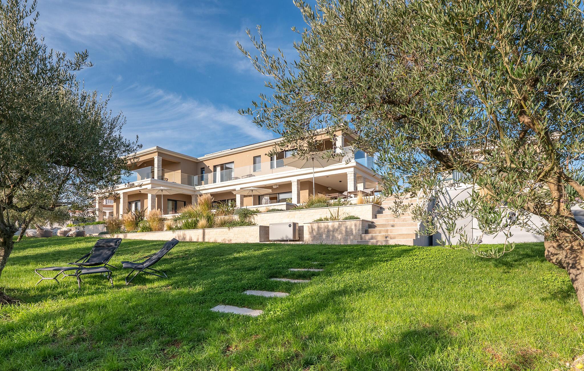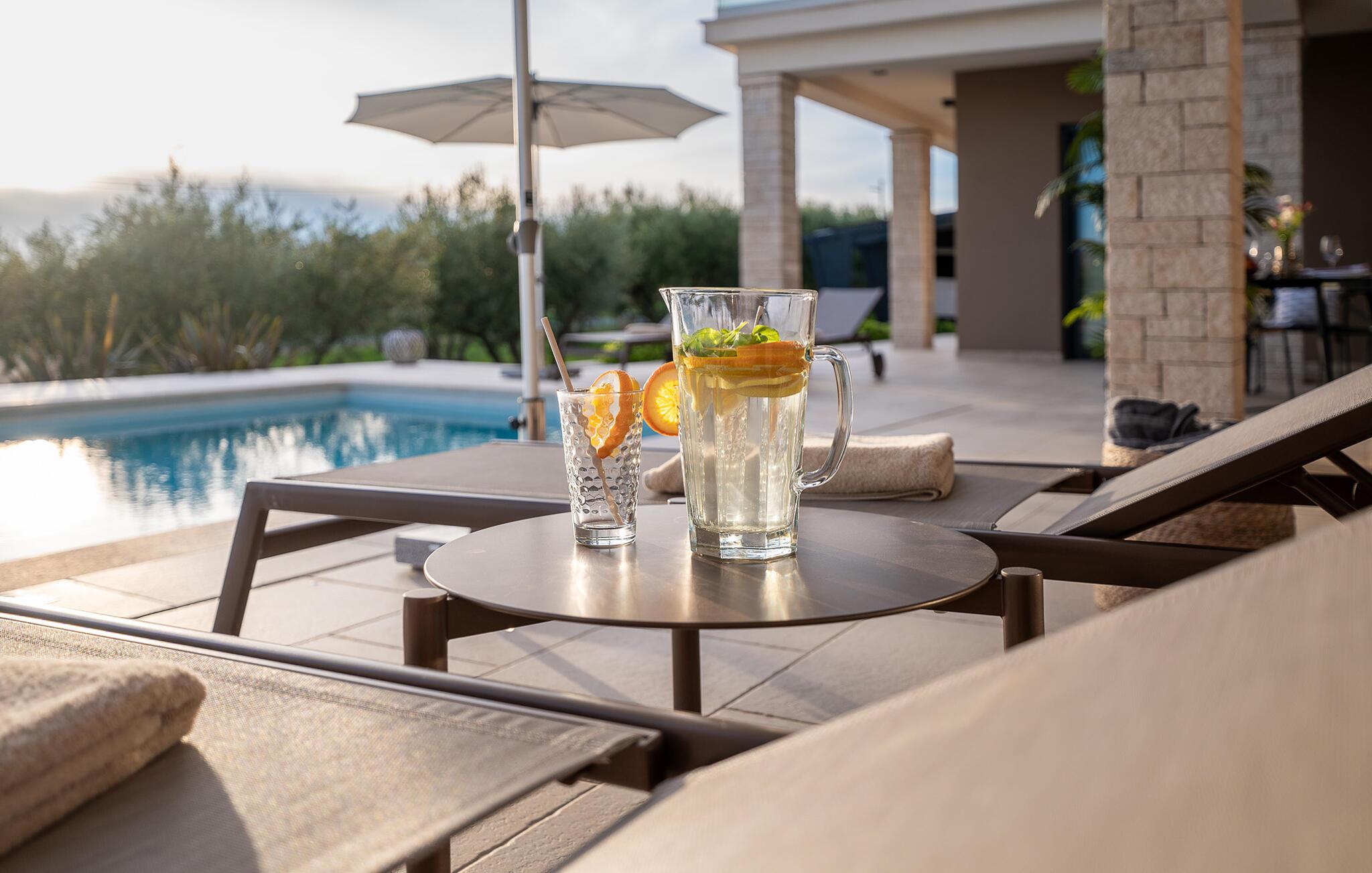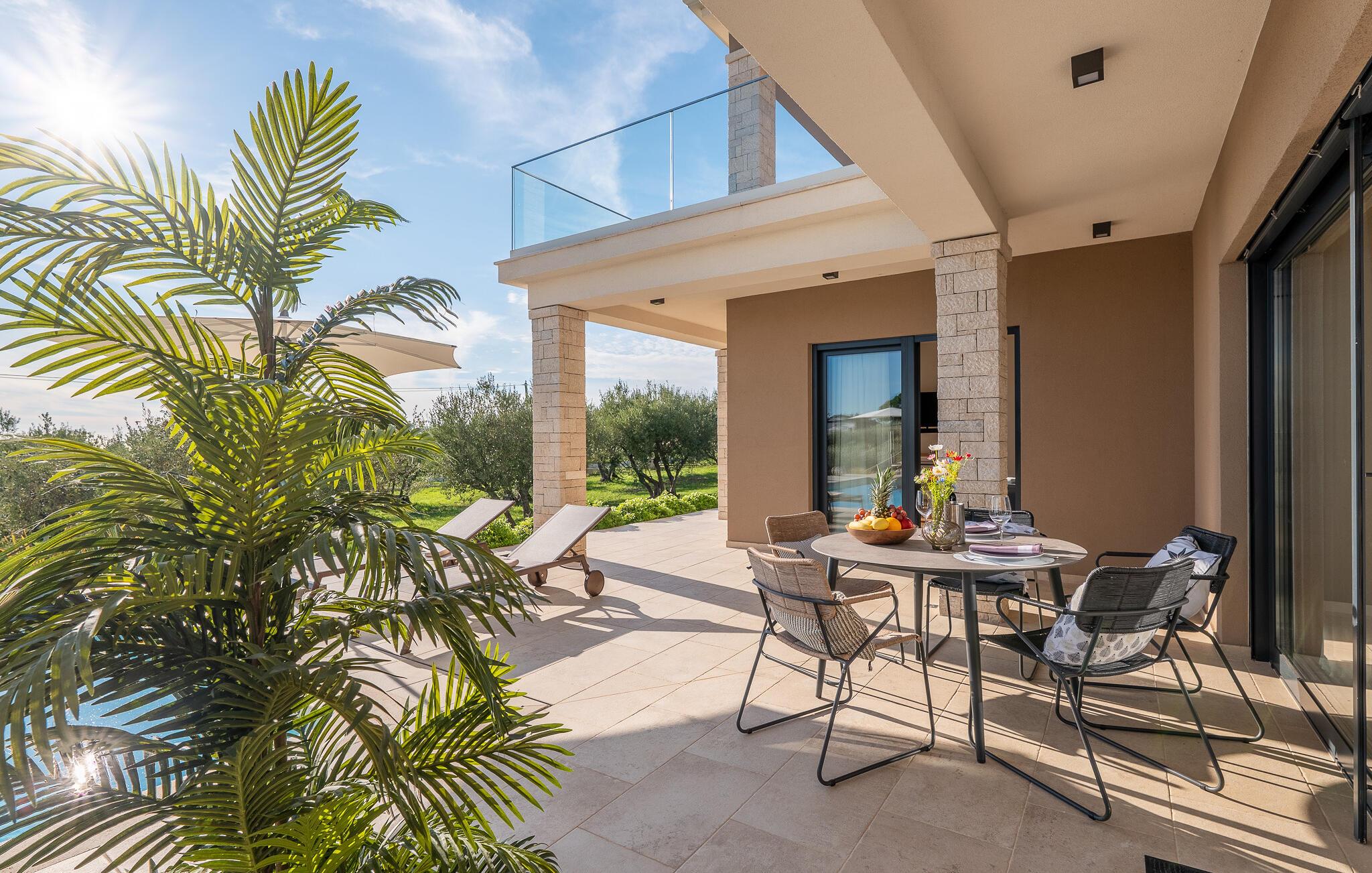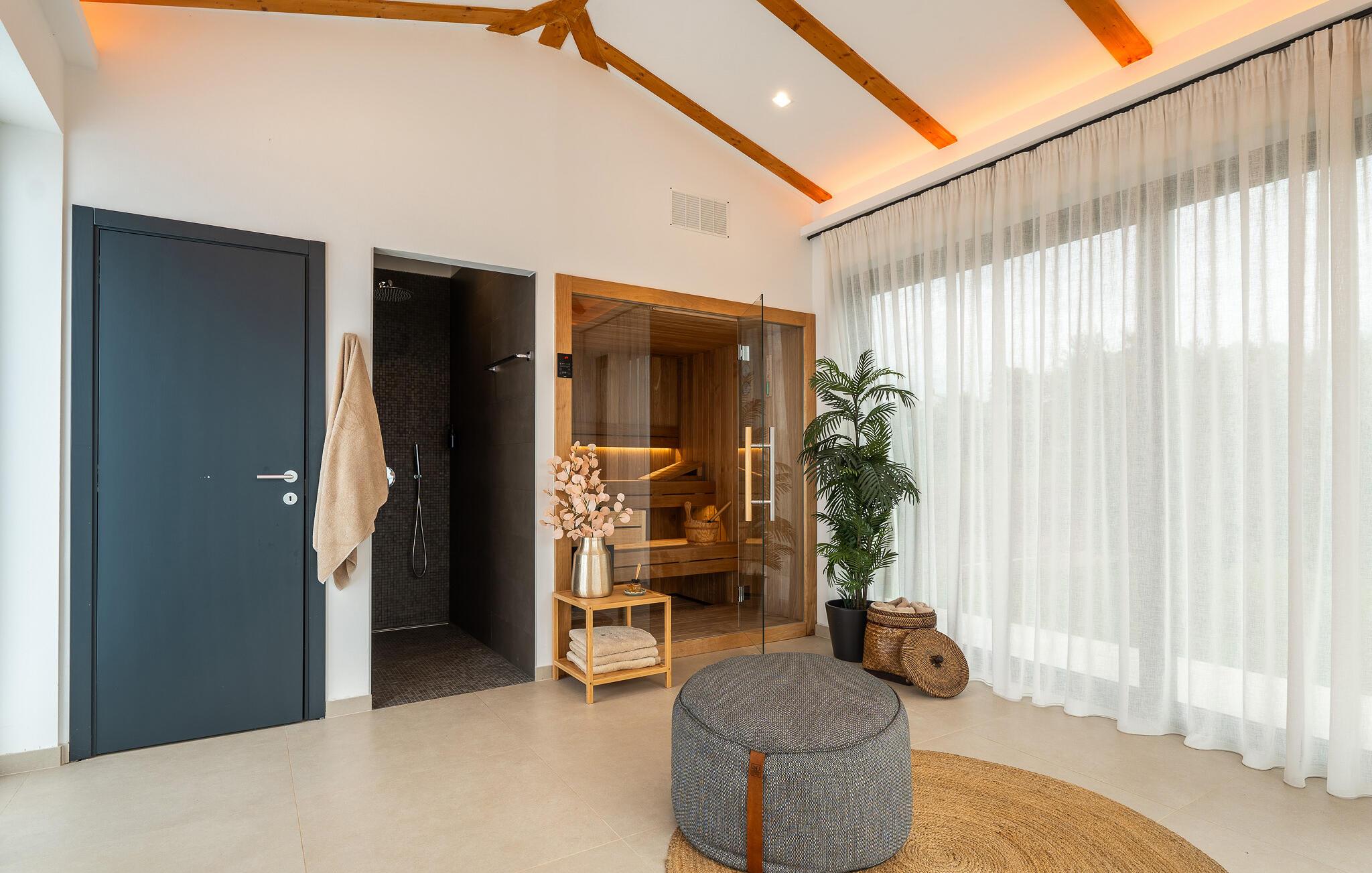 Im Exterieur der Villa ChristaLL findet jeder seinen Lieblingsplatz, ob auf der großzügigen, überdachten Terrasse, auf einer der bequemen Sonnenliegen rund um den Pool herum oder unter einem der Olivenbäume... Aber auch die Sauna ist nur ein zusätzlicher Pluspunkt dieser wunderschönen Villa. Genießen Sie hier Ihre Auszeit!
