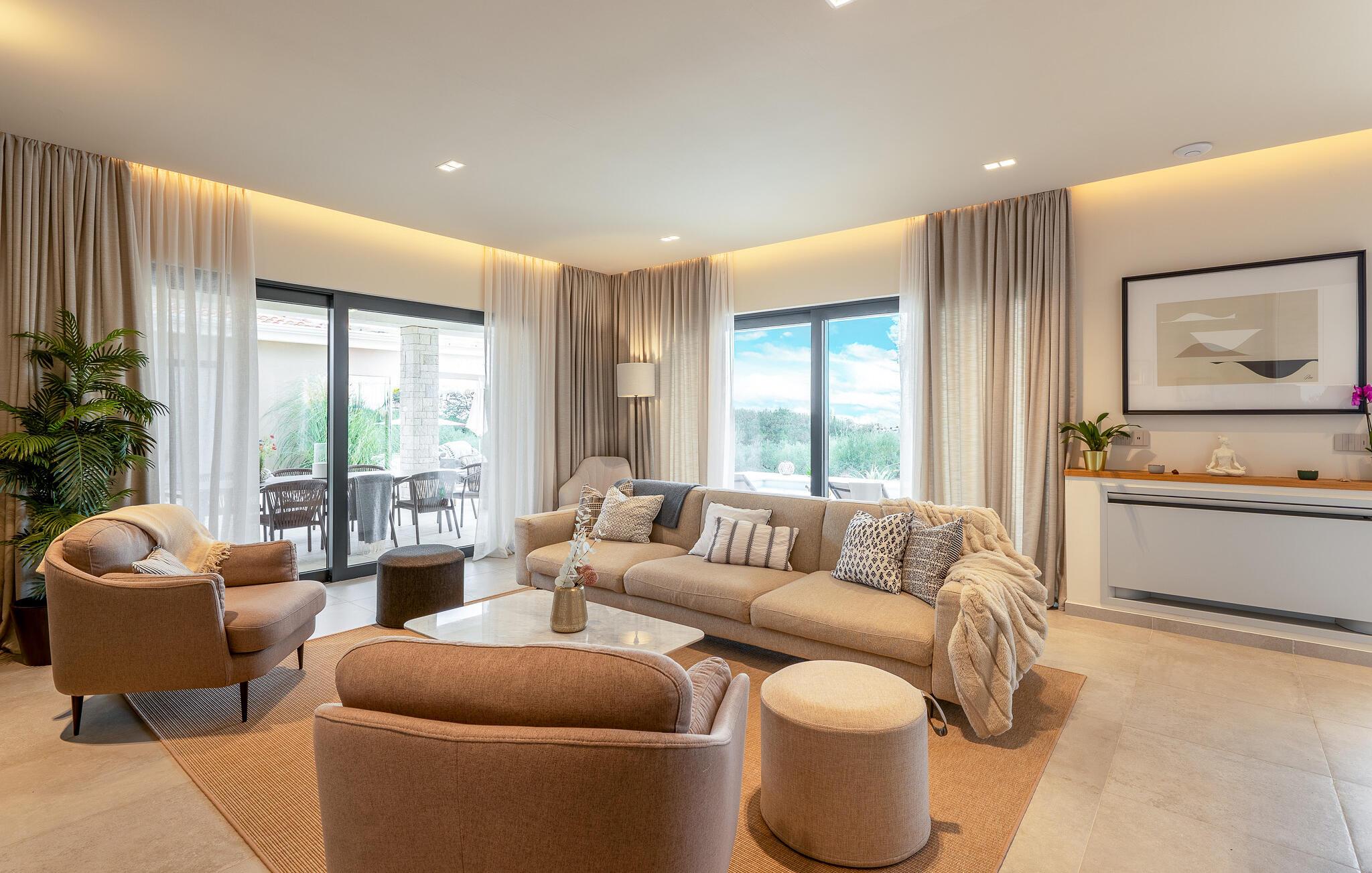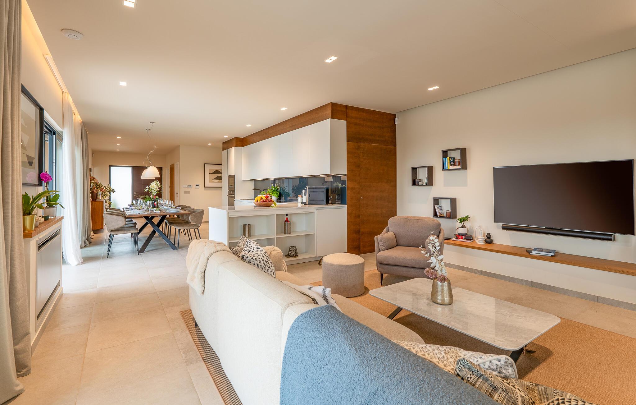 Das Interieur ist hell und wohnlich eingerichtet sowie offen gestaltet. Der voll klimatisierte Wohnbereich mit Kamin, TV und gemütlichem Sofa verläuft in den schicken Essbereich und die moderne, gut ausgestattete Küche. Auf der gleichen Ebene befinden sich eine Gästetoilette und die Wäscherei. Ein komfortables Doppelzimmer mit eigenem Badezimmer vervollständigt diese Ebene.