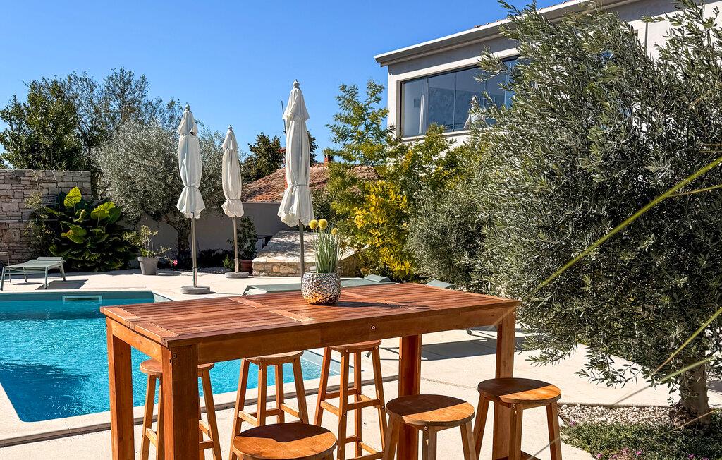 Schon der Pool allein mit seiner außergewöhnlichen Form ist ein Blickfang. Hier finden Sie die nötige Erfrischung an heißen Sommertagen. Die überdachte Sommerküche mit Grill und Esstisch ist der ideale Ort, um Familie und Freunde zu versammeln und Ausflüge zu planen oder gemütliche Abende zu verbringen. Genießen Sie die istrische Sonne auf einer der Sonnenliegen am Pool oder spielen Sie eine Runde Basketball. Hier wird jeder seinen Lieblingsplatz finden.