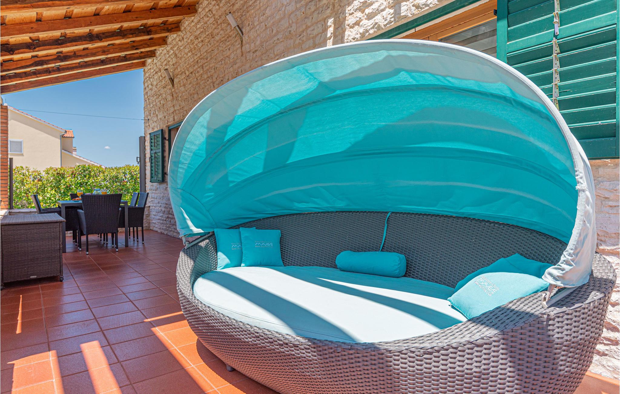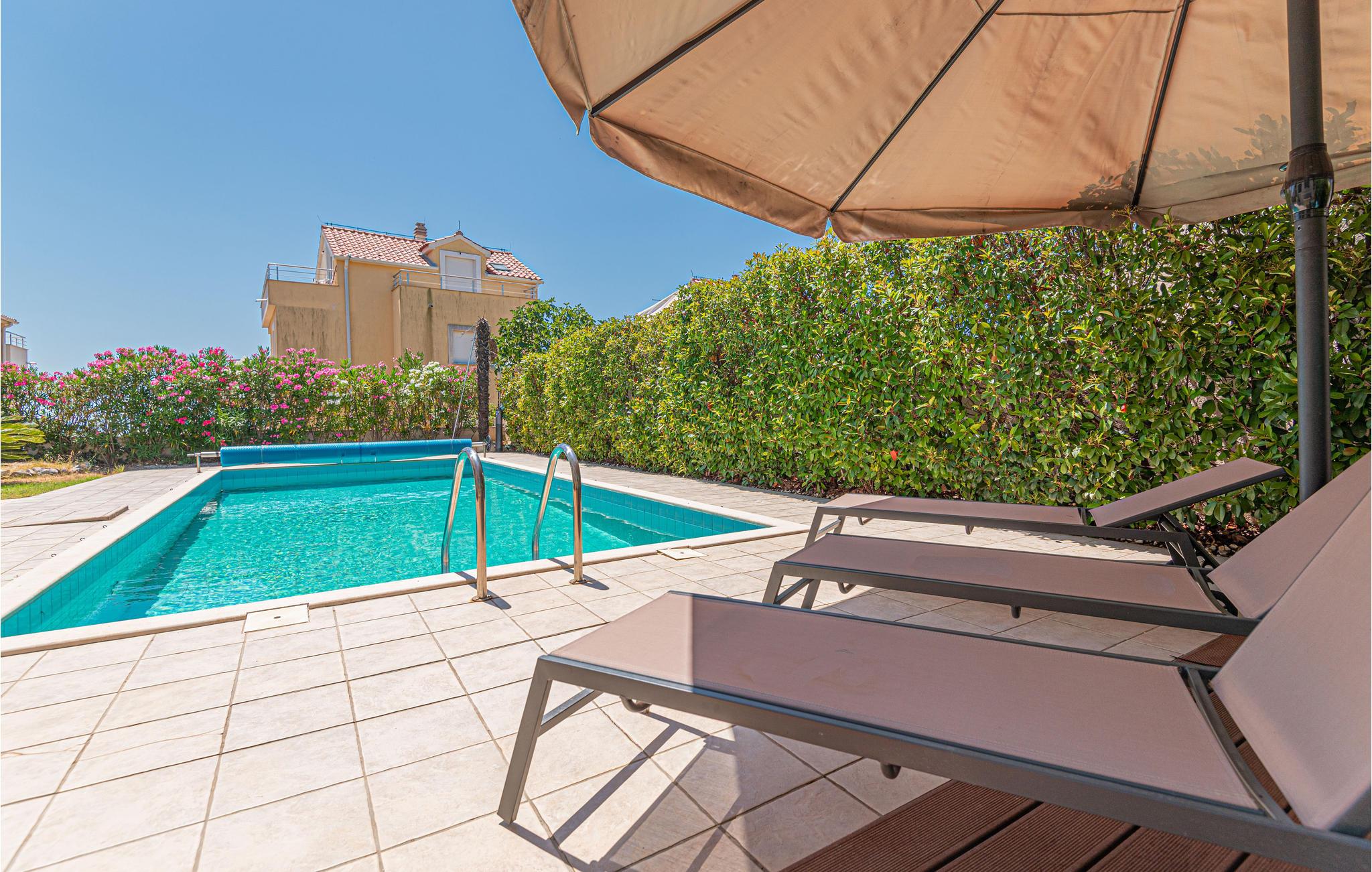 Auch der Außenbereich lässt keine Wünsche offen. Der große Pool sorgt für Erfrischung an heißen Tagen, während Sie auf den Sonnenliegen entspannen. Die überdachte Terrasse mit Sitzgelegenheit und Grill lädt zu gemütlichen Mahlzeiten im Freien ein.