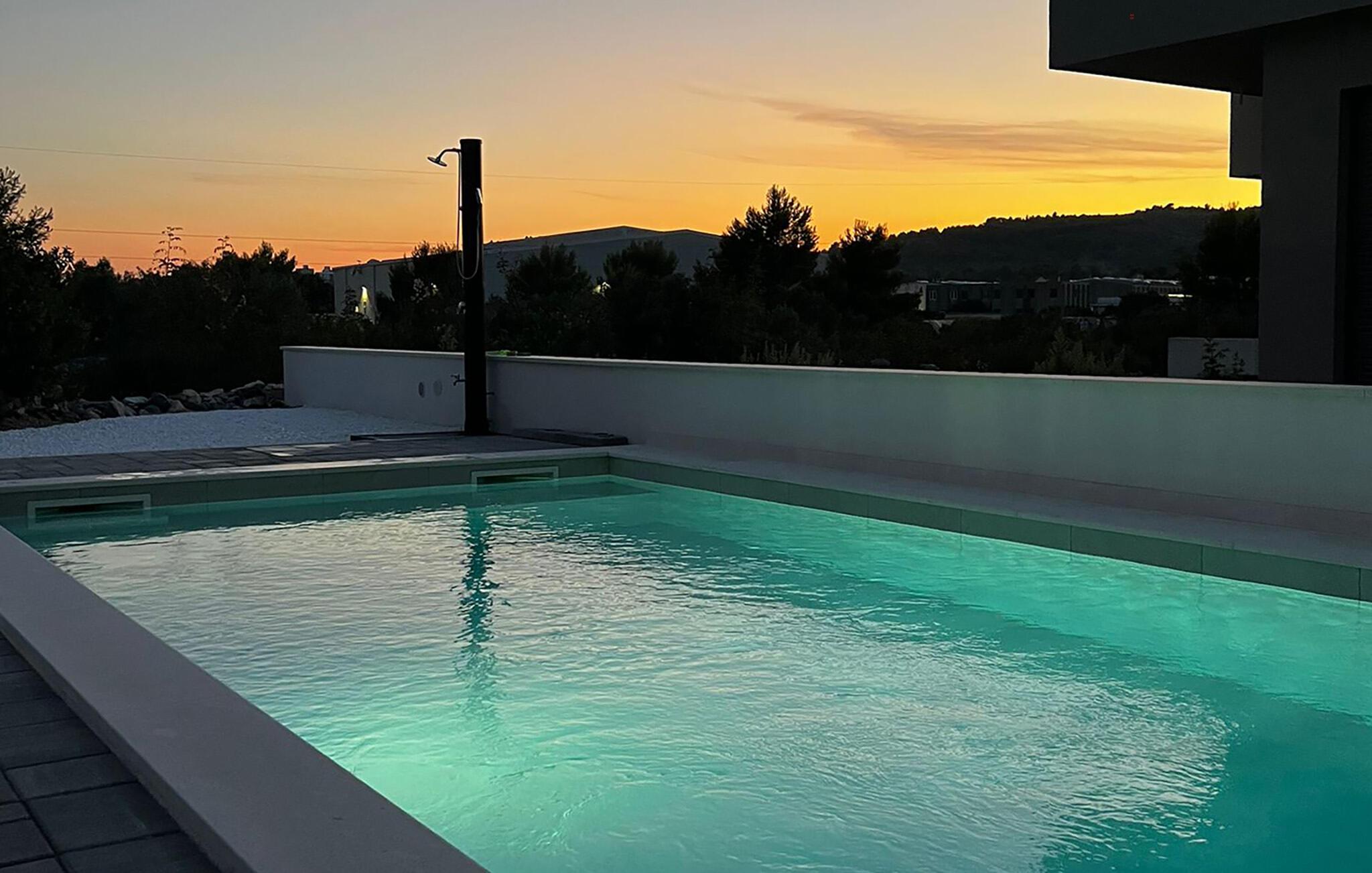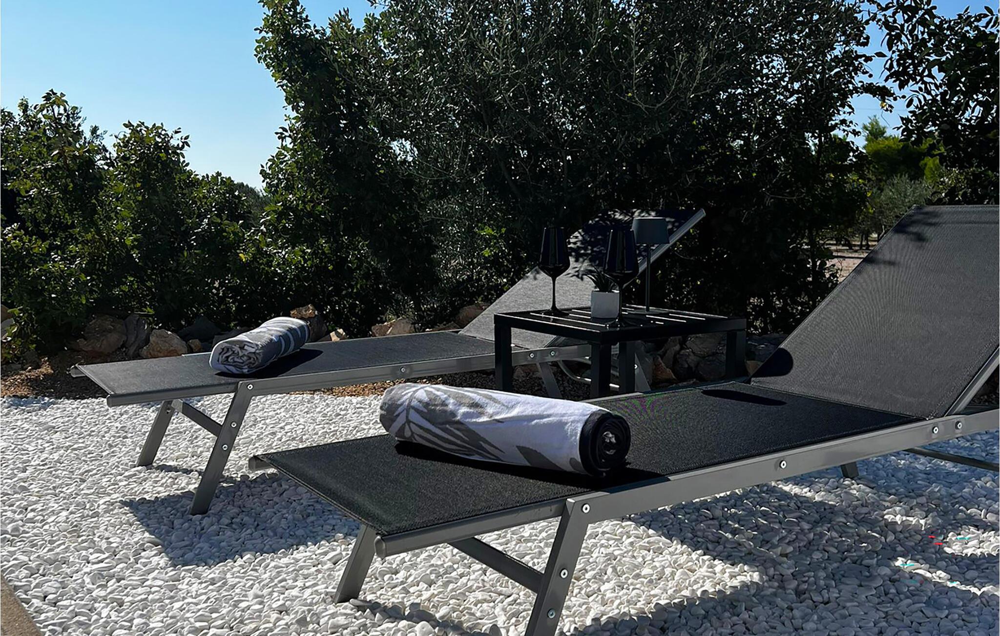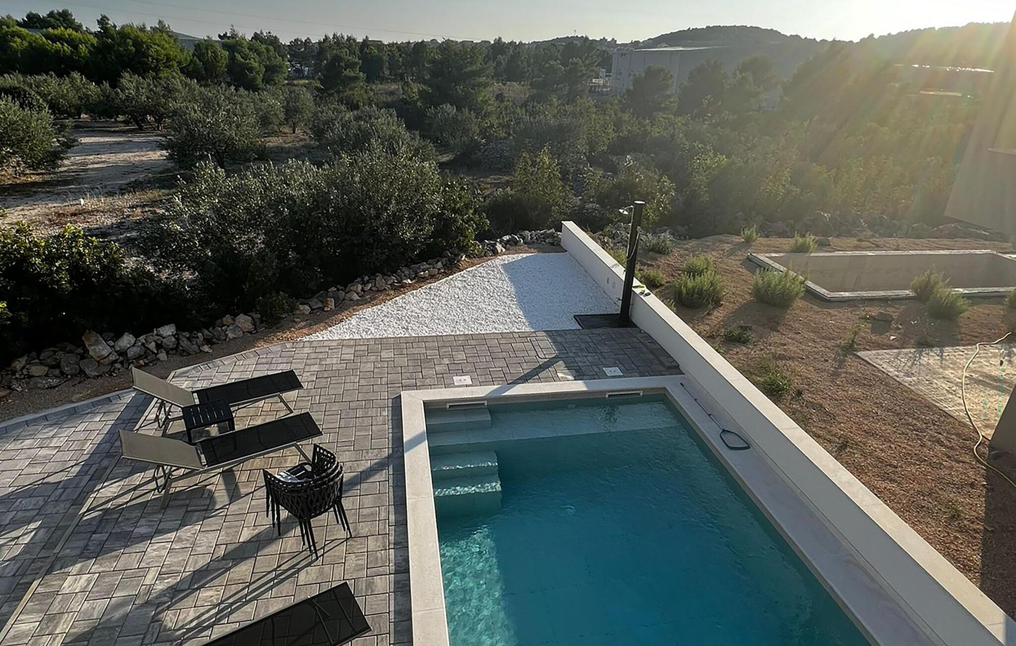 Im gepflegten Außenbereich erwartet Sie ein glitzernder Pool, in dem Sie sich dank einer stimmungsvollen Beleuchtung auch in heißen Sommernächten wunderbar erfrischen können. Tanken Sie neue Energie auf den bequemen Sonnenliegen, plaudern Sie mit Blick auf die Olivenbäume in den Sonnenuntergang hinein und lauschen Sie bei gemütlichen Grillabenden dem Zirpen der Zikaden.
