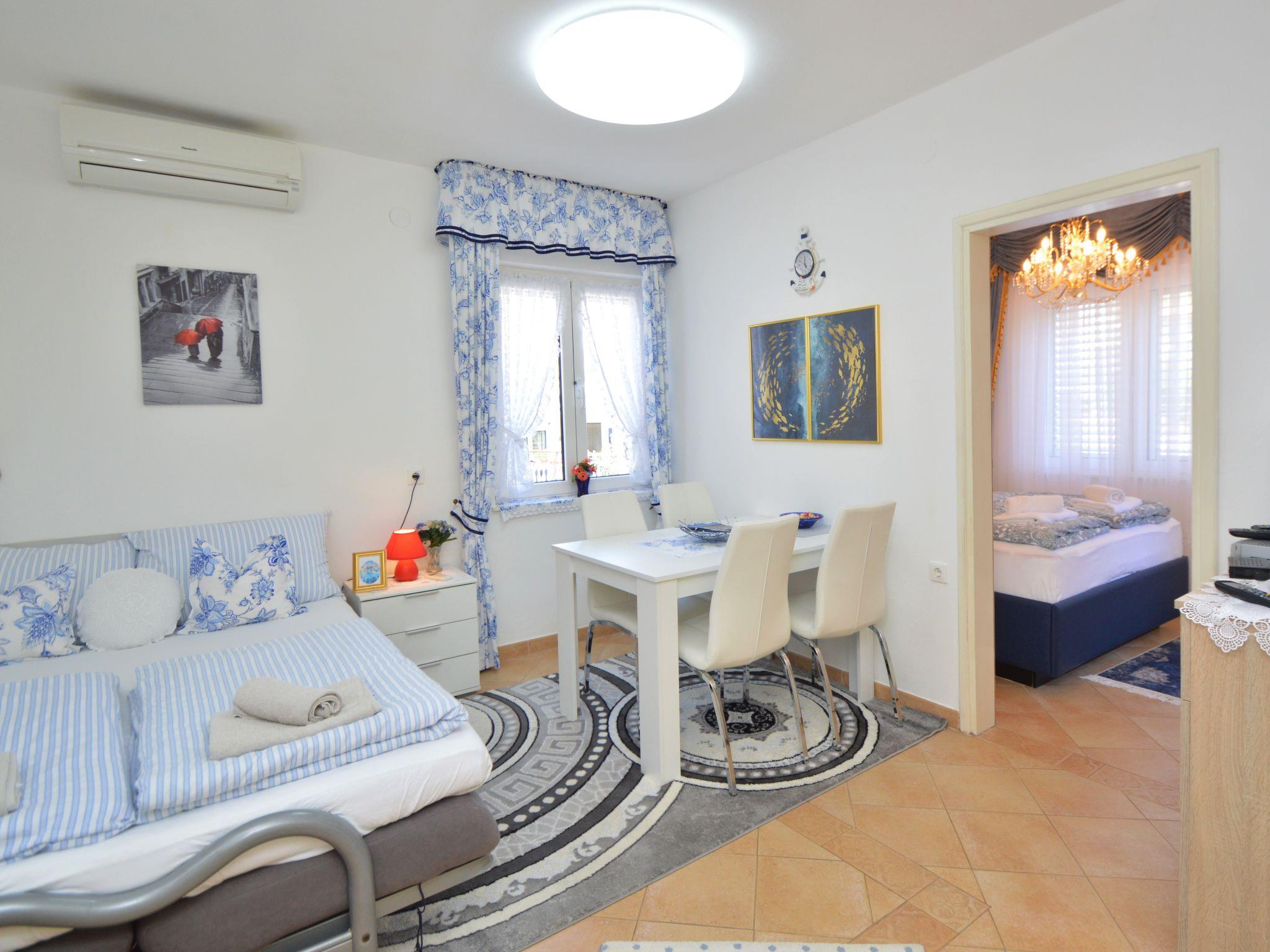 2-Zimmer-Wohnung 35 m2 im 1. Stock, Westlage. Schön und gemütlich eingerichtet: Wohn-/Esszimmer mit 1 Doppeldiwanbett (140 cm, Länge 200 cm), Sat-TV (Flachbildschirm), Klimaanlage. 1 Zimmer mit 1 franz. Bett (160 cm, Länge 200 cm). Ausgang zum Balkon. Offene Küche (Geschirrspüler, 4 Glaskeramikplatten, Wasserkocher, Mikrowelle, Tiefkühler, elektrische Kaffeemaschine). Dusche/Bidet/WC. Keine Heizmöglichkeit. Balkon 4 m2. Balkonmöbel. Zur Verfügung: Internet (Wireless LAN, gratis).