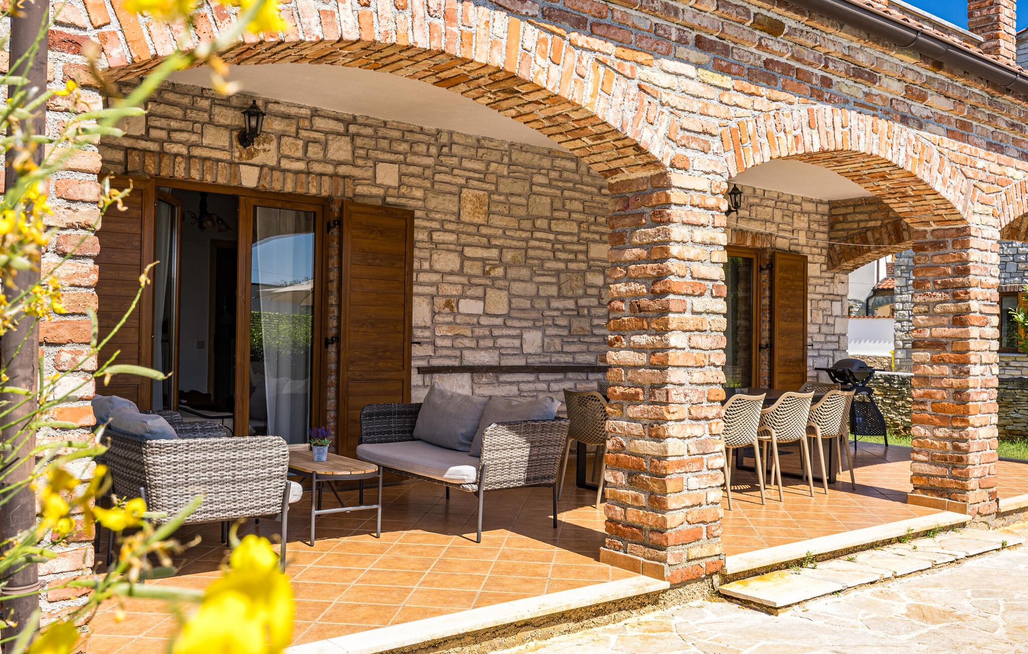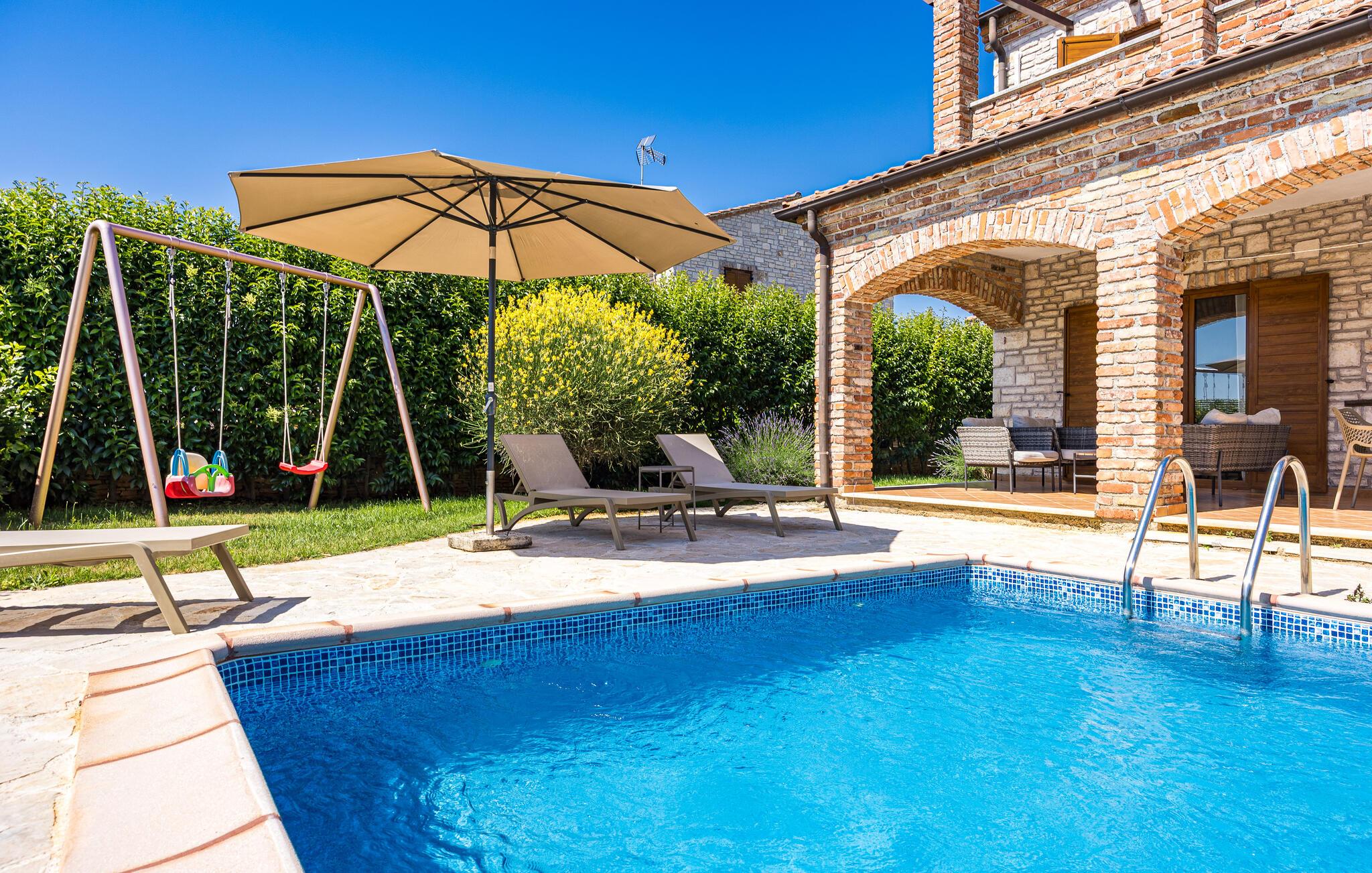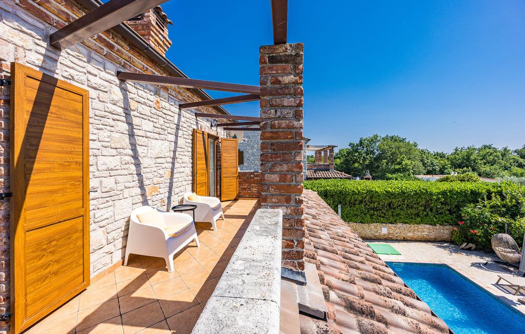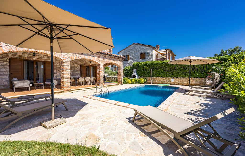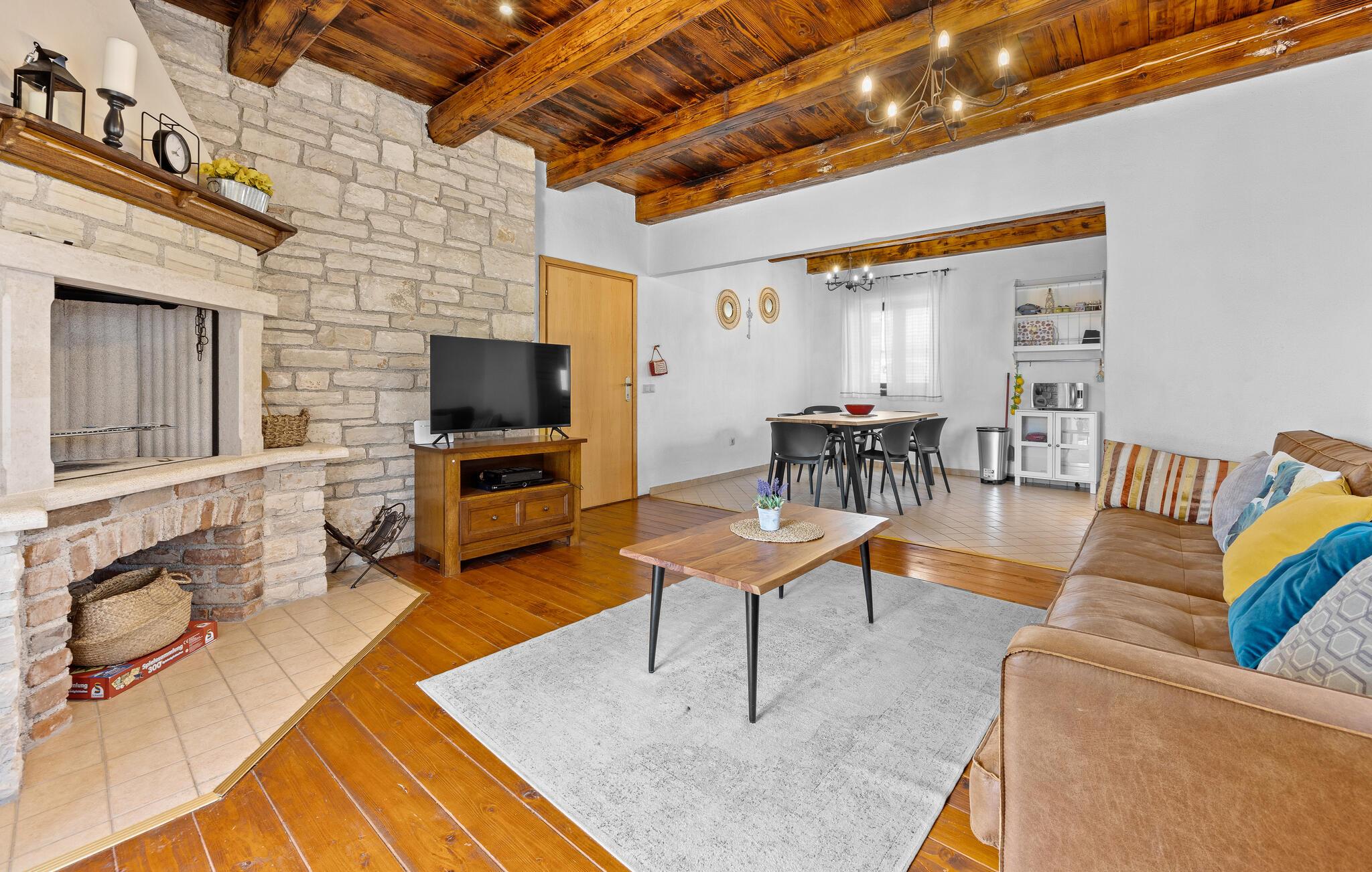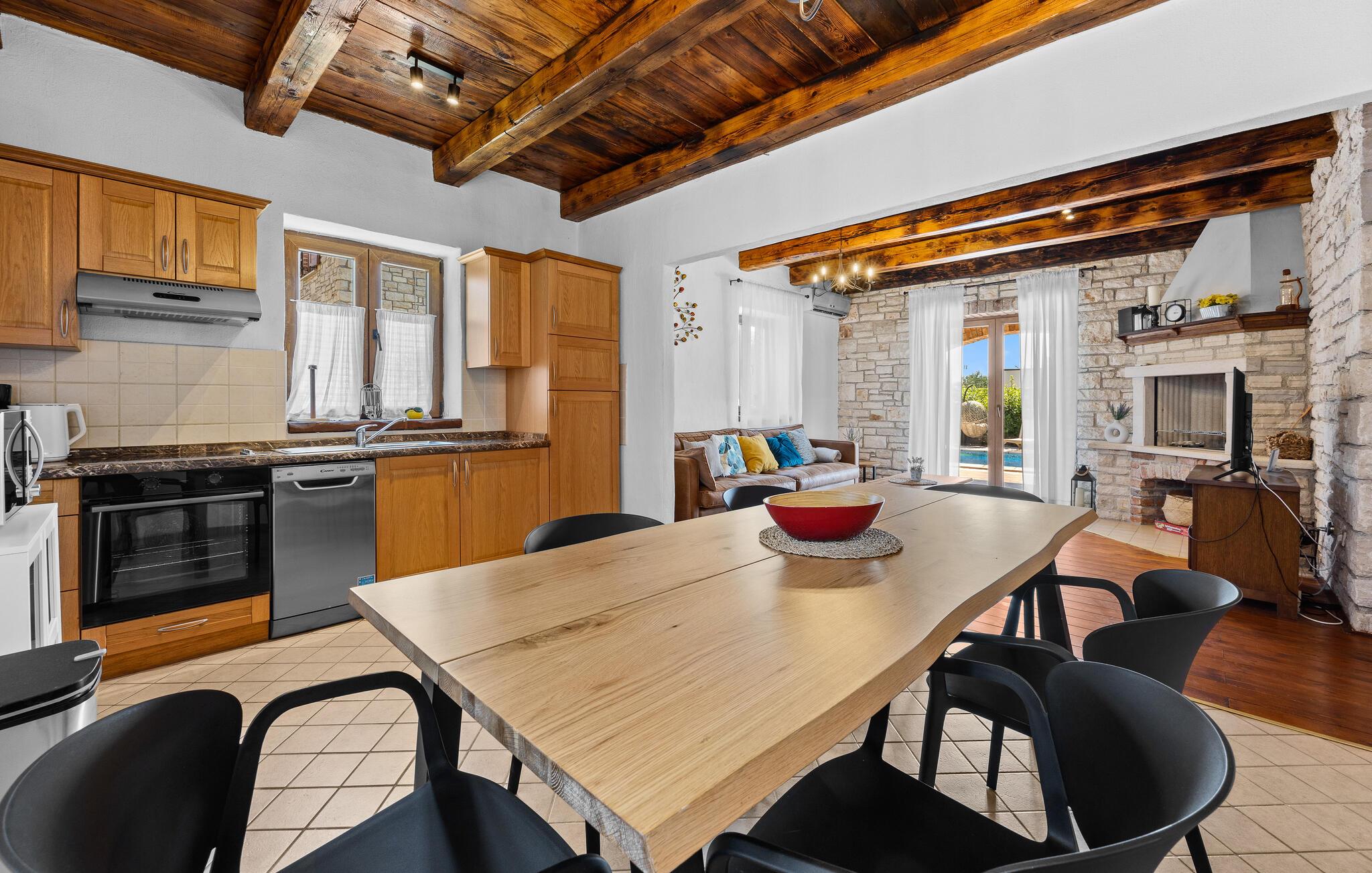 Verbringen Sie unvergessliche Tage in diesem großzügigen Ferienhaus, das traditionellen Charme mit modernem Komfort vereint. Hier erwarten Sie Erholung, Ruhe und istrische Lebensfreude in einer stilvollen Umgebung. Im Inneren begrüßt Sie ein einladender Wohnbereich mit Natursteinwänden, Holzbalken und elegantem Mobiliar. Machen Sie es sich auf dem schönen Sofa gemütlich, genießen Sie den Blick auf den Pool oder lassen Sie den Abend am Kamin ausklingen. Die offene Küche mit Essbereich ist bestens ausgestattet und bietet viel Platz für gemeinsame Mahlzeiten. Hochwertige Materialien und warme Farben schaffen eine harmonische, wohnliche Atmosphäre, die zum Verweilen einlädt.