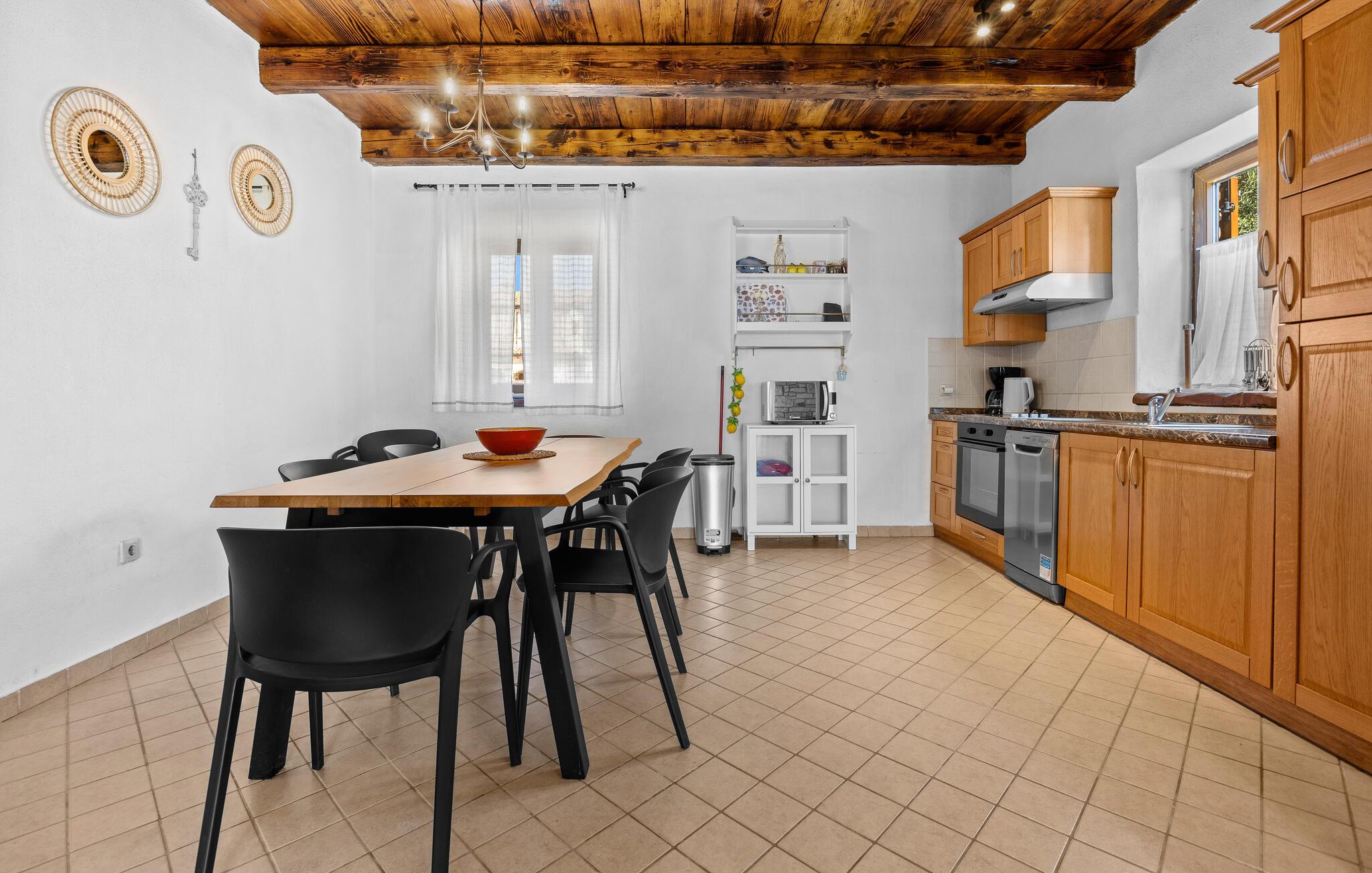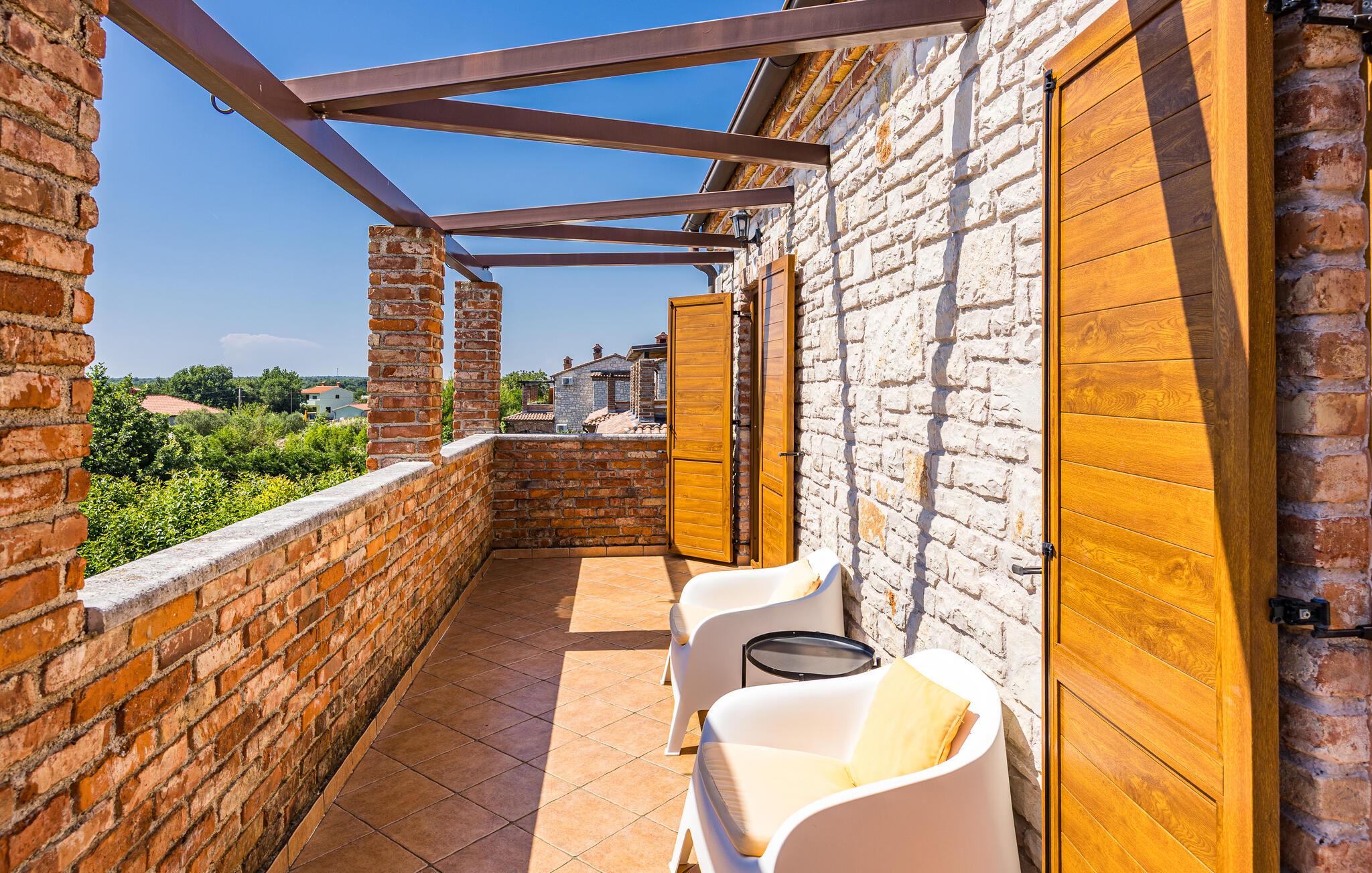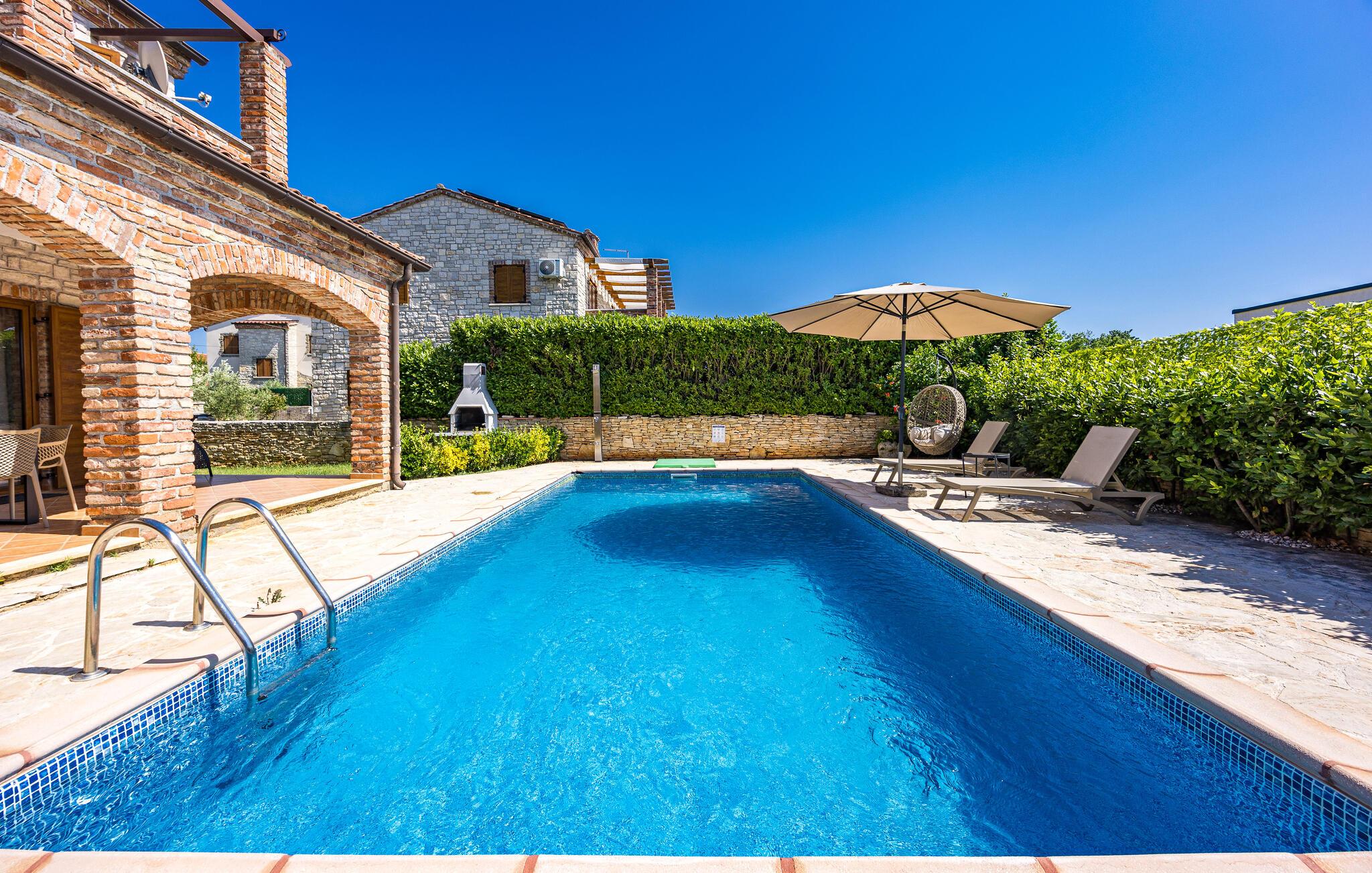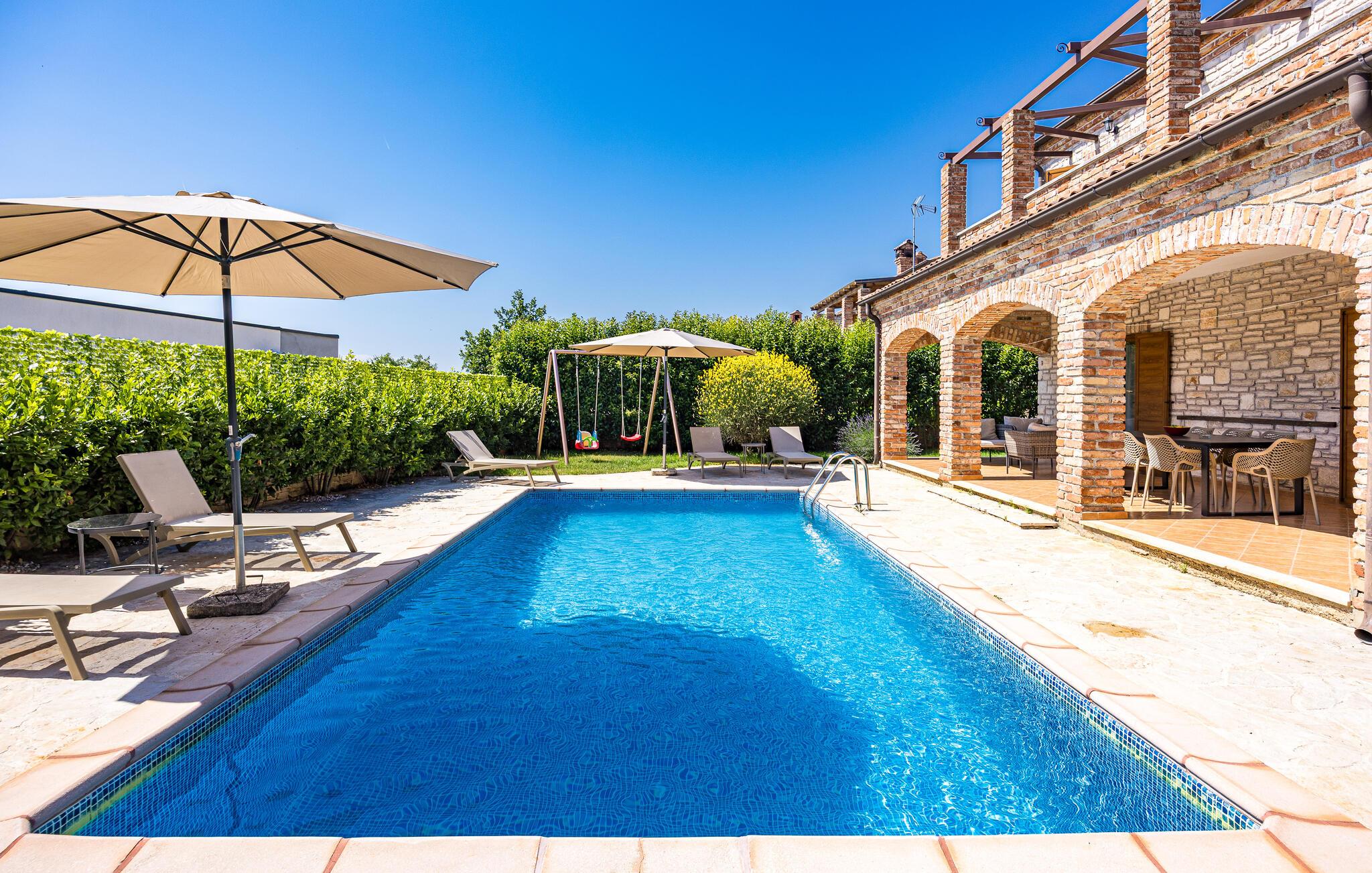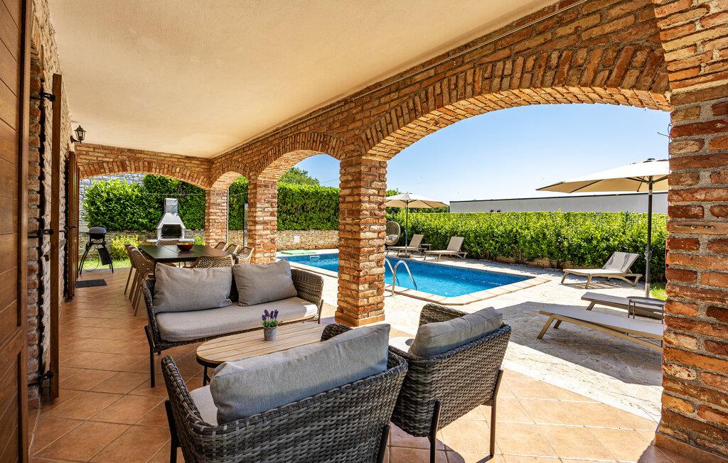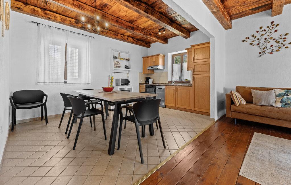 Verbringen Sie unvergessliche Tage in diesem großzügigen Ferienhaus, das traditionellen Charme mit modernem Komfort vereint. Hier erwarten Sie Erholung, Ruhe und istrische Lebensfreude in einer stilvollen Umgebung. Im Inneren begrüßt Sie ein einladender Wohnbereich mit Natursteinwänden, Holzbalken und elegantem Mobiliar. Machen Sie es sich auf dem schönen Sofa gemütlich, genießen Sie den Blick auf den Pool oder lassen Sie den Abend am Kamin ausklingen. Die offene Küche mit Essbereich ist bestens ausgestattet und bietet viel Platz für gemeinsame Mahlzeiten. Hochwertige Materialien und warme Farben schaffen eine harmonische, wohnliche Atmosphäre, die zum Verweilen einlädt.