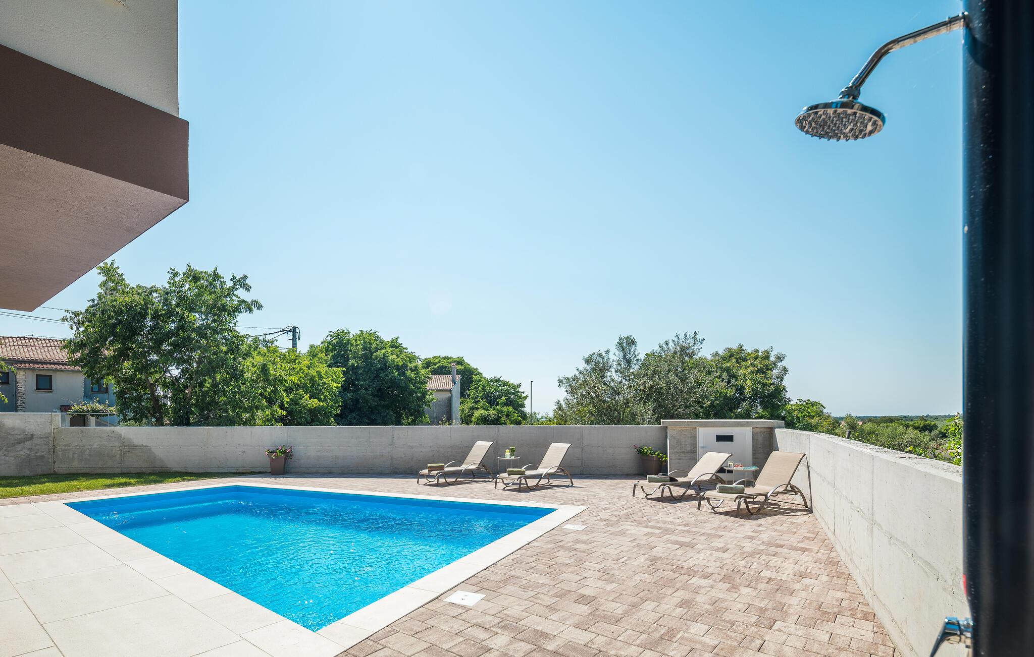 Genießen Sie einen sorgenfreien Urlaub in diesem komfortablen Ferienhaus mit Pool.