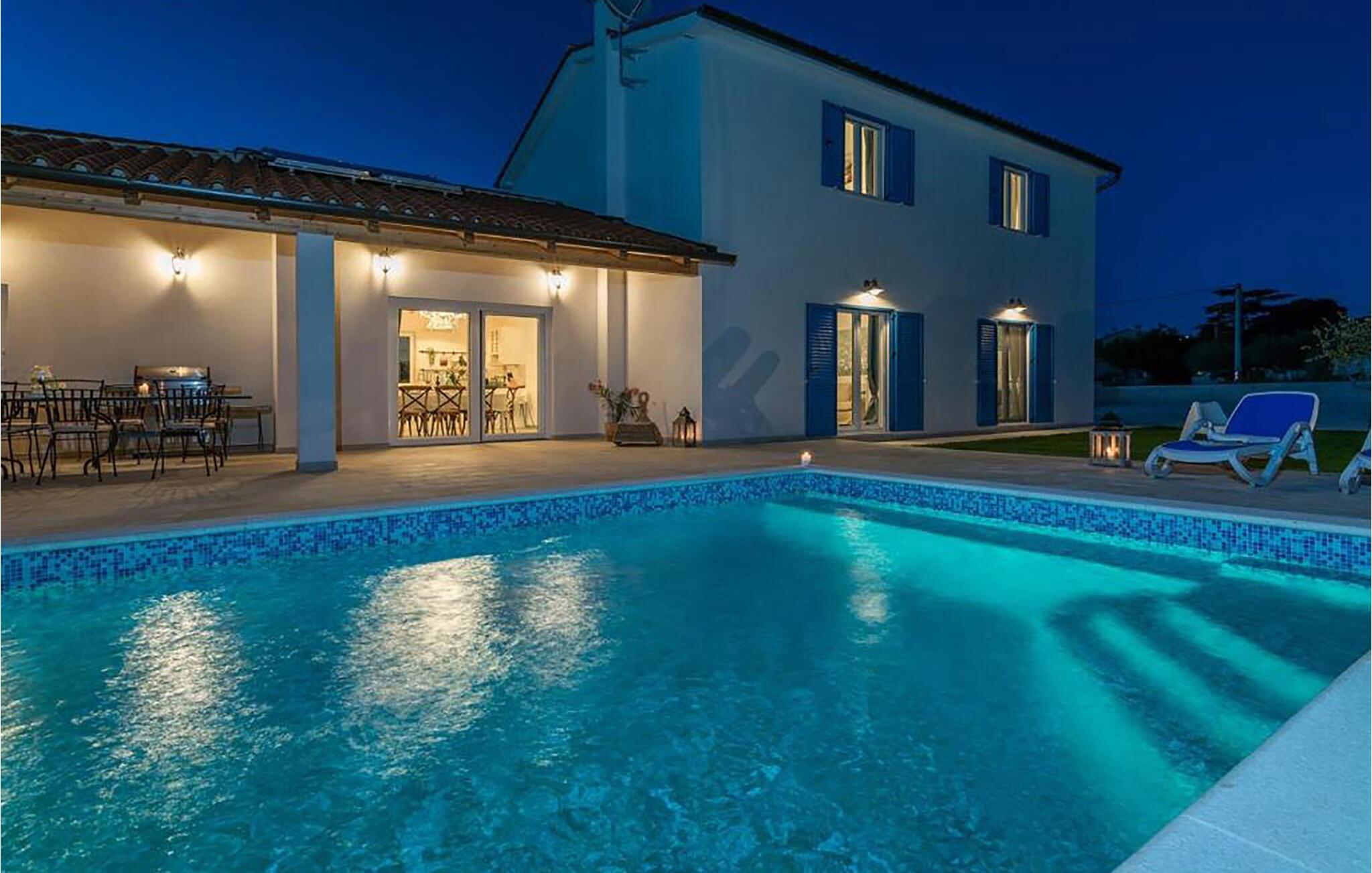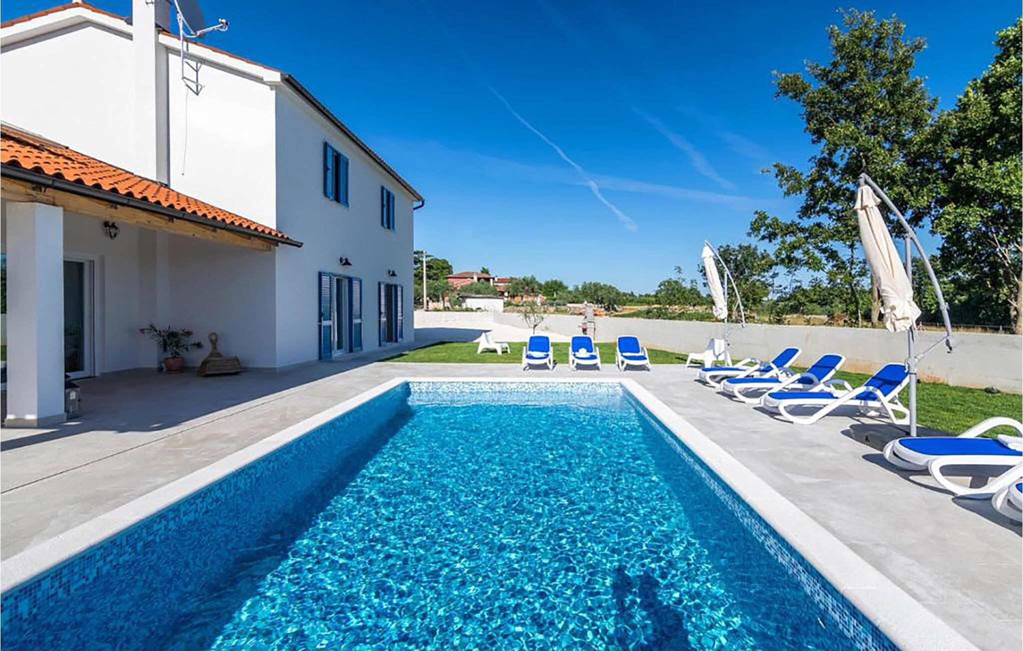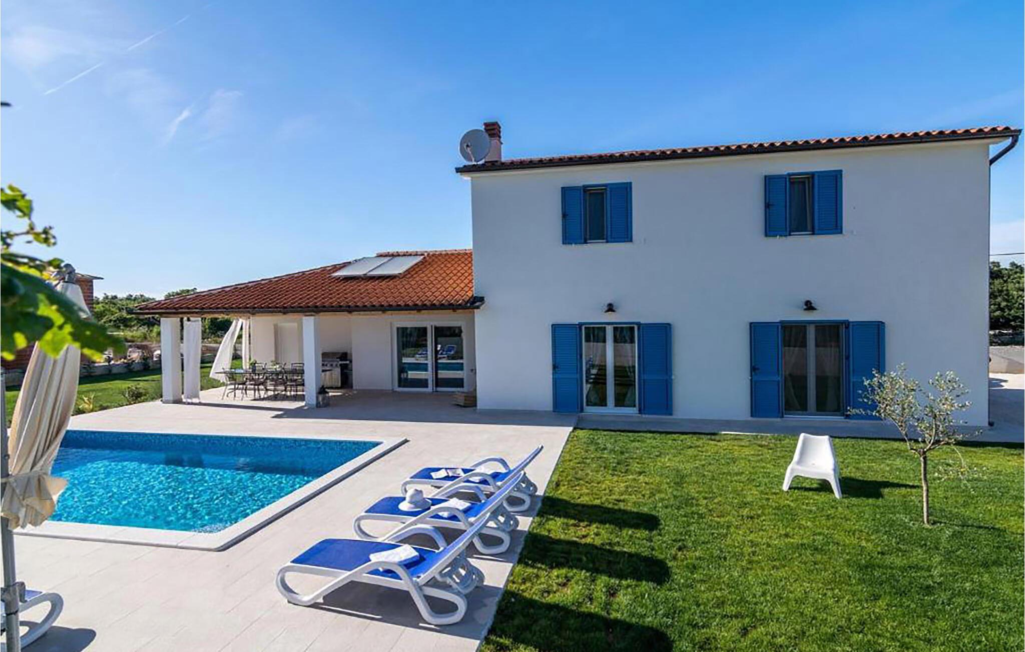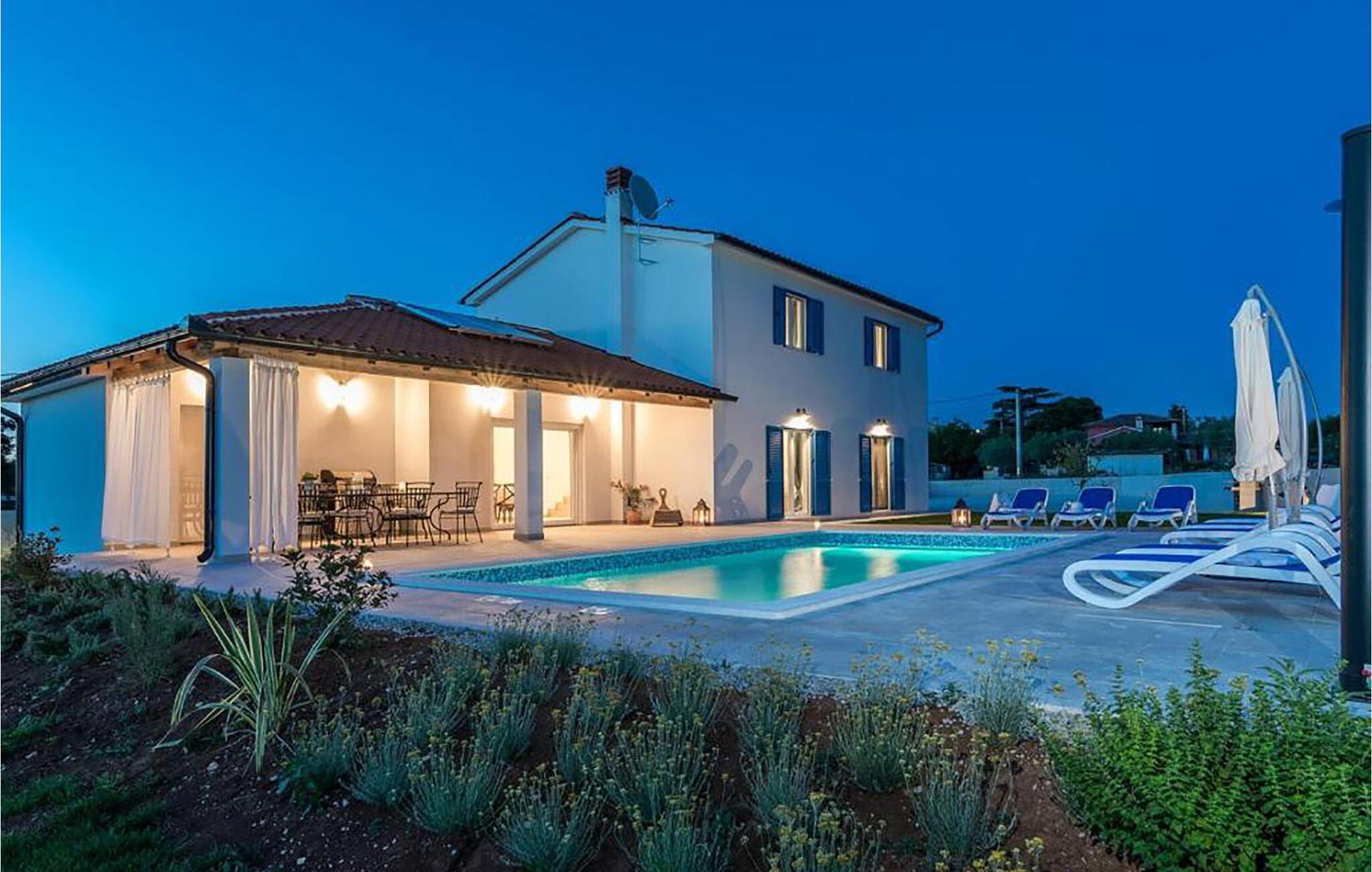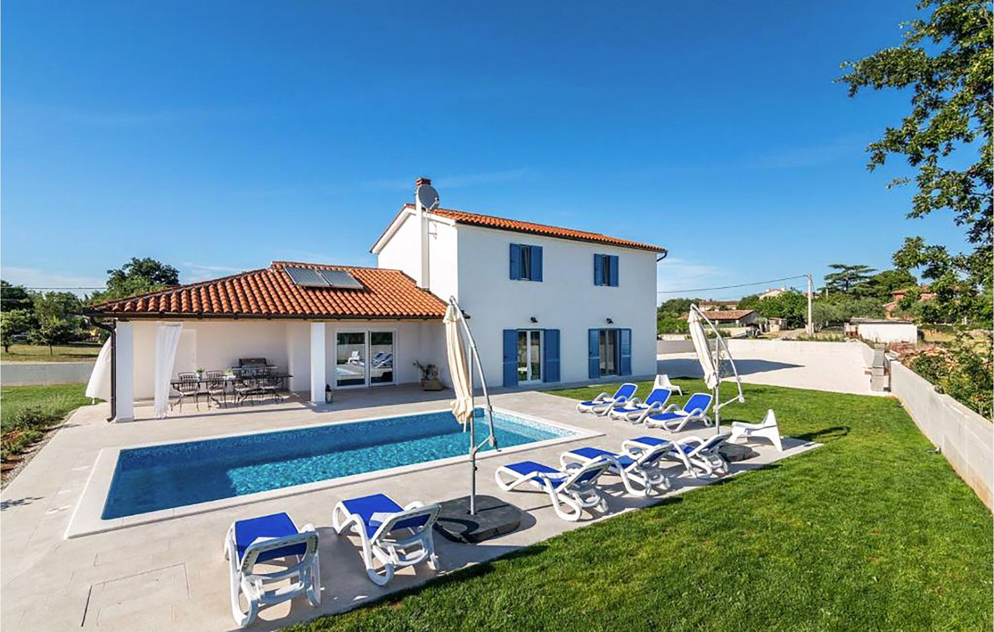 In der malerischen Umgebung von Juršici erwartet Sie diese stilvolle Villa, die mit viel Platz, Komfort und einer ruhigen Atmosphäre überzeugt. Die großzügigen Räume sind geschmackvoll eingerichtet, und der einladende Wohnbereich sorgt für eine behagliche Stimmung. In der modernen Küche können Sie gemeinsame Mahlzeiten zubereiten, während die gemütliche Sitzecke zum Verweilen einlädt. Draußen bietet Ihnen die weitläufige Terrasse mit Blick auf den Garten den perfekten Ort für entspannte Stunden. Ob ein Sprung in den Pool oder ein Glas Wein unter dem Sternenhimmel – hier genießen Sie einen erholsamen Urlaub.