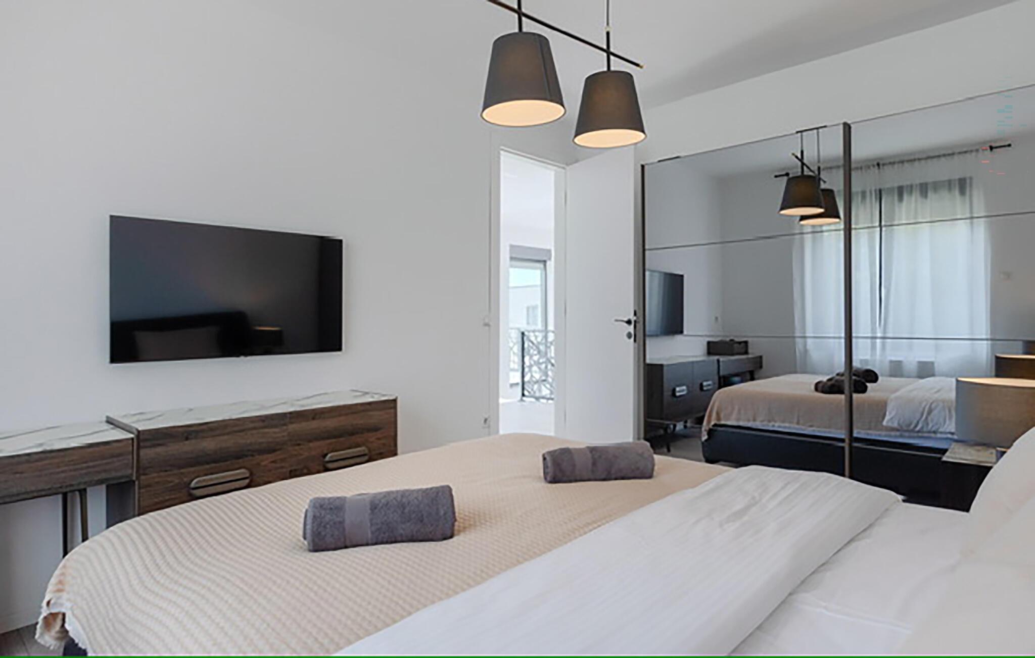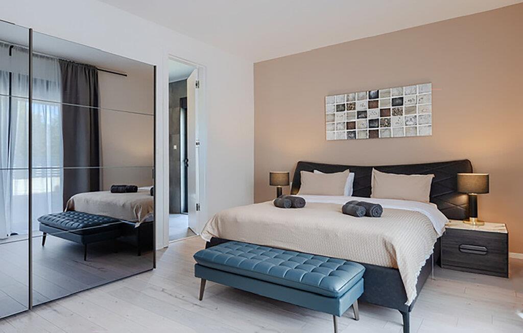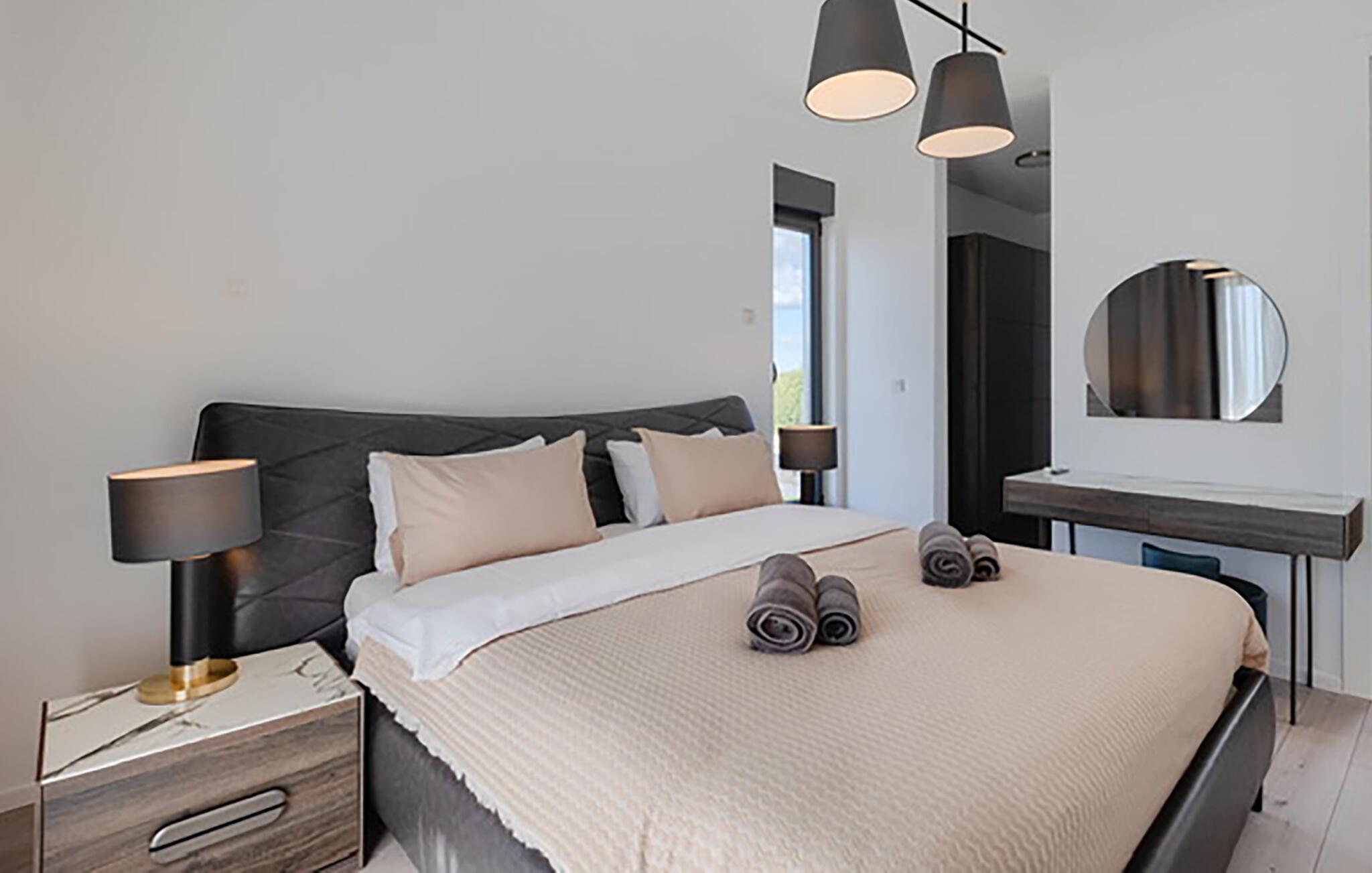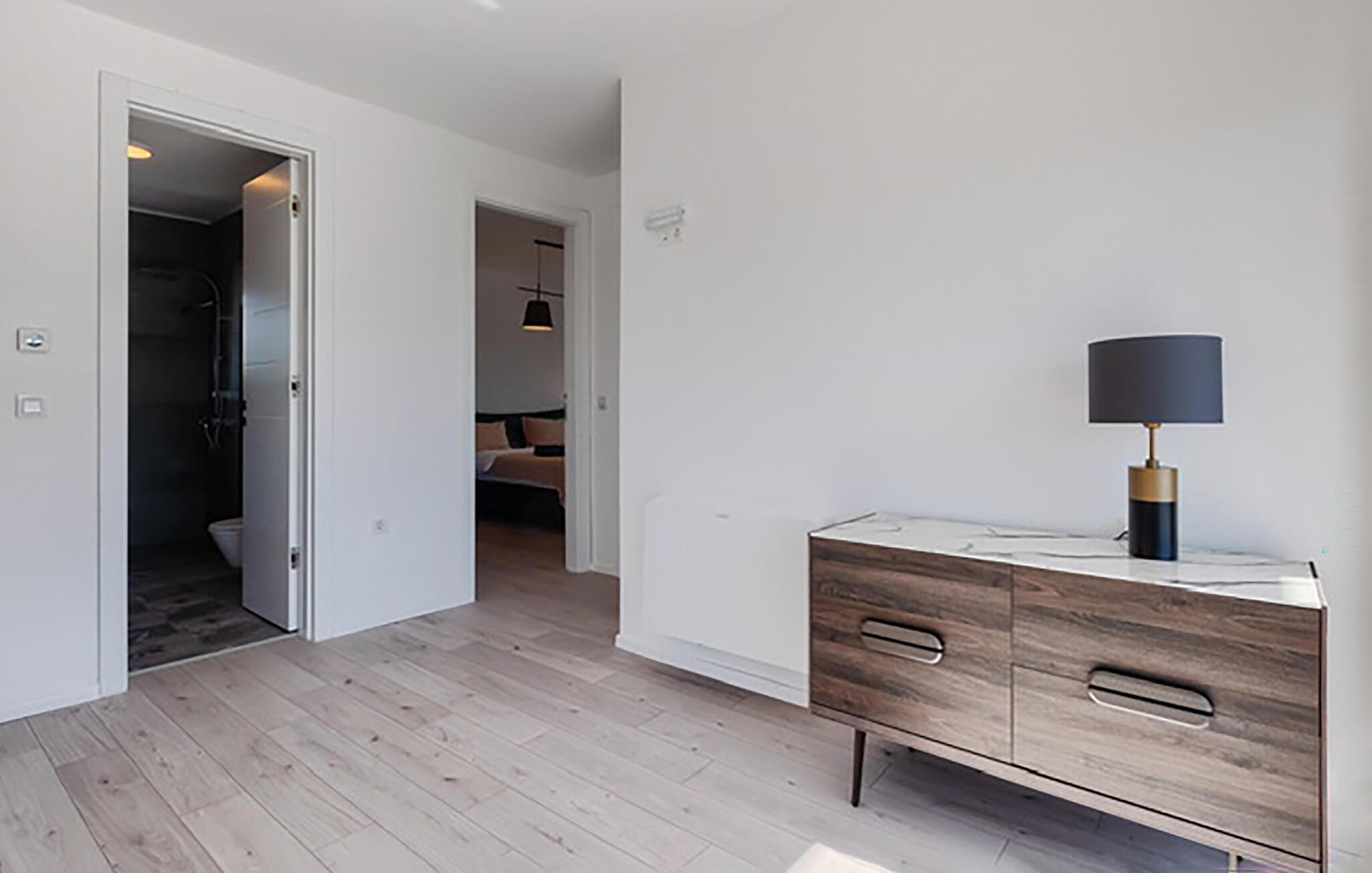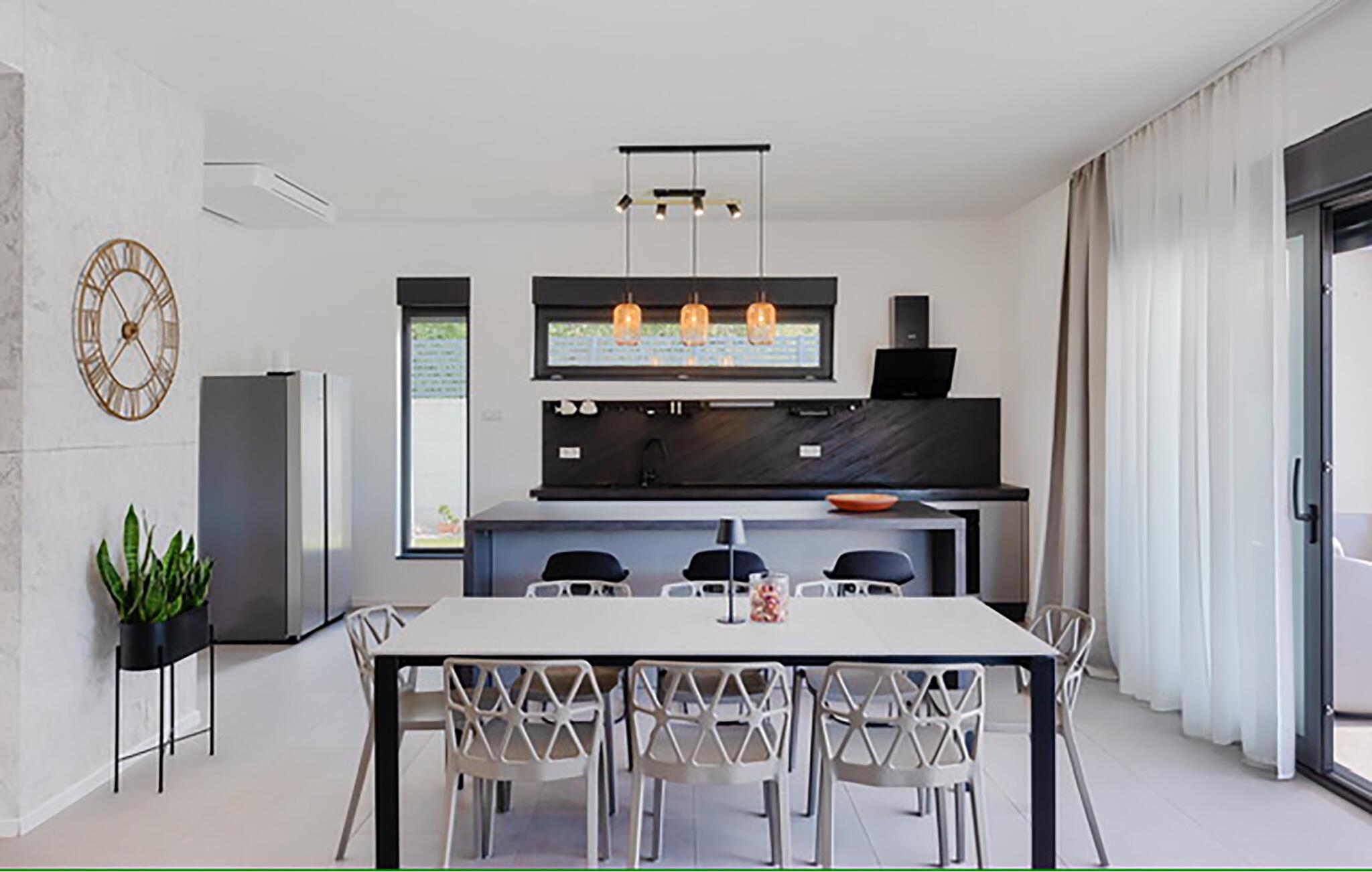 Willkommen im behaglichen Ambiente dieses stilvoll eingerichteten Urlaubsdomizils. Zaubern Sie in der offenen Küche kroatische Köstlichkeiten und genießen Sie gesellige Mahlzeiten am langen Esstisch. Machen Sie es sich im eleganten Wohnzimmer bequem, streamen Sie einen Film oder nutzen Sie die gemeinsame Zeit für anregende Gespräche bei einem Glas Wein.