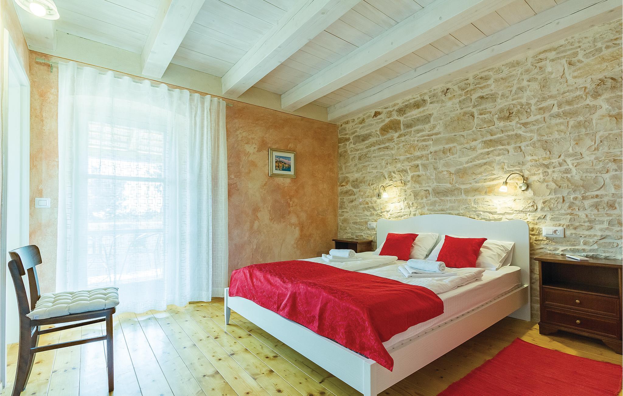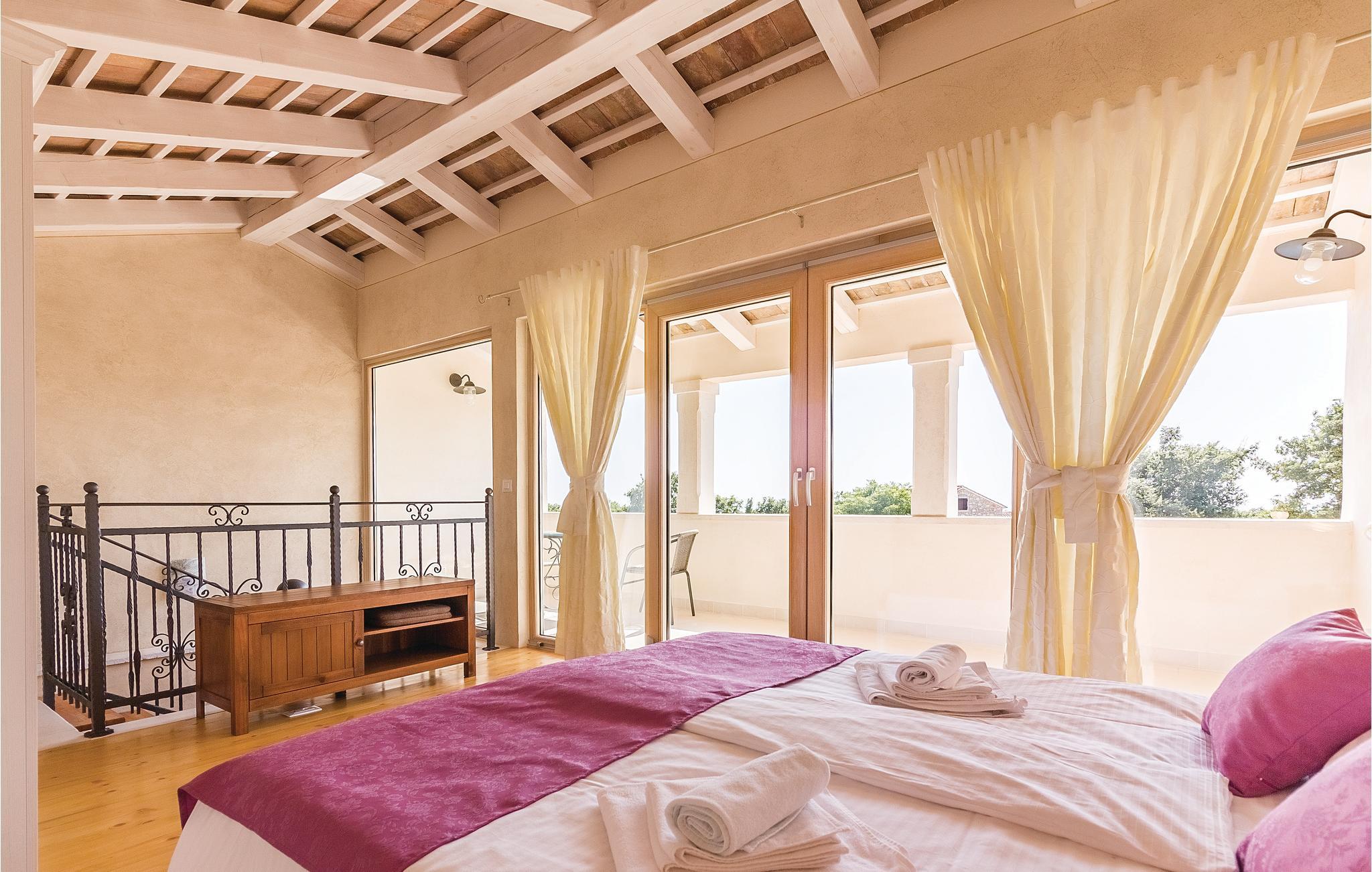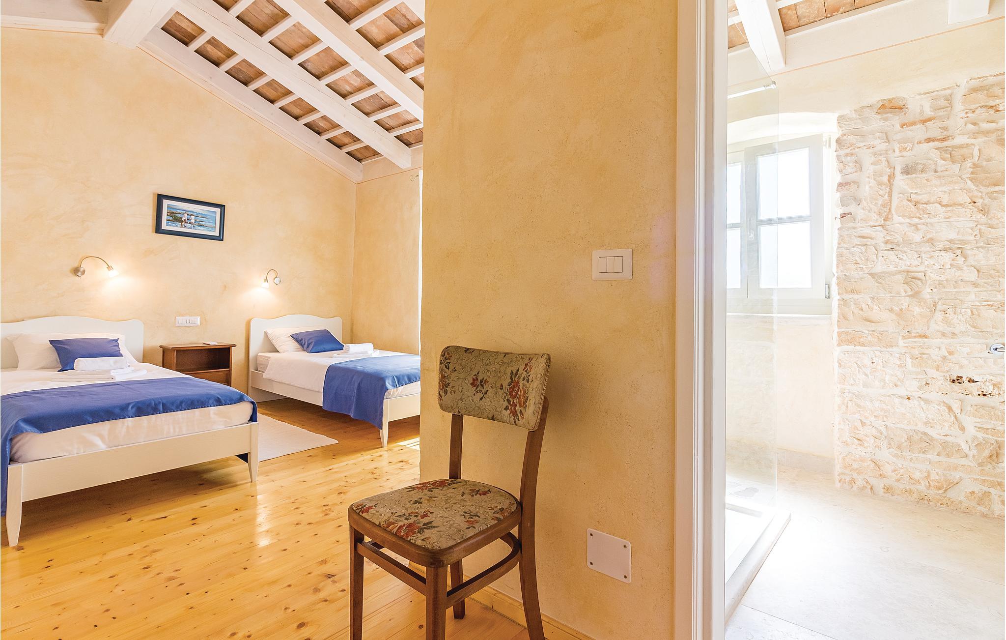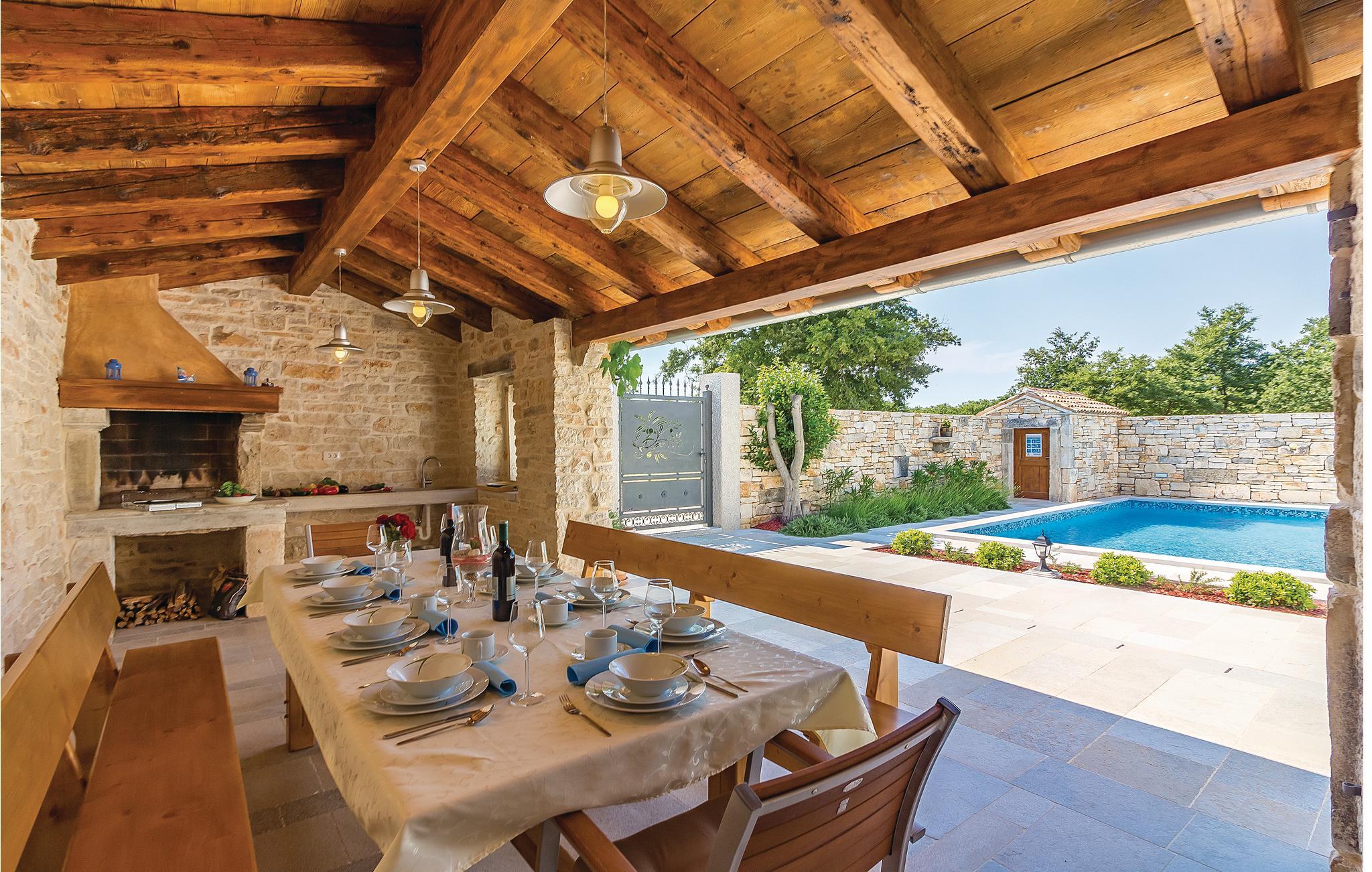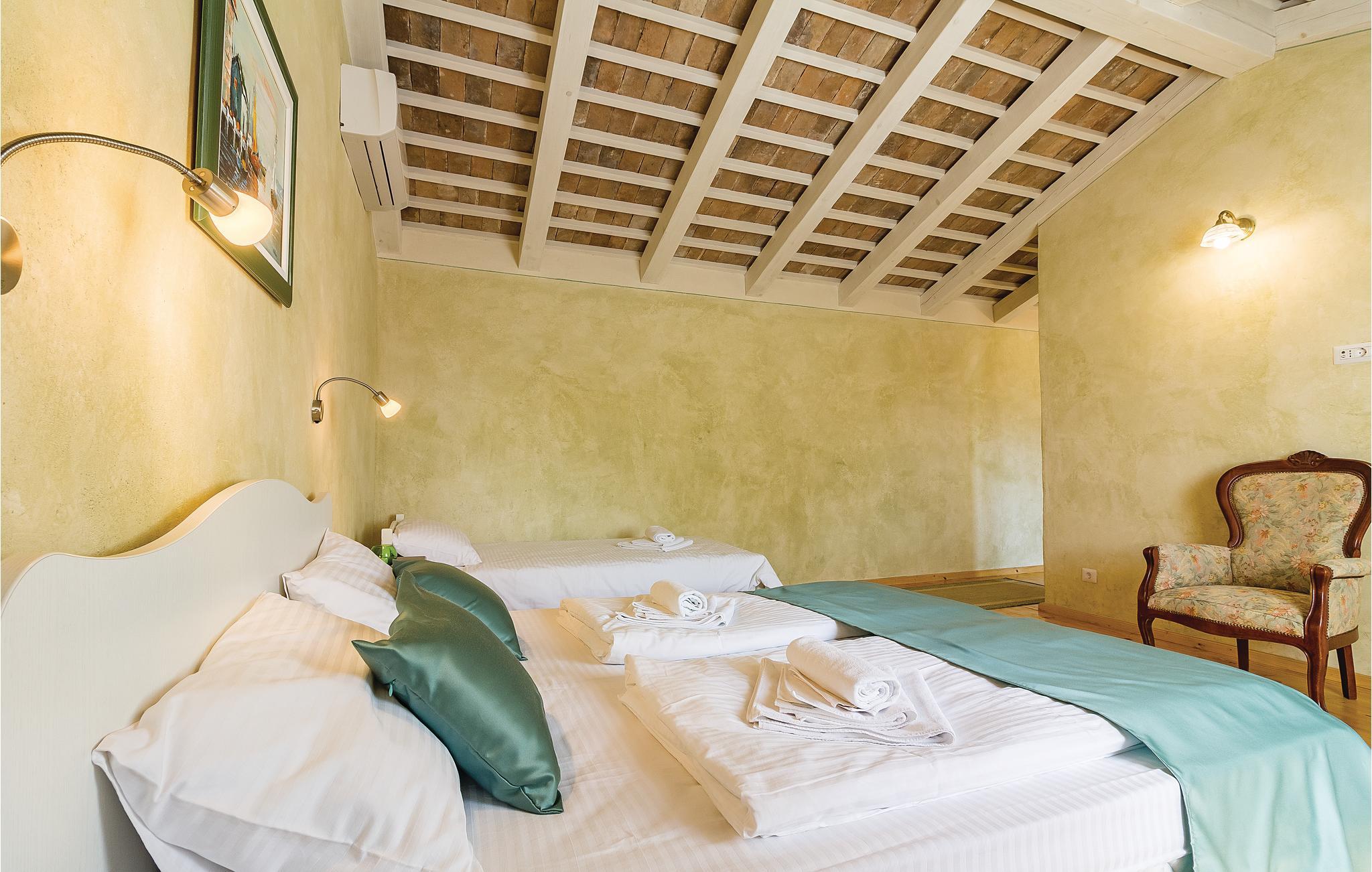 Verbringen Sie einen wunderschönen Urlaub in diesem eindrucksvollen Landhaus, welches komplett renoviert und den heutigen Lebensstandard angepasst wurde. Die traditionelle Bauweise aus Stein und Holz verbunden mit moderner Einrichtung bietet seinen Gästen maximalen Komfort. Im Erdgeschoss sind eine Küche mit Wohn- und Essbereich sowie ein Schlafzimmer mit Bad und eigenem Zugang zum Poolbereich. Im Obergeschoss sind drei Schlafzimmer mit Badezimmern während im Dachgeschoss das größte Schlafzimmer mit Bad und eigener Terrasse ist, von der sich sogar ein teilweiser Meerblick bietet. Hier können Sie den Blick auf den wunderschönen Sonnenuntergang genießen. Neben dem Pool ist eine überdachte Terrasse mit Grill und auf der Rasenfläche daneben gibt es einen Kinderspielbereich sowie einen Volleyball- und Badmintonfeld. An der Vorderseite befindet sich eine zusätzliche Innenhofterrasse, auf der Sie morgens Kaffee trinken und sich entspannen können. Das Haus ist sehr gut eingerichtet und ausgestattet und Sie werden hier sicherlich einen unvergesslichen Urlaub verbringen. Besuchen Sie die nahe gelegenen Orte Fažana, Vodnjan, Pula. In Vodnjan können Sie die Basilika St. Blaise mit dem höchsten Kirchturm Istriens und einer beneidenswerten Sammlung von Mumien besuchen. Von der Uferpromenade aus dem nahe gelegenen Fažana, einem kleinen Fischerdorf, fahren täglich Touristenboote in Richtung Brijuni-Nationalpark. Wenn Sie nach Süden fahren, kommen Sie in Pula an, wo es viele Denkmäler aus der Vergangenheit gibt, wie das römische Amphitheater. Im Norden Istriens sind malerische mittelalterliche Orte zu sehen, wie beispielsweise Motovun, wo jedes Jahr Ende Juli ein internationales Filmfestival stattfindet. Wenn Sie die Halbinsel Istrien entlang fahren, werden Sie auf viele Weinstraßen und lokale Tavernen stoßen, die einheimische Köstlichkeiten anbieten. Es ist sicherlich eine gute Möglichkeit, die lokale Tradition und Bräuche kennenzulernen.
