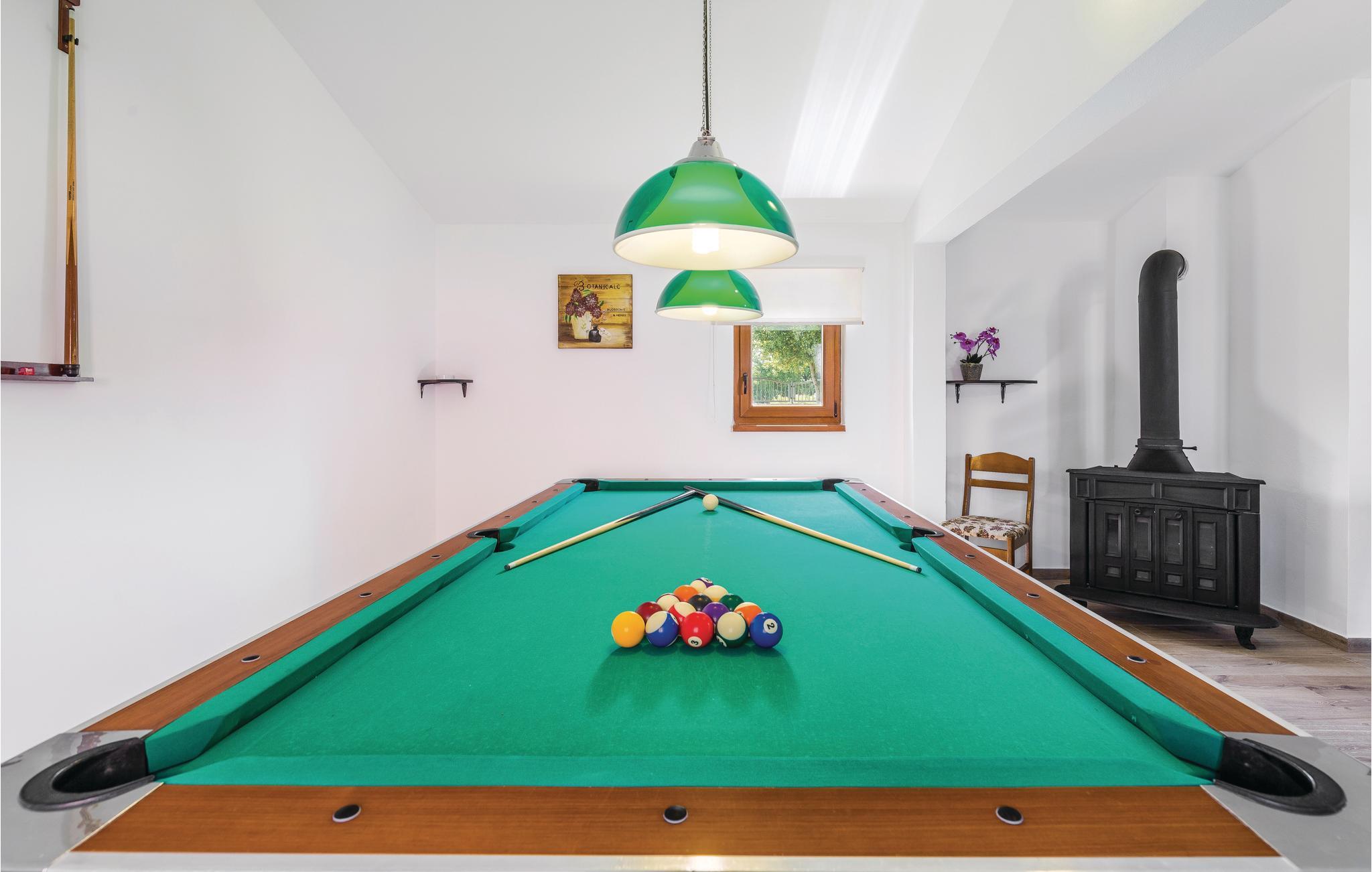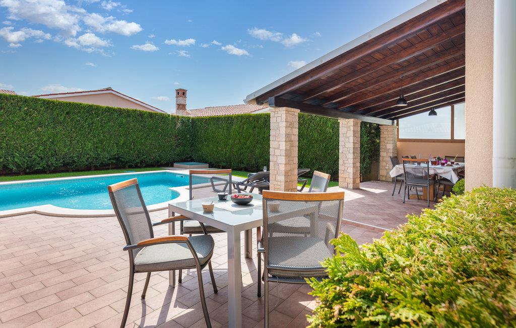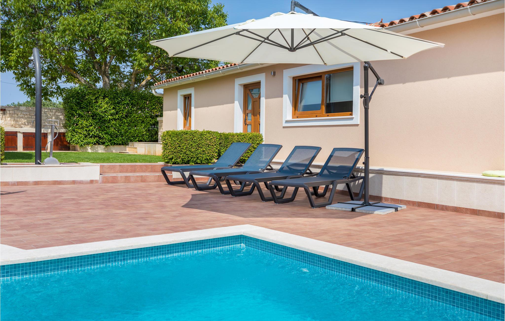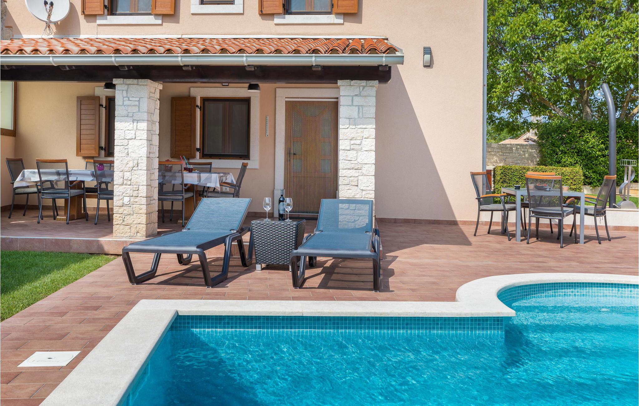 Dieses Ferienhaus bietet ideale Voraussetzungen für einen entspannenden oder aktiven Urlaub. Es besteht aus dem Haupthaus, in dem der Wohnraum und die Schlafräume untergebracht sind. Der Innenbereich ist stilvoll und komfortabel ausgestattet. Im zweiten, kleineren Haus, das separat vom Haupthaus liegt finden Sie einen Billardtisch, ein elektronisches Dartspiel, Tischfußball, sowie eine Sauna und einige Fitnessgeräte. Auf dem komplett geschlossenen Grundstück steht Ihnen ein Außenpool zur Verfügung, der für Abkühlung nach dem Sonnenbad sorgt. Auf der schönen Terrasse können Sie gesellig beisammensein, und leckere Grillgerichte genießen. Ein Spielhaus, Schaukel und eine Rutsche werden die mitreisenden Kinder begeistern. Dieses Haus ist ein guter Ausgangspunkt für Ausflüge an die Küste oder auch in das Inland Istriens. Hier finden Sie ein reiches, gastronomische Angebot, freundliche Einwohner und viele kulturelle Ereignisse.