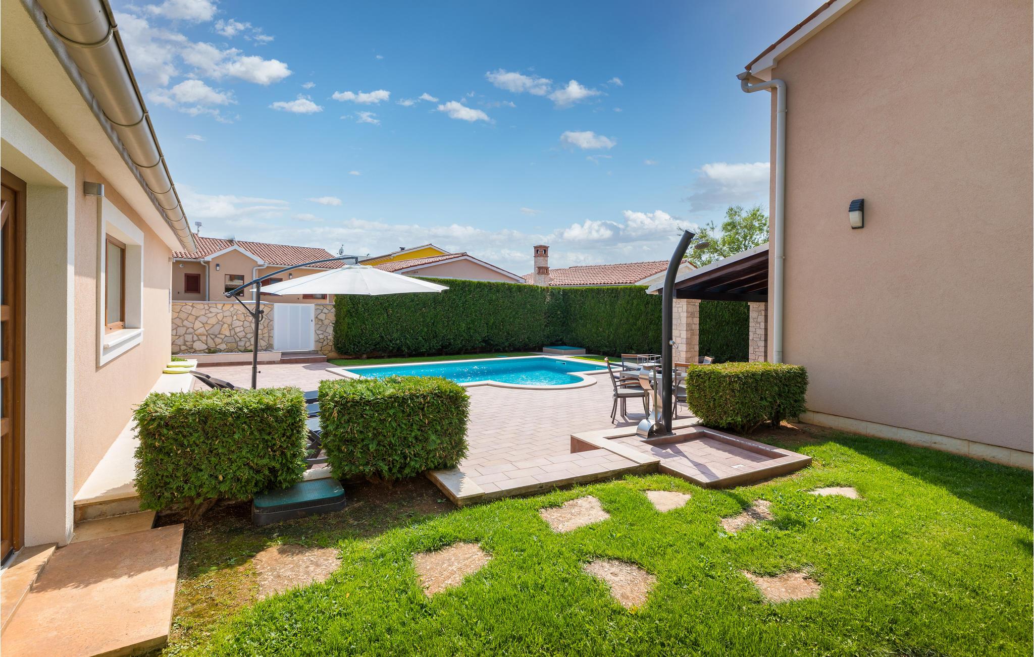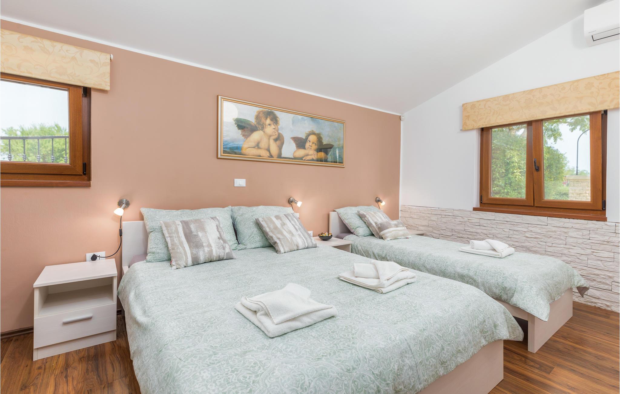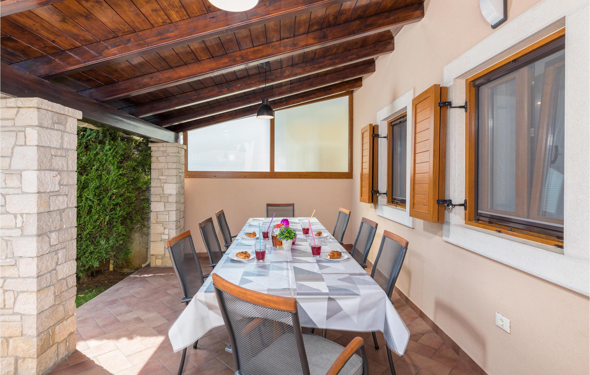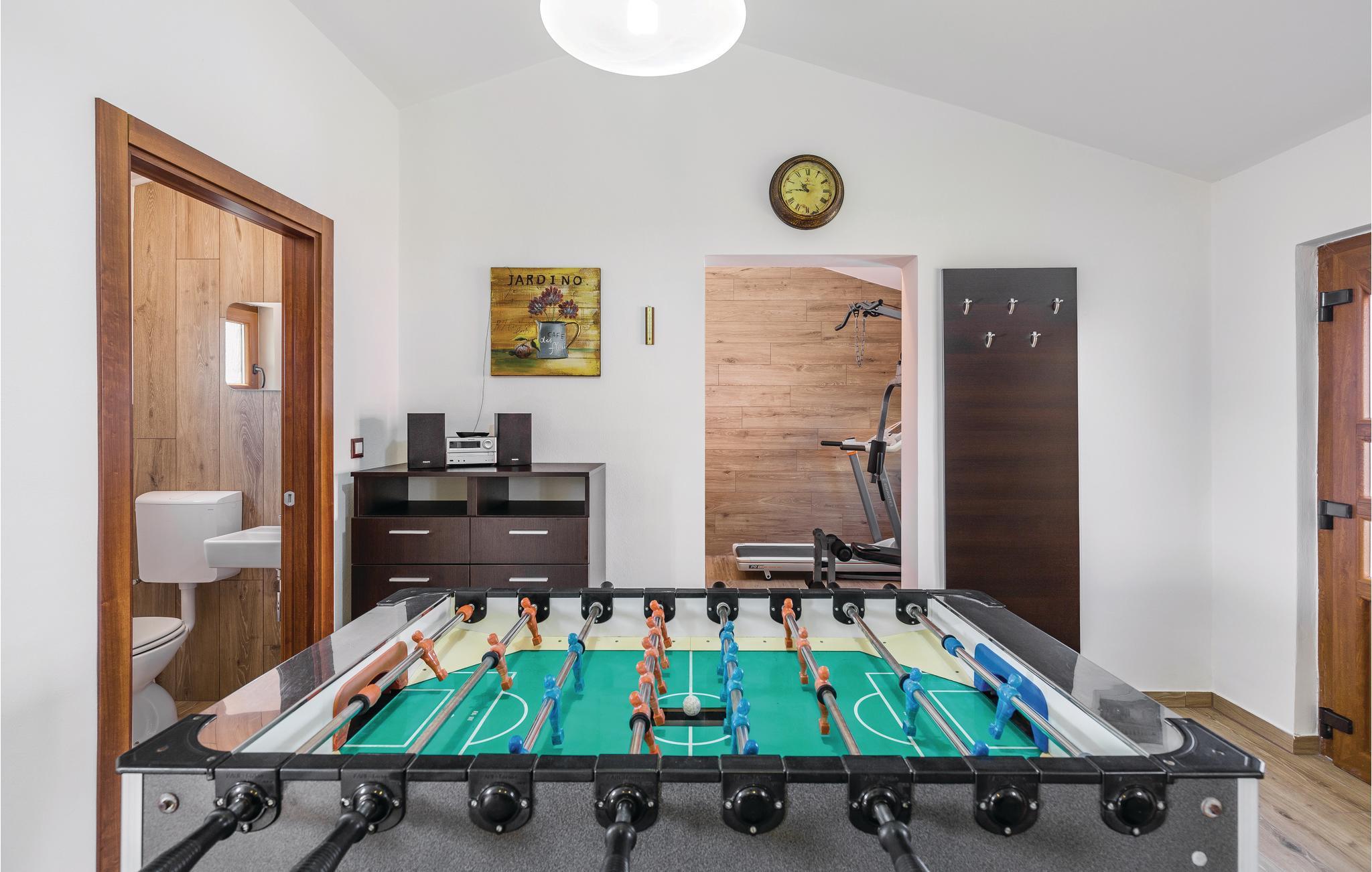 Dieses Ferienhaus bietet ideale Voraussetzungen für einen entspannenden oder aktiven Urlaub. Es besteht aus dem Haupthaus, in dem der Wohnraum und die Schlafräume untergebracht sind. Der Innenbereich ist stilvoll und komfortabel ausgestattet. Im zweiten, kleineren Haus, das separat vom Haupthaus liegt finden Sie einen Billardtisch, ein elektronisches Dartspiel, Tischfußball, sowie eine Sauna und einige Fitnessgeräte. Auf dem komplett geschlossenen Grundstück steht Ihnen ein Außenpool zur Verfügung, der für Abkühlung nach dem Sonnenbad sorgt. Auf der schönen Terrasse können Sie gesellig beisammensein, und leckere Grillgerichte genießen. Ein Spielhaus, Schaukel und eine Rutsche werden die mitreisenden Kinder begeistern. Dieses Haus ist ein guter Ausgangspunkt für Ausflüge an die Küste oder auch in das Inland Istriens. Hier finden Sie ein reiches, gastronomische Angebot, freundliche Einwohner und viele kulturelle Ereignisse.