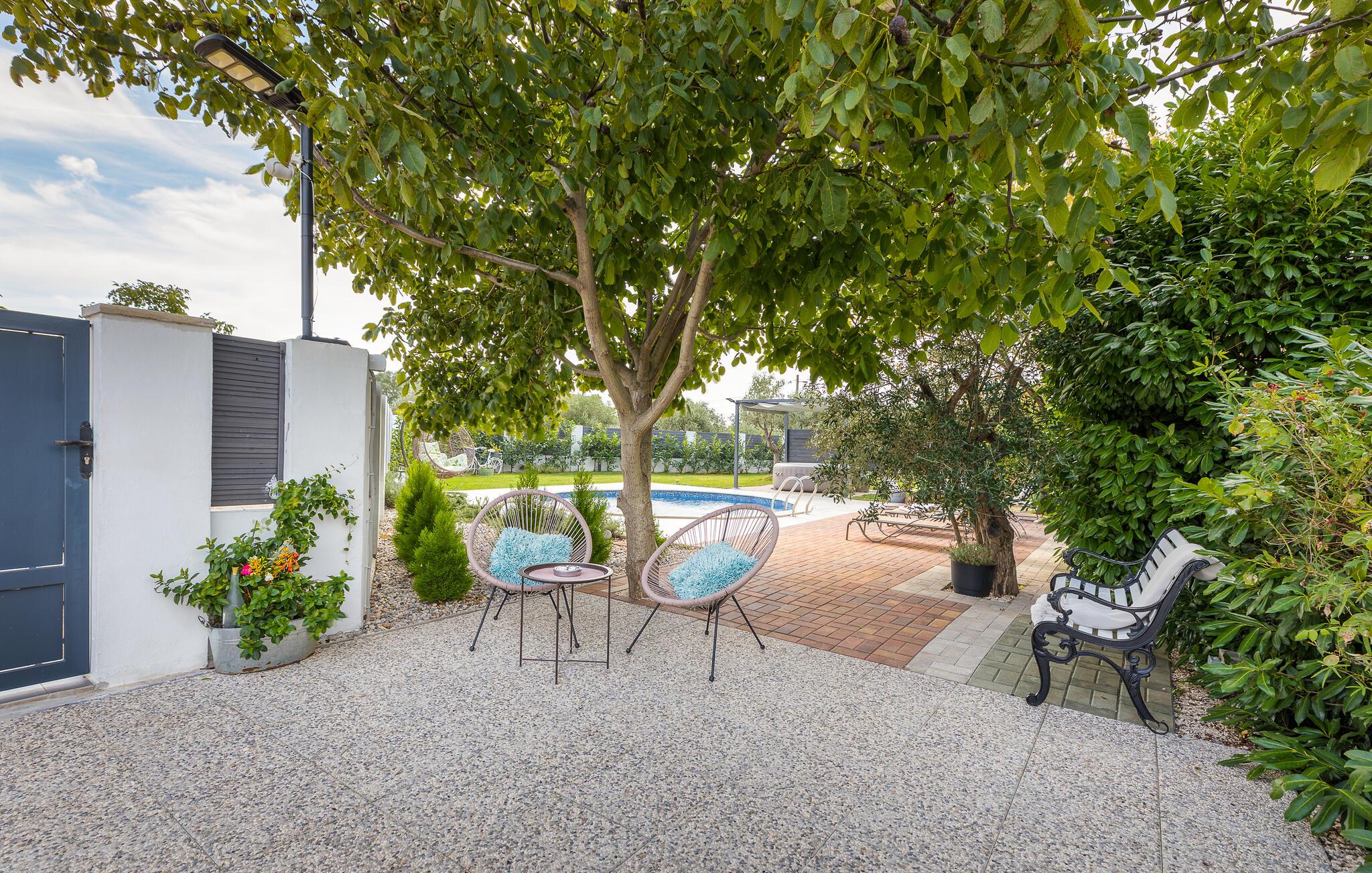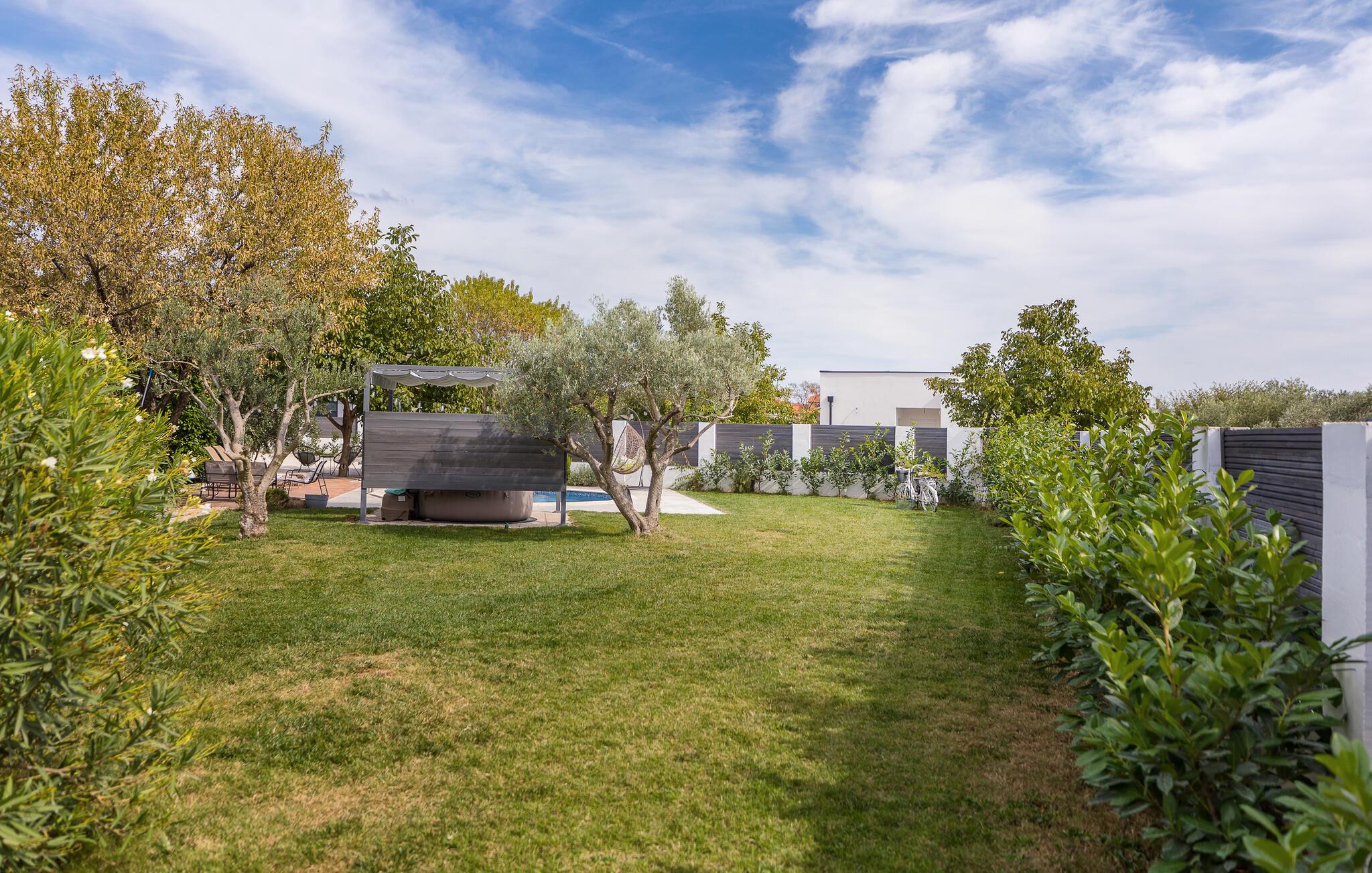 Auf einem großen Grundstück befindet sich ein Swimmingpool mit Sonnendeck und ein überdachter Whirlpool. Für einige Aktivitäten steht Ihnen ein Netz für Badminton und Schläger zur Verfügung, während für die Kleinsten auch ein Trampolin vorhanden ist.