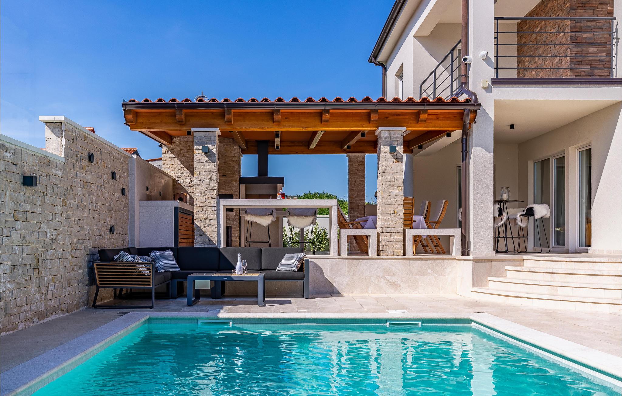 Geschmackvolles Ferienhaus mit großzügigem Bereich im Freien, Pool, Grill und Außenküche.