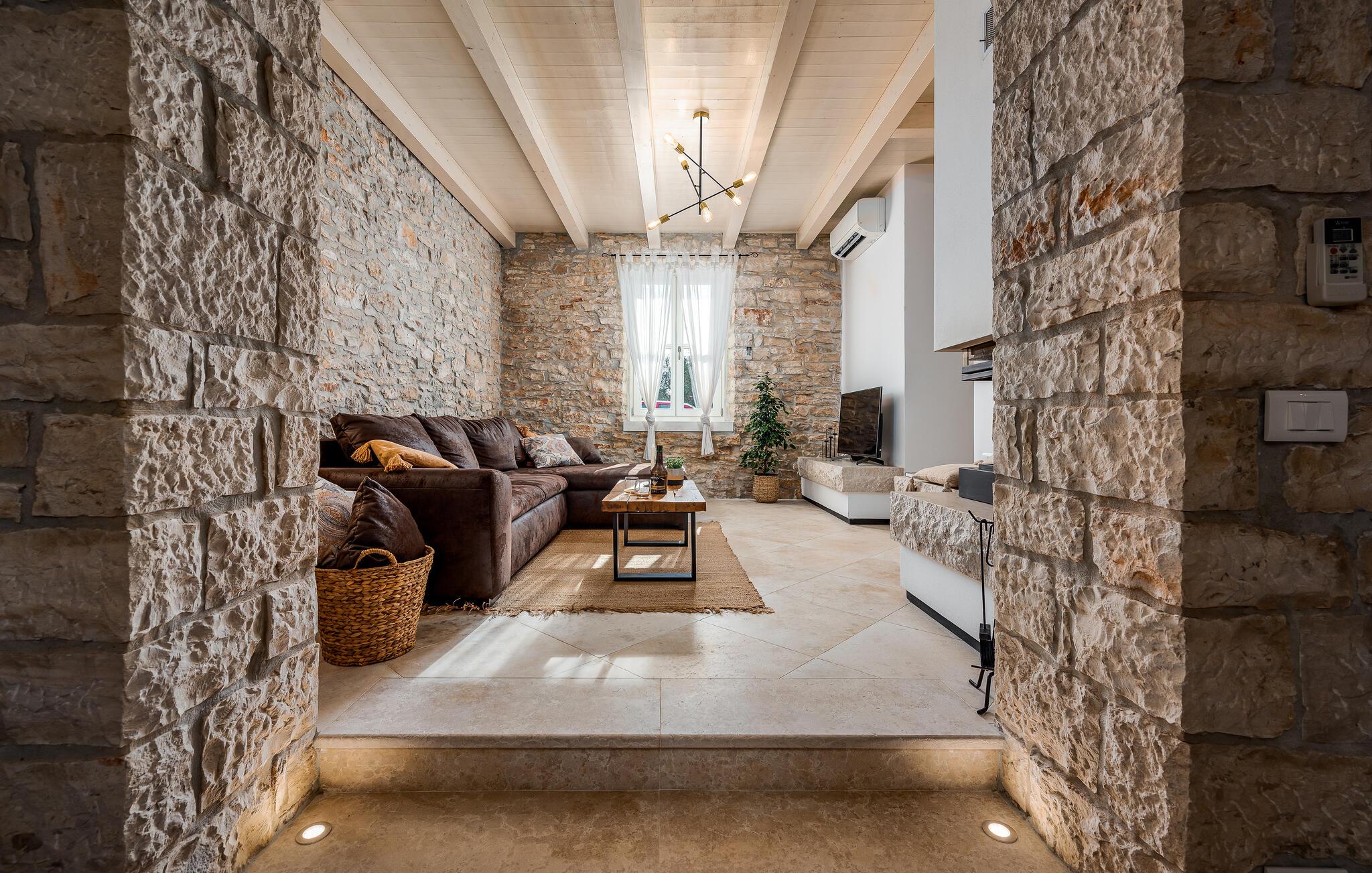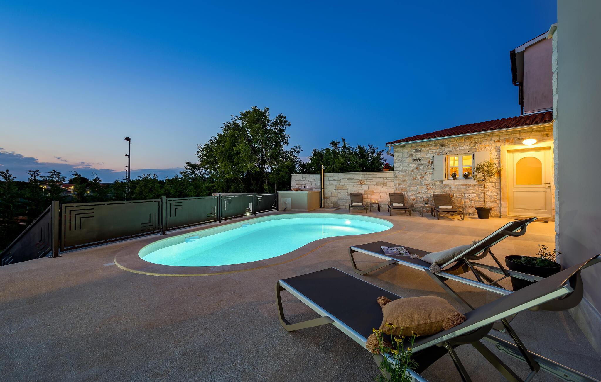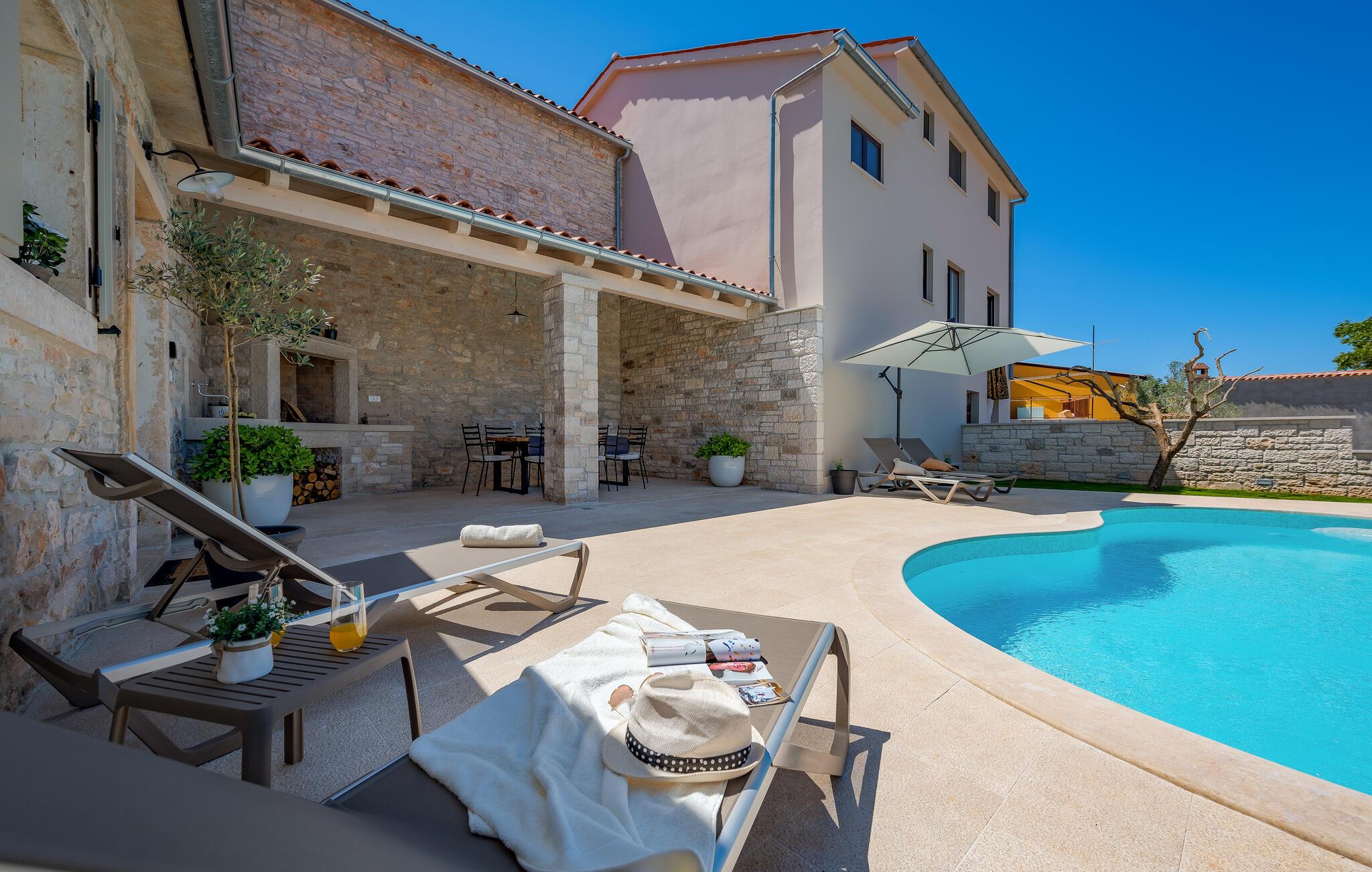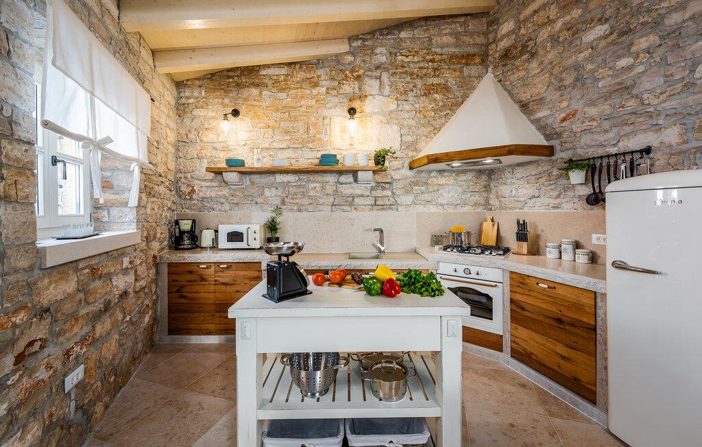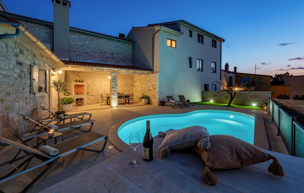 Etwas nördlich von Pula gelegen, begrüßt Sie dieses charmante Ferienhaus zu einem fantastischen Istrien-Urlaub. Die harmonische Kombination aus traditionellem Steinbau und modernem Komfort, die das gesamte Ferienhaus bestimmt, bietet Ihnen eine urgemütliche Stimmung fern vom Stress und der Hektik des Alltags. Die schöne Küche lädt zum gemeinsamen Kochen ein, während der Essbereich mit dem urigen Holztisch der ideale Ort für gesellige Mahlzeiten ist. Entspannen Sie sich im einladenden Wohnzimmer mit dem bequemen Sofa, wo Sie zu lustigen Spieleabenden zusammenkommen oder einfach mit einem guten Buch verweilen können. Auch draußen erwarten Sie zahlreiche Möglichkeiten zum Entspannen und Genießen. Machen Sie einen erfrischenden Sprung in den Pool und relaxen Sie anschließend auf einer der bequemen Liegen. Für sportlich Aktive bietet sich der benachbarte Tennisplatz an, während die überdachte Grillterrasse kulinarische Höhepunkte beim abendlichen Grillen verspricht.
