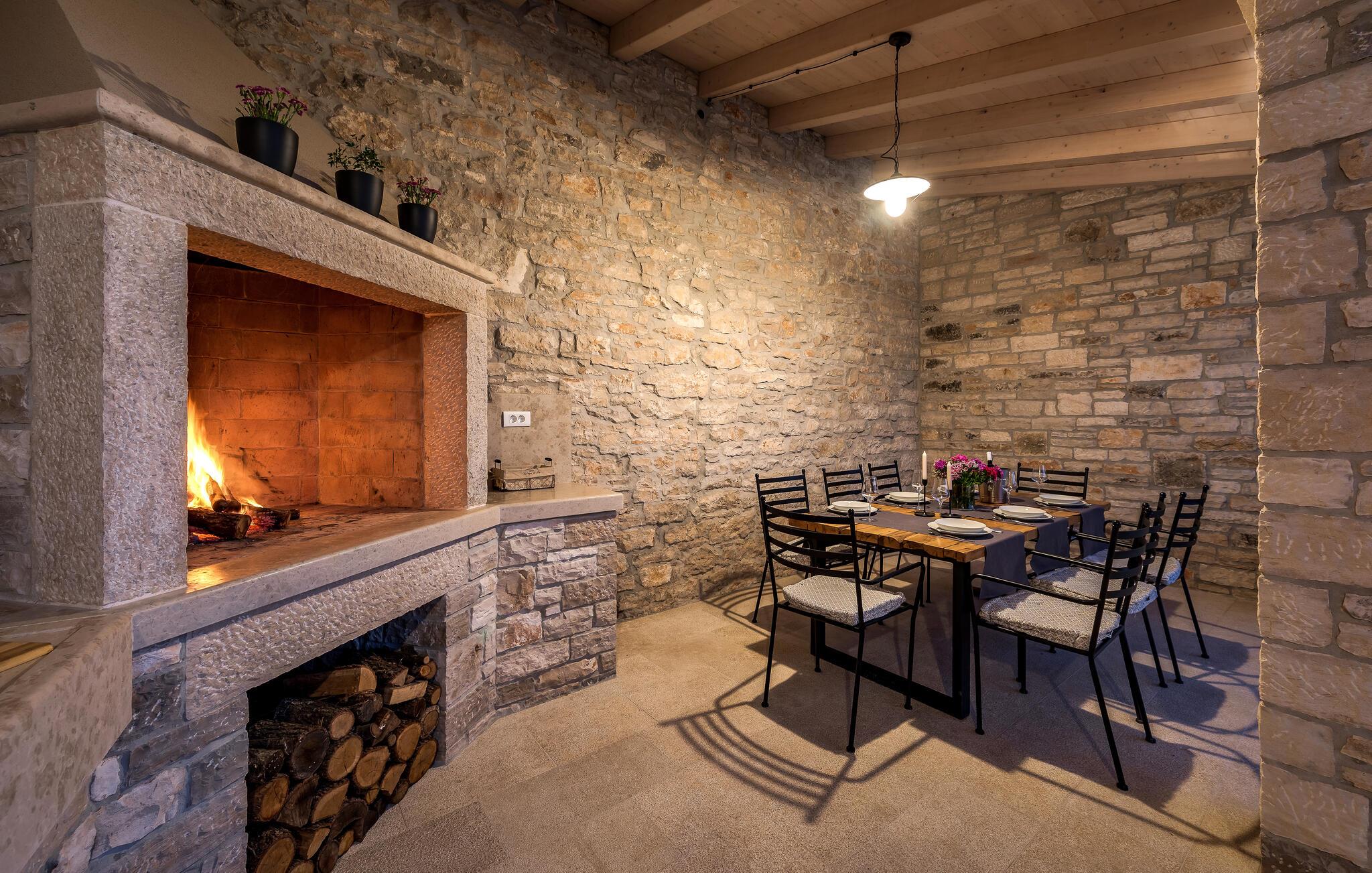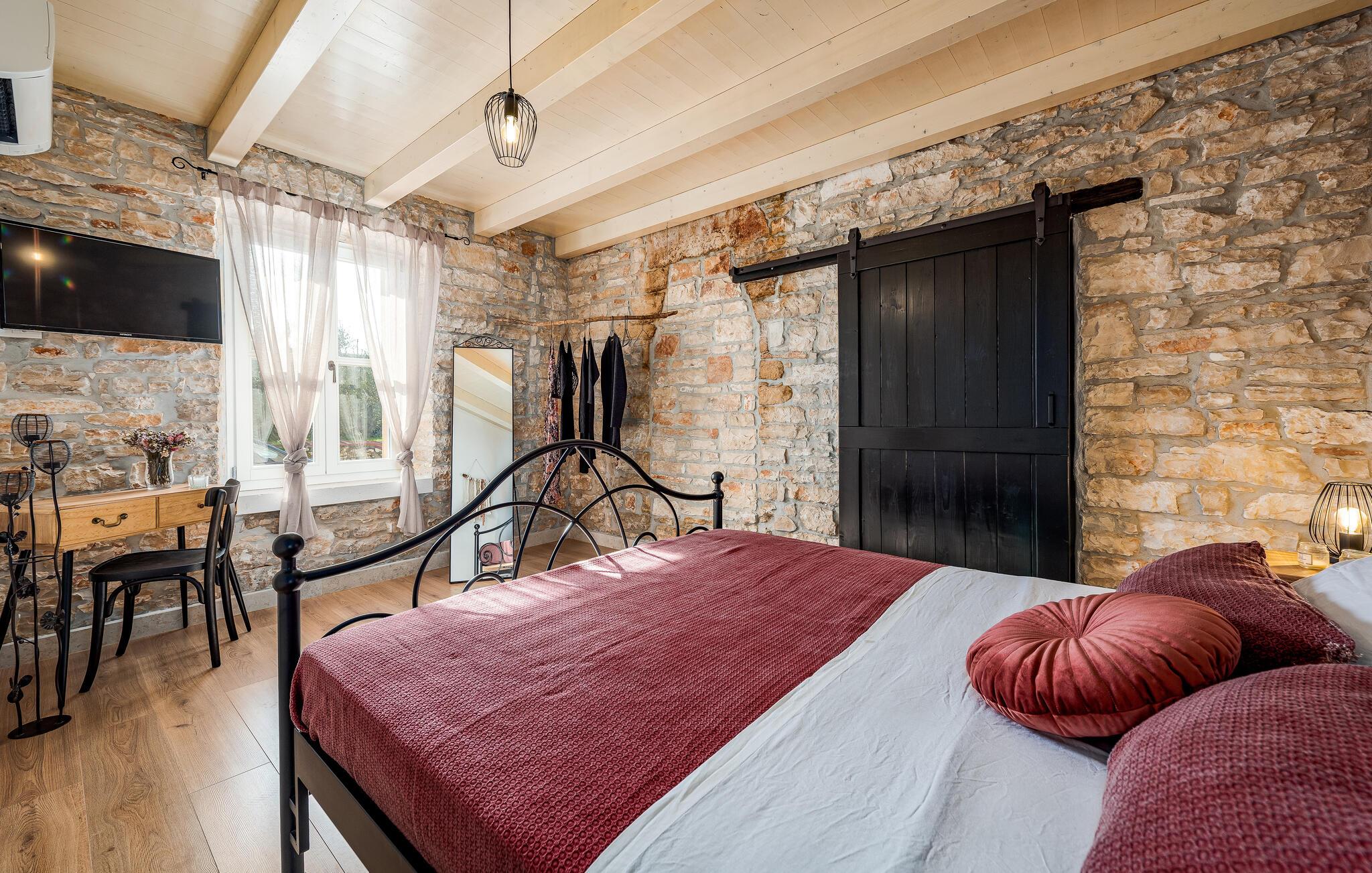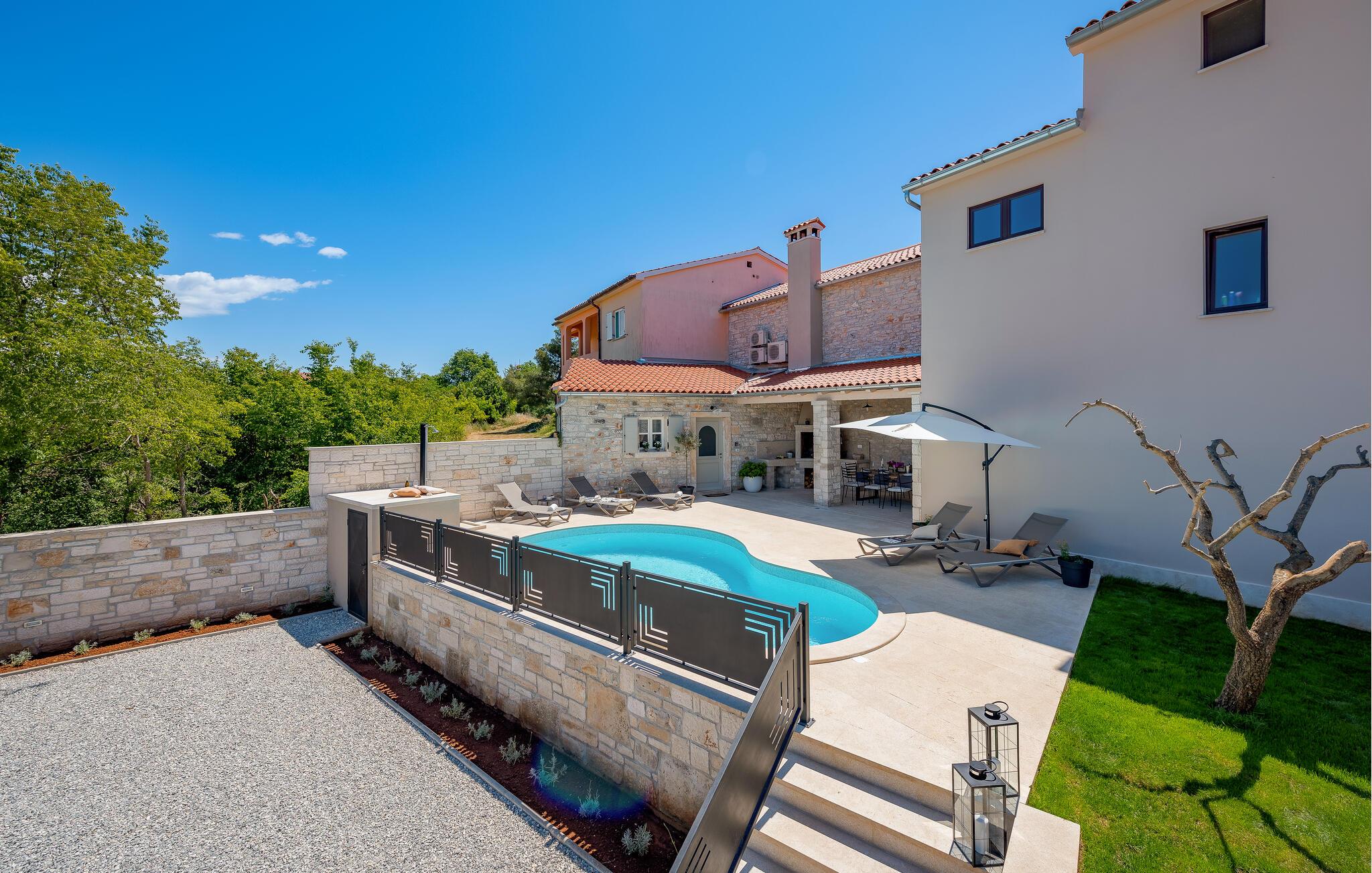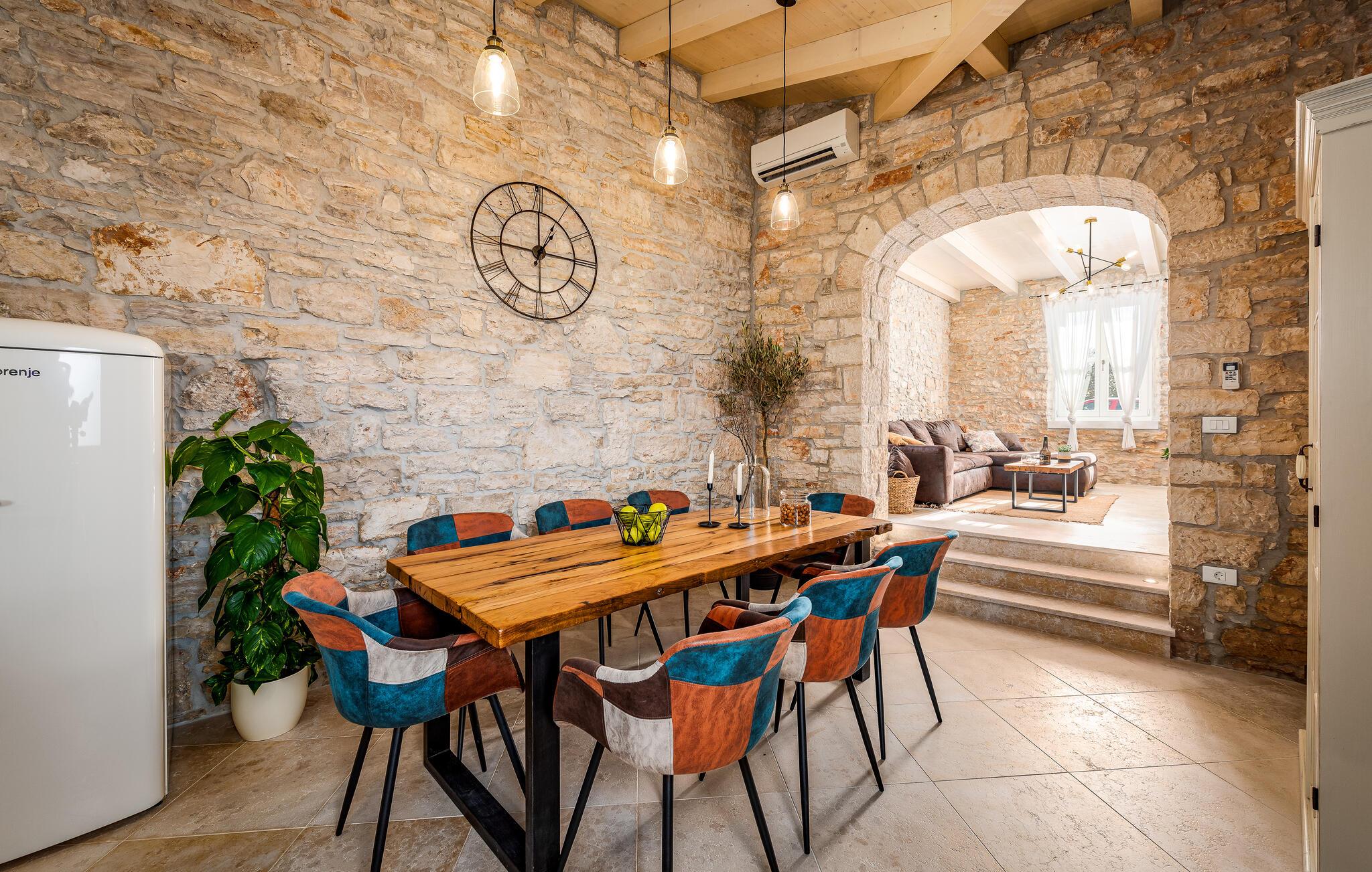 Etwas nördlich von Pula gelegen, begrüßt Sie dieses charmante Ferienhaus zu einem fantastischen Istrien-Urlaub. Die harmonische Kombination aus traditionellem Steinbau und modernem Komfort, die das gesamte Ferienhaus bestimmt, bietet Ihnen eine urgemütliche Stimmung fern vom Stress und der Hektik des Alltags. Die schöne Küche lädt zum gemeinsamen Kochen ein, während der Essbereich mit dem urigen Holztisch der ideale Ort für gesellige Mahlzeiten ist. Entspannen Sie sich im einladenden Wohnzimmer mit dem bequemen Sofa, wo Sie zu lustigen Spieleabenden zusammenkommen oder einfach mit einem guten Buch verweilen können. Auch draußen erwarten Sie zahlreiche Möglichkeiten zum Entspannen und Genießen. Machen Sie einen erfrischenden Sprung in den Pool und relaxen Sie anschließend auf einer der bequemen Liegen. Für sportlich Aktive bietet sich der benachbarte Tennisplatz an, während die überdachte Grillterrasse kulinarische Höhepunkte beim abendlichen Grillen verspricht.