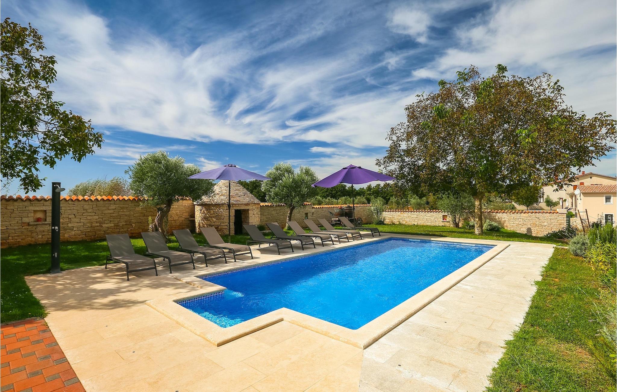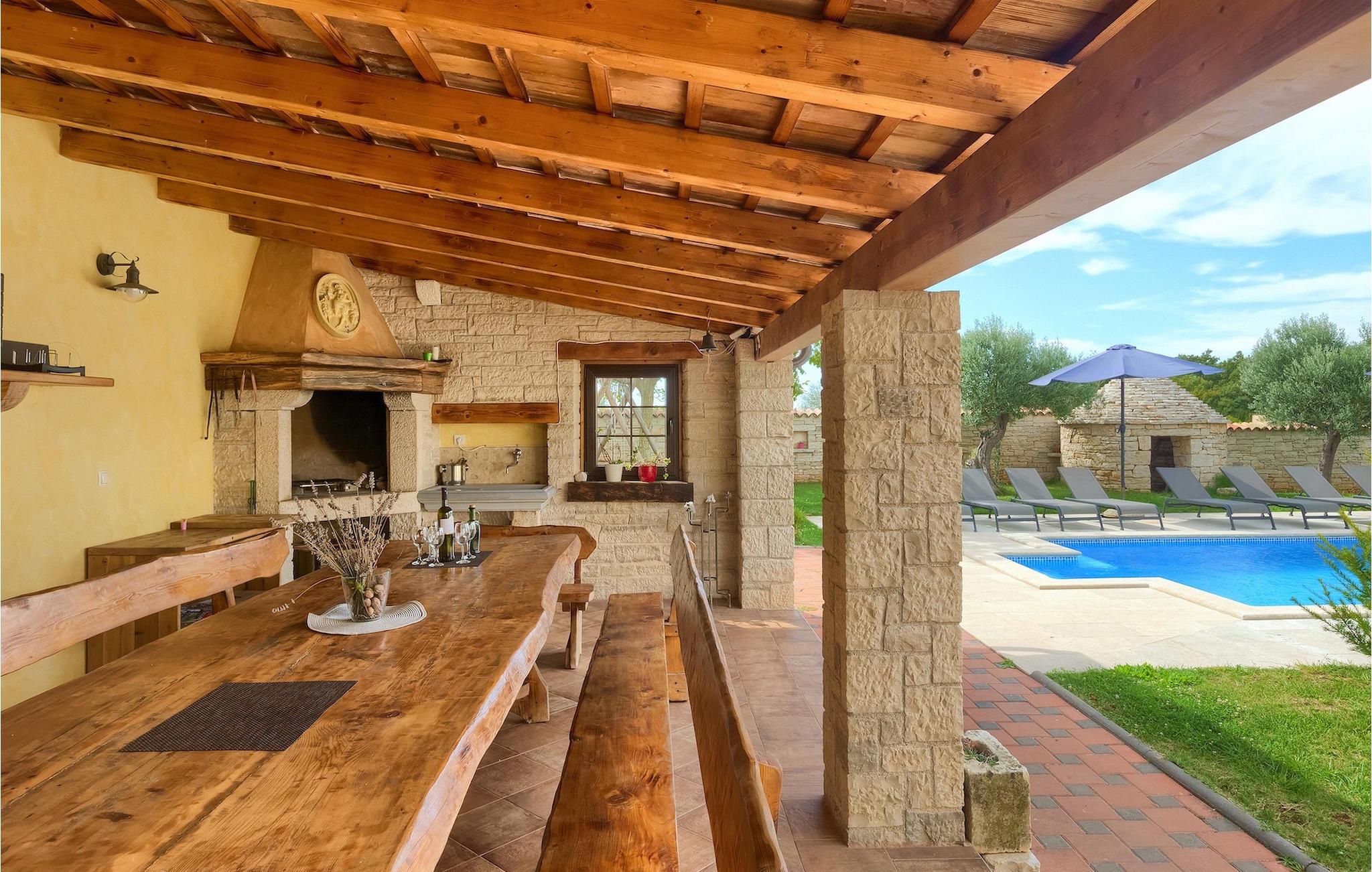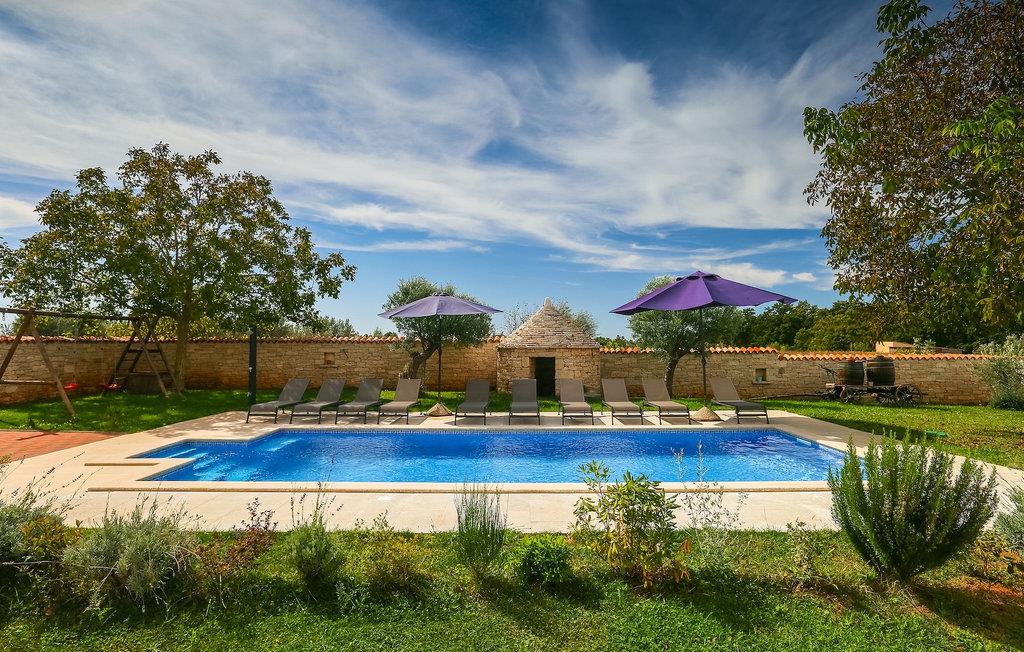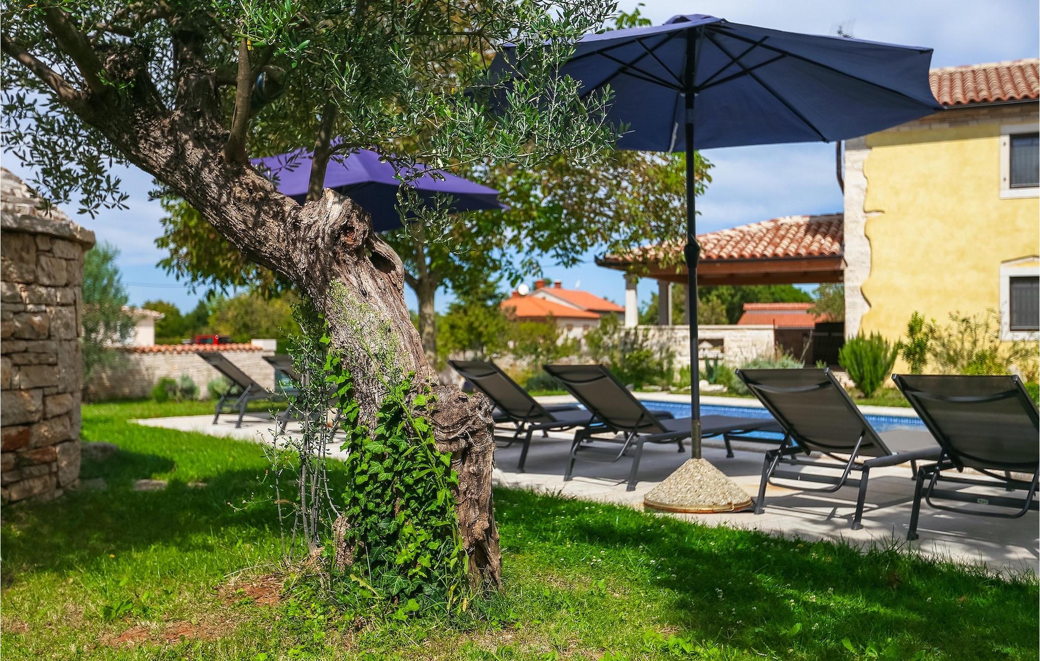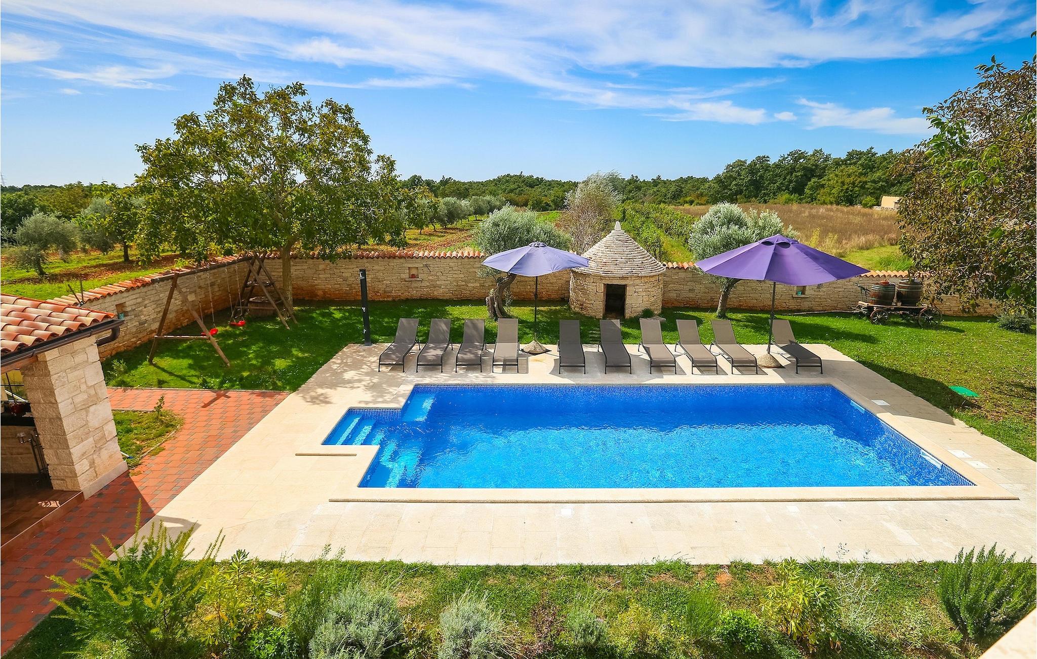 Die authentische Villa Ive befindet sich im istrischen Hinterland nicht weit von touristischen Städten wie Vodnjan oder Pula. Die schöne Villa kombiniert moderne Möbeln mit traditionellen Elementen wie freiliegende Holzbalken und Stein. Hier finden Sie Unterkunft für bis zu 12 Gäste in 5 Schlafzimmer mit Doppelbetten, eines befindet sich im Erdgeschoss, während die anderen 4 im ersten Stock verteilt sind. Alle Schlafzimmer verfügen über Klimaanlagen und zwei Schlafzimmer mit schönen Balkons die auf die grünen Berge und romantische Dörfer im Hintergrund. Das stilvolle und angenehme Wohnzimmer ist mit der komplett ausgestatteten Küche verbunden und bietet auch einen kleinen Kamin an, für kältere Abende. Draußen finden Sie einen herrlichen großen, gepflegten Garten der Villa Ive mit einem istrischen Kazun (antike istrische Siedlungen) direkt neben dem einladenden Pool, umgeben von Liegestühlen, die der perfekte Ort sind, um sich zu entspannen und sich im einladenden Pool zu erfrischen. Es gibt auch einen schönen überdachten Essbereich im Freien mit einem großen Holztisch und einem traditionellen Grillplatz, der sich perfekt für Versammlungen und Abendessen mit Blick auf den Pool eignet. Genießen Sie den großen, gepflegten Garten, der auch Aktivitäten für Kinder bietet, falls Sie mit der Familie verreisen. Beginnen Sie Ihren Urlaub in dieser fantastischen Villa!Die traumhafte Villa Ive befindet sich im kleinen, malerischen Ort Orbanici in Zentralistrien. Hier können Sie das magische Istrische Hinterland entdecken mit wunderbarer Natur und allen köstlichen Spezialitäten wie Trüffel, hausgemachter Honig, Käse, Prosciutto-Schinken und vieles mehr! Die ersten Strände befinden sich 10 km entfernt von der Villa in der Nähe von Fazana. Von hier kommen Sie schnell zu der beeindruckenden Insel und Nationalpark Brijuni mit der Fähre oder mit einem Bootsausflug. In der Nähe befindet sich auch das größte Touristenzentrum Pula mit dem atemberaubenden Amphitheater und zahlreichen Restaurants, Bars und reichen Nachtleben. Etwa 5 km entfernt von der Villa befindet sich auch ein Adrenalin Park, ideal für einen amüsanten Tagesausflug für die ganze Familie. Wenn Sie charmante Kleinstädte erkunden möchten, besuchen Sie auch mittelalterlichen Orte wie Svetvincenat, Vodnjan und Bale, die für ihre malerischen Plätze, engen Gassen, Tavernen, Geschäfte und Bars bekannt sind. Villa Ive erwartet Sie!