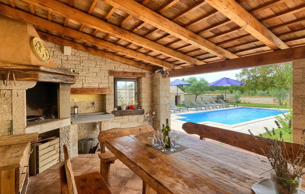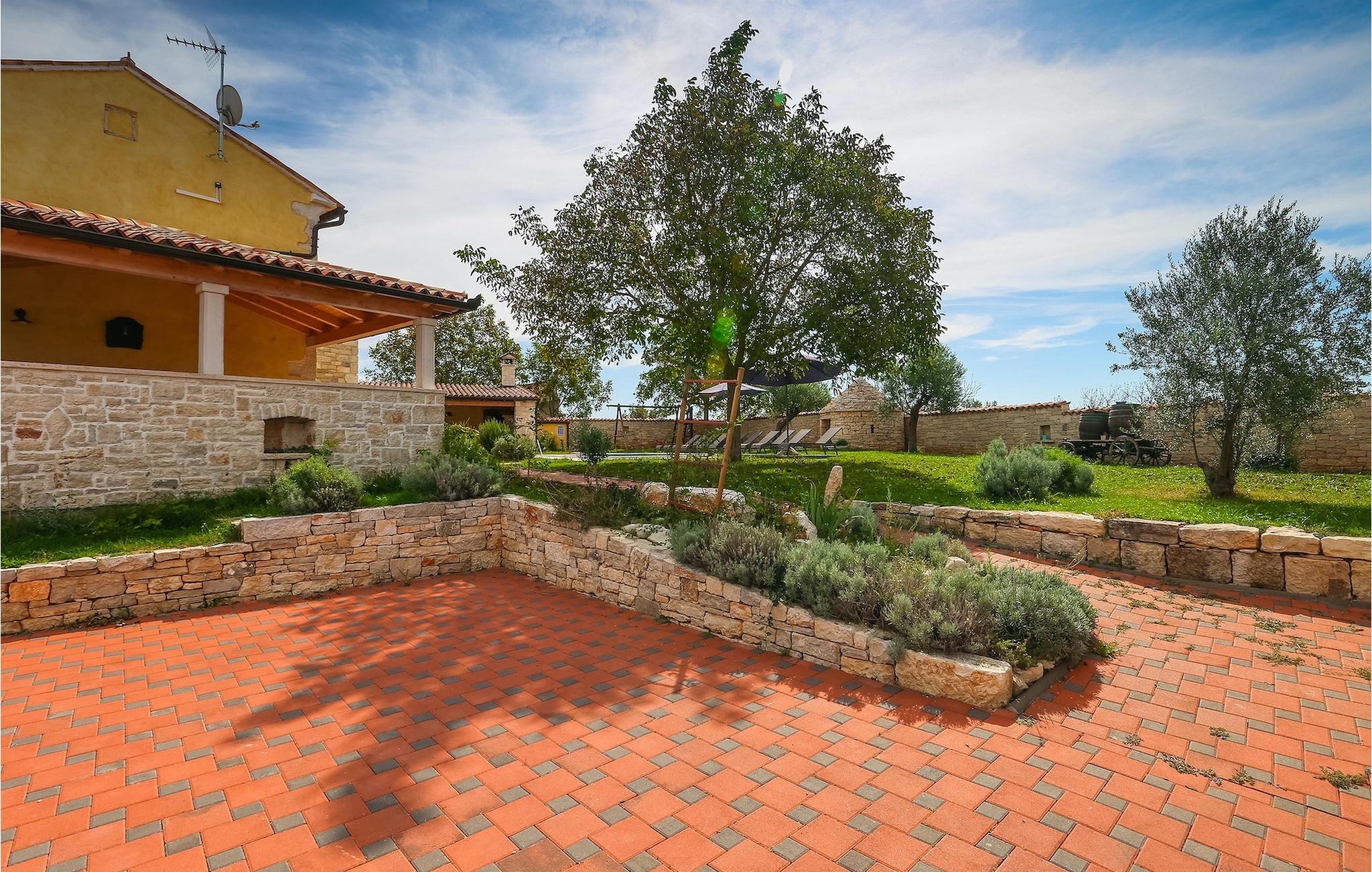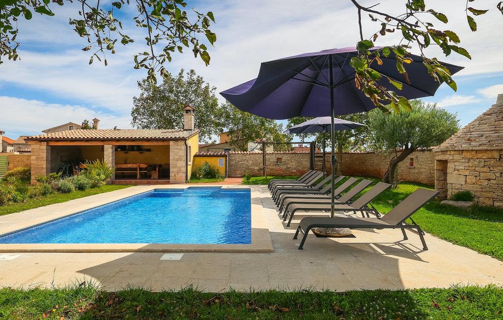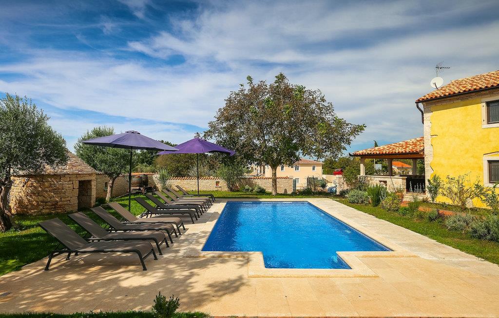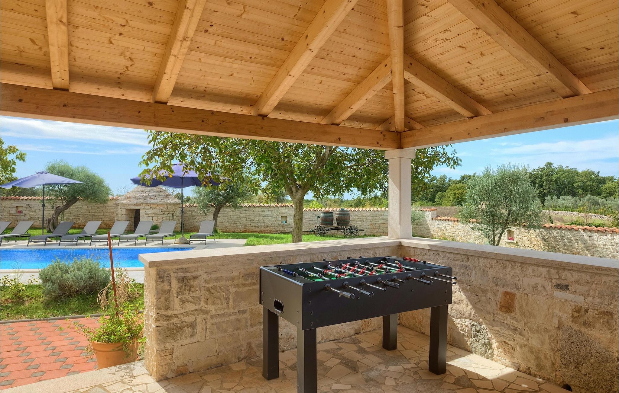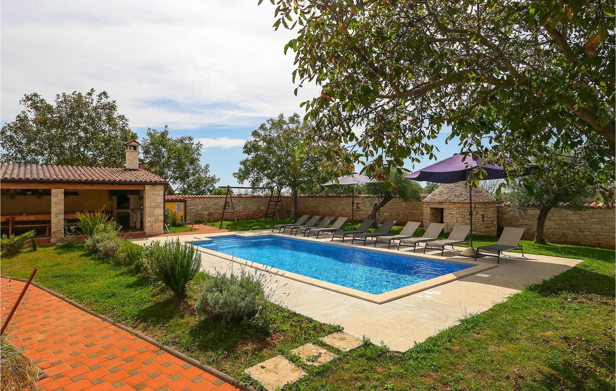 Die authentische Villa Ive befindet sich im istrischen Hinterland nicht weit von touristischen Städten wie Vodnjan oder Pula. Die schöne Villa kombiniert moderne Möbeln mit traditionellen Elementen wie freiliegende Holzbalken und Stein. Hier finden Sie Unterkunft für bis zu 12 Gäste in 5 Schlafzimmer mit Doppelbetten, eines befindet sich im Erdgeschoss, während die anderen 4 im ersten Stock verteilt sind. Alle Schlafzimmer verfügen über Klimaanlagen und zwei Schlafzimmer mit schönen Balkons die auf die grünen Berge und romantische Dörfer im Hintergrund. Das stilvolle und angenehme Wohnzimmer ist mit der komplett ausgestatteten Küche verbunden und bietet auch einen kleinen Kamin an, für kältere Abende. Draußen finden Sie einen herrlichen großen, gepflegten Garten der Villa Ive mit einem istrischen Kazun (antike istrische Siedlungen) direkt neben dem einladenden Pool, umgeben von Liegestühlen, die der perfekte Ort sind, um sich zu entspannen und sich im einladenden Pool zu erfrischen. Es gibt auch einen schönen überdachten Essbereich im Freien mit einem großen Holztisch und einem traditionellen Grillplatz, der sich perfekt für Versammlungen und Abendessen mit Blick auf den Pool eignet. Genießen Sie den großen, gepflegten Garten, der auch Aktivitäten für Kinder bietet, falls Sie mit der Familie verreisen. Beginnen Sie Ihren Urlaub in dieser fantastischen Villa!Die traumhafte Villa Ive befindet sich im kleinen, malerischen Ort Orbanici in Zentralistrien. Hier können Sie das magische Istrische Hinterland entdecken mit wunderbarer Natur und allen köstlichen Spezialitäten wie Trüffel, hausgemachter Honig, Käse, Prosciutto-Schinken und vieles mehr! Die ersten Strände befinden sich 10 km entfernt von der Villa in der Nähe von Fazana. Von hier kommen Sie schnell zu der beeindruckenden Insel und Nationalpark Brijuni mit der Fähre oder mit einem Bootsausflug. In der Nähe befindet sich auch das größte Touristenzentrum Pula mit dem atemberaubenden Amphitheater und zahlreichen Restaurants, Bars und reichen Nachtleben. Etwa 5 km entfernt von der Villa befindet sich auch ein Adrenalin Park, ideal für einen amüsanten Tagesausflug für die ganze Familie. Wenn Sie charmante Kleinstädte erkunden möchten, besuchen Sie auch mittelalterlichen Orte wie Svetvincenat, Vodnjan und Bale, die für ihre malerischen Plätze, engen Gassen, Tavernen, Geschäfte und Bars bekannt sind. Villa Ive erwartet Sie!