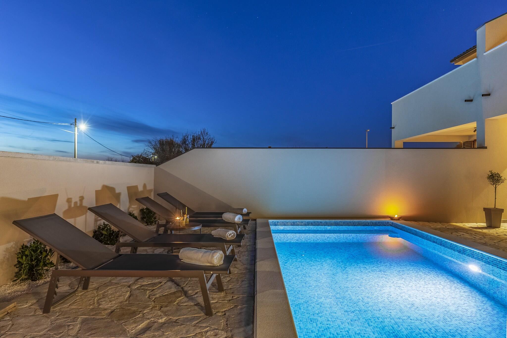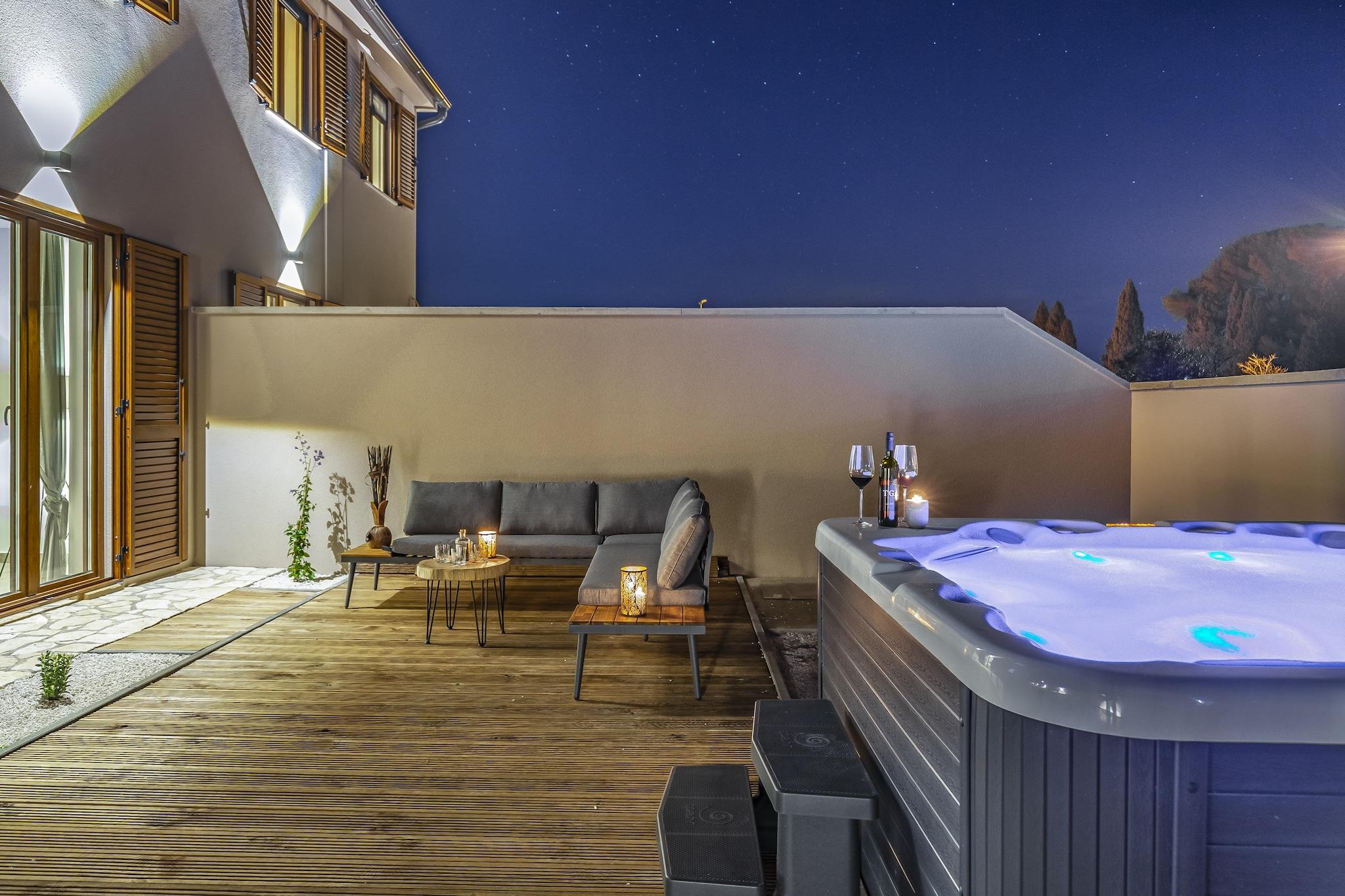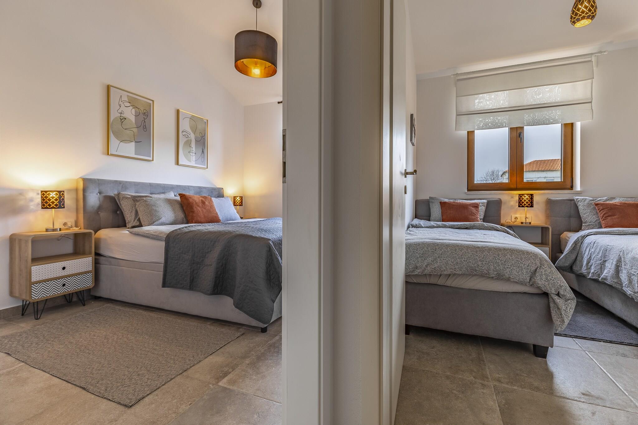 Diese geräumige Villa mit 3 Schlafzimmern liegt nur 1 km vom Zentrum von Vodnjan entfernt und bietet Platz für bis zu 7 Gäste. Sie bietet einen erholsamen Rückzugsort nahe der istrischen Küste. Meer und Strand sind nur 5 km und der Flughafen Pula nur 9 km entfernt. Somit ist sie ein idealer Ausgangspunkt, um die kulturellen und natürlichen Highlights der Region zu erkunden. Die Villa verfügt über eine voll ausgestattete Küche, ein gemütliches Wohnzimmer mit Sat-TV und zwei Badezimmer, eines davon en-suite mit Balkon. Die Schlafzimmer sind klimatisiert. Zur weiteren Ausstattung gehören ein Waschraum, ein Kinderbett und ein Hochstuhl. Im Außenbereich erwarten Sie eine private Terrasse, ein eingezäunter Garten und ein Grillplatz – ideal für Mahlzeiten im Freien. Gäste können im privaten Whirlpool, in der Sauna oder im Außenpool entspannen. Kinder werden die Spielgeräte, Tischtennis und Tischfußball lieben, während Erwachsene auf den Sonnenliegen entspannen oder sich im Gartenmöbel entspannen können. Kostenlose Parkplätze und WLAN sind inklusive.