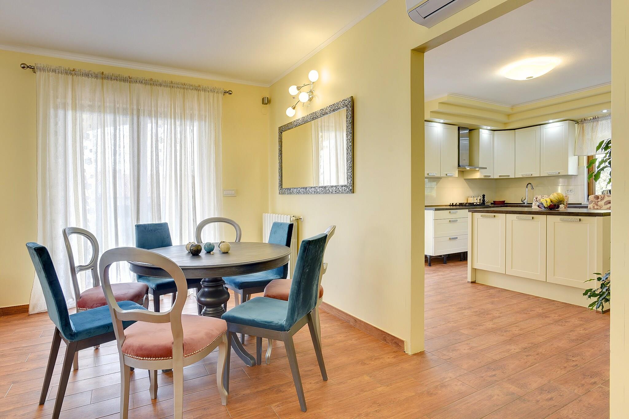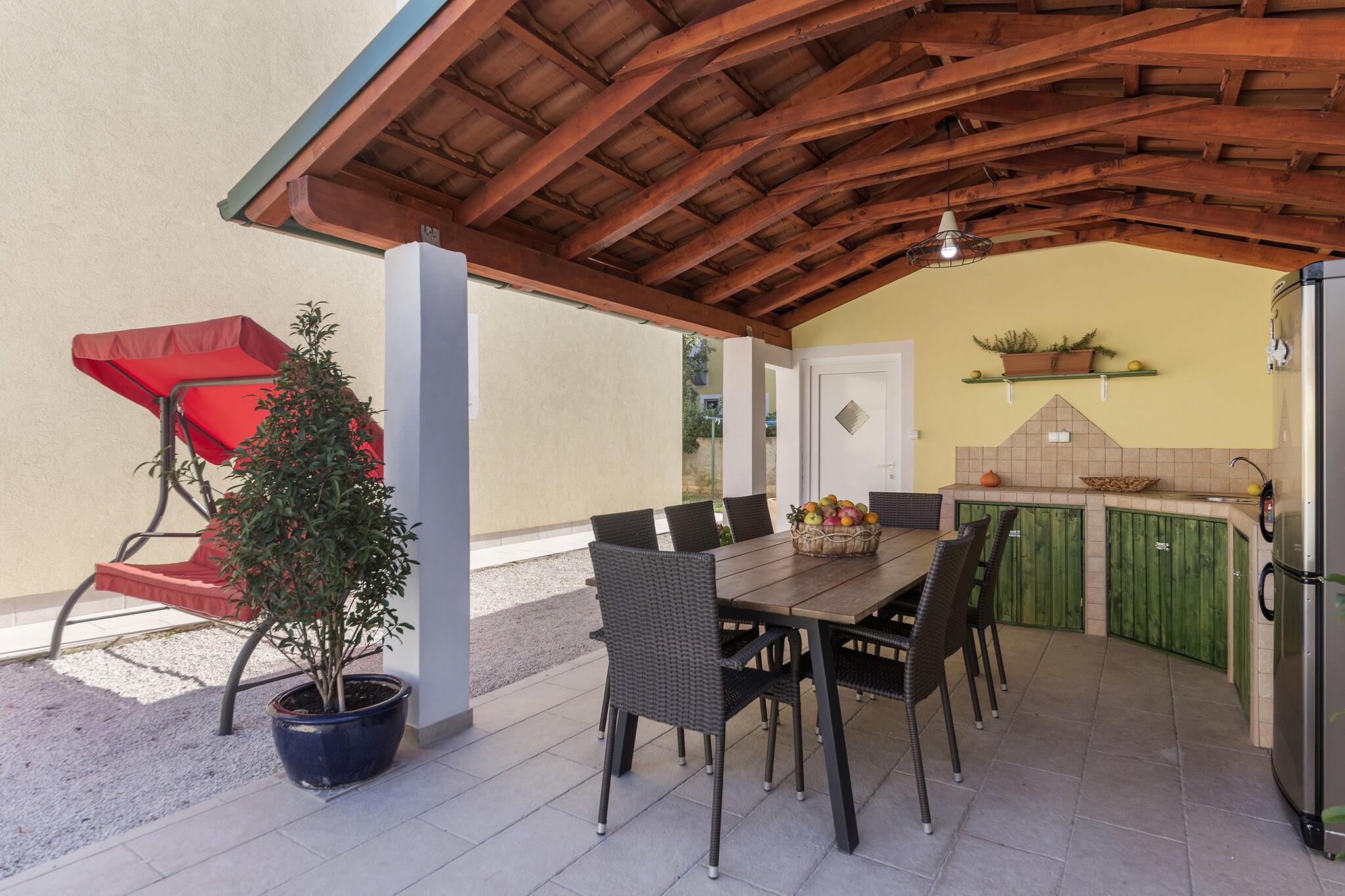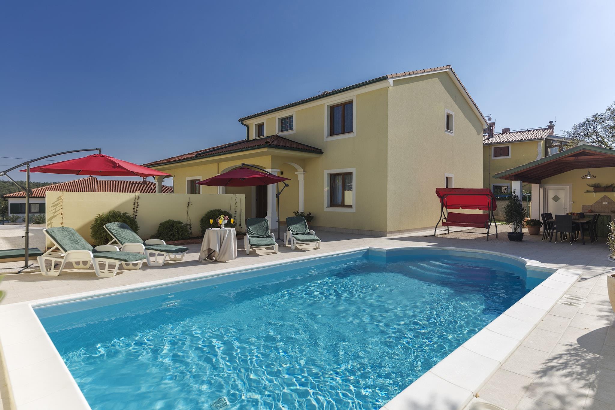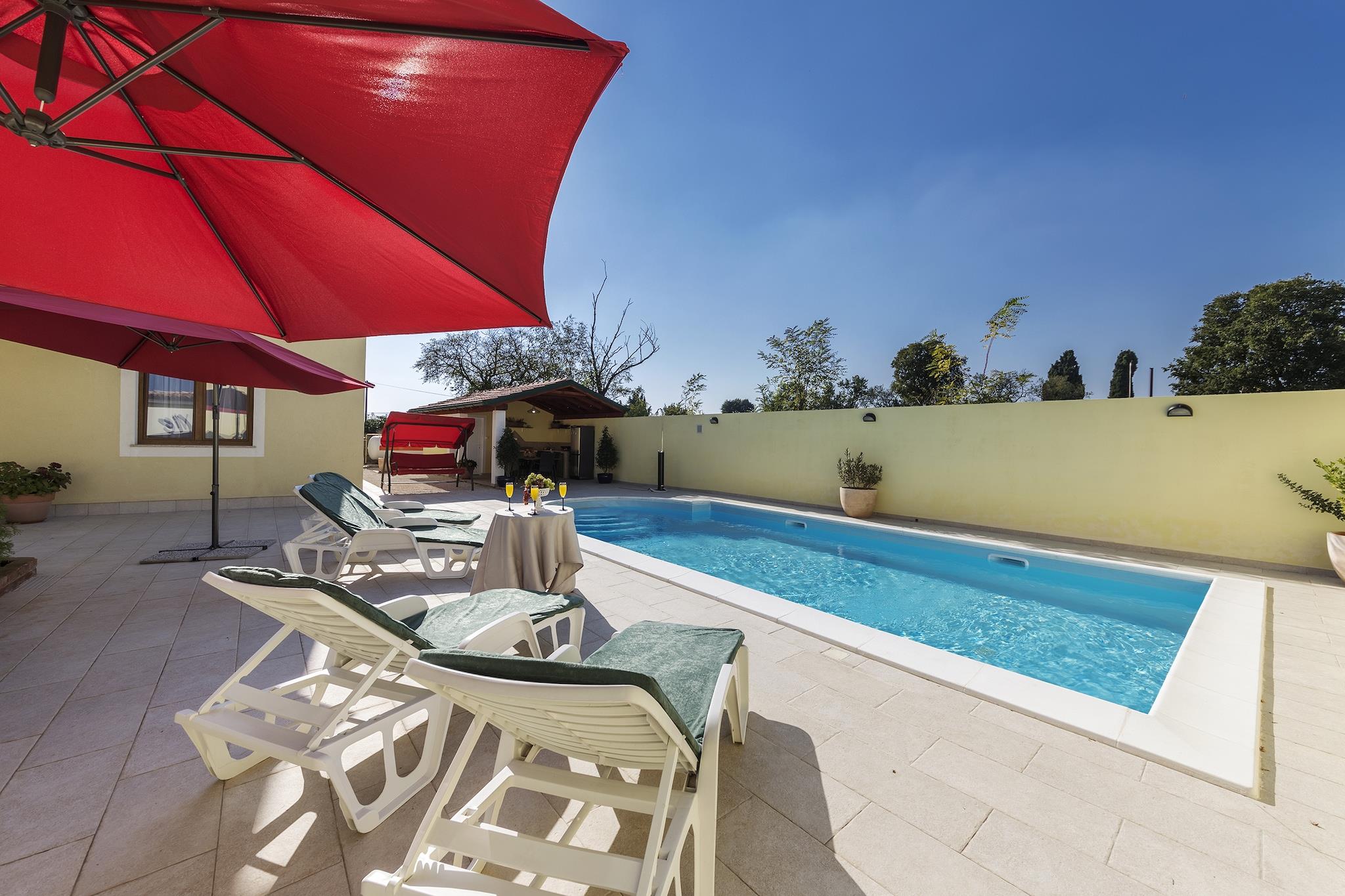 Diese große, freistehende Villa mit eigenem Pool befindet sich im Ort Marmajola, 5 km vom pittoresken Vodnjan entfernt. Die Strände an der Westküste von Istrien liegen ungefähr 15 Autominuten entfernt. Die Villa Monique ist freistehend und gepflegt eingerichtet. Sie verfügen über einen Garten mit Pool und Liegen, eine überdachte Terrasse mit Außenküche, einen Grill und einen Picknicktisch. Im Erdgeschoss finden Sie ein Wohnzimmer mit einer offenen Küche, zwei Schlafzimmer und ein Badezimmer. In der ersten Etage gibt es zwei Schlafzimmer und ein Badezimmer. In Istrien kann man genug unternehmen! Sie können zum Beispiel die wunderschöne Stadt Pula (15 km) besuchen. Hier finden Sie unter anderem ein wunderschönes Amphitheater aus der Römerzeit und gesellige Straßencafés. Oder Rovinj (28 km), wo Sie durch die schmalen Gassen schlendern und das Straßenbild genießen können. Für Restaurants und Ihre täglichen Einkäufe können Sie nach Vodnjan fahren.