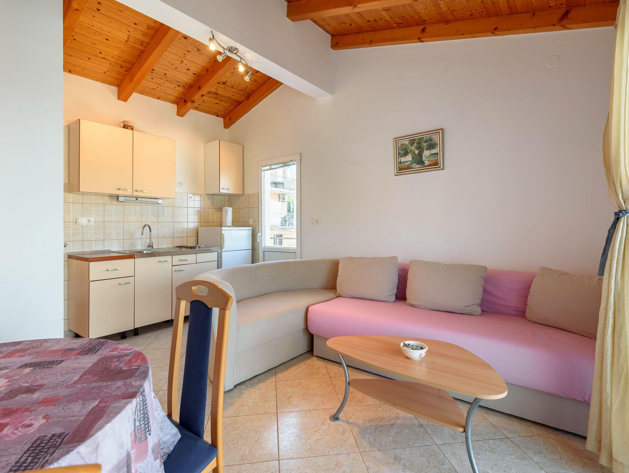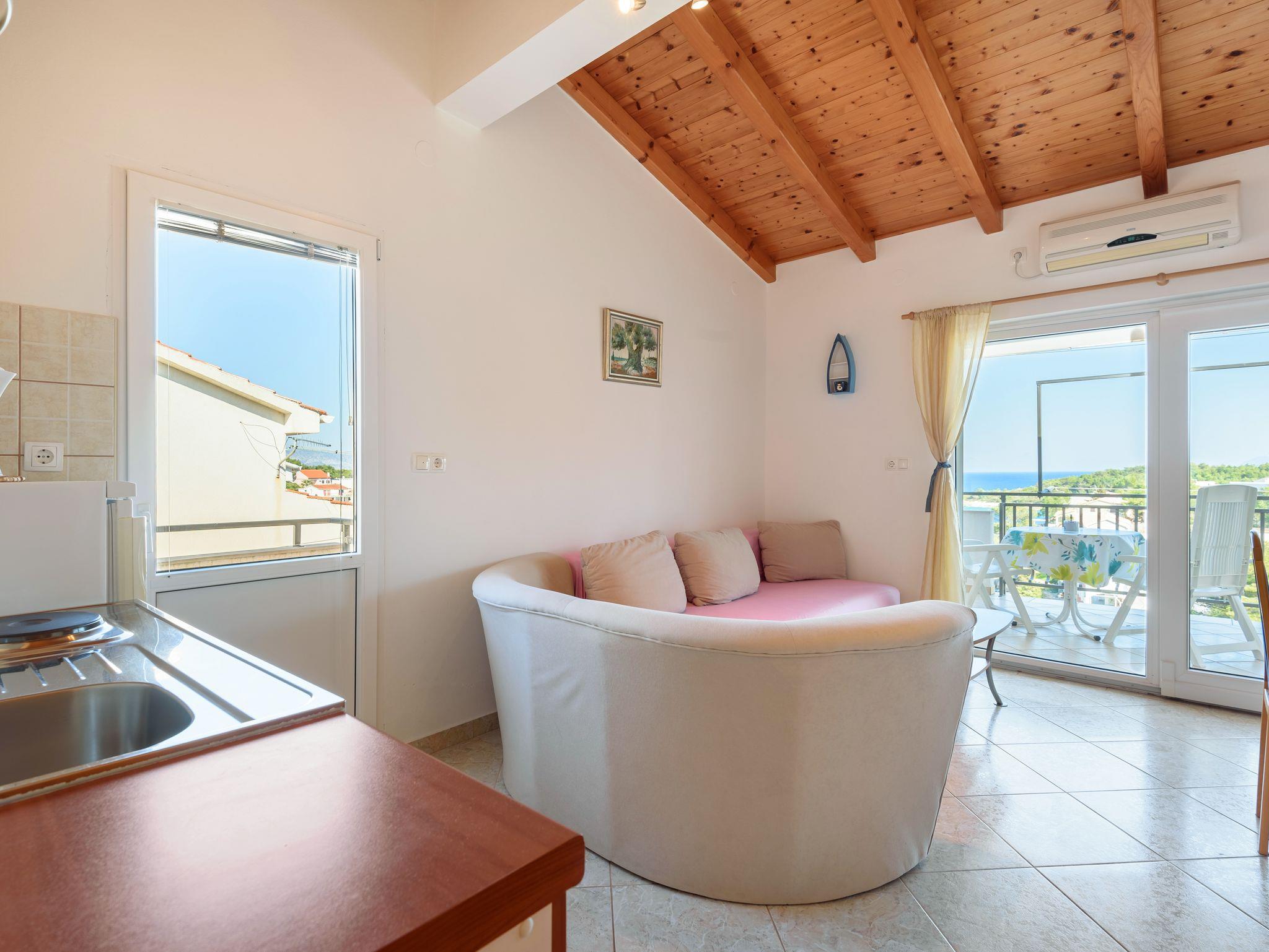 Studio bietet Platz für 2 Gäste. Die Betten sind in Schlafzimmern, die es 1 gibt, innerhalb einer Gesamtfläche von 24m2, angeordnet. Die Gäste haben eine eigene Terrasse zur Verfügung, auf der sie in warmen Sommernächten genießen können. Das Studio-Apartment bietet Meerblick. Es ist erlaubt, Speisen auf dem Gemeinschafts-Grill vorzubereiten. IM PREIS INBEGRIFFEN: Kurtaxe, Endreinigung, Klimatisierung, Parkplatz, Internet. VERBINDLICHE ZUSÄTZLICHE KOSTEN: Aufzahlung für Kurzaufenthalte (prozentualer Zuschlag pro Nächtigungsanzahl: 30% - 1, 20% - 2, 10% - 3). Die Verfügbarkeit zusätzlicher Dienstleistungen in Ihrem reservierten Termin und die Preise derselben (falls nicht aufgeführt) müssen im Voraus überprüft werden. Zusätzliche Dienstleistungen die in der Zahlungsaufforderung nicht aufgeführt sind werden direkt beim Vermieter bezahlt, angenommen der Gast nutzt auch diese. Ermäßigung auf den Grundpreis: Gratistag 14=13 (bei einem Aufenthalt von 14 Tagen oder mehr erhalten Sie einen Gratistag für den Aufenthalt bis 31.12.26).