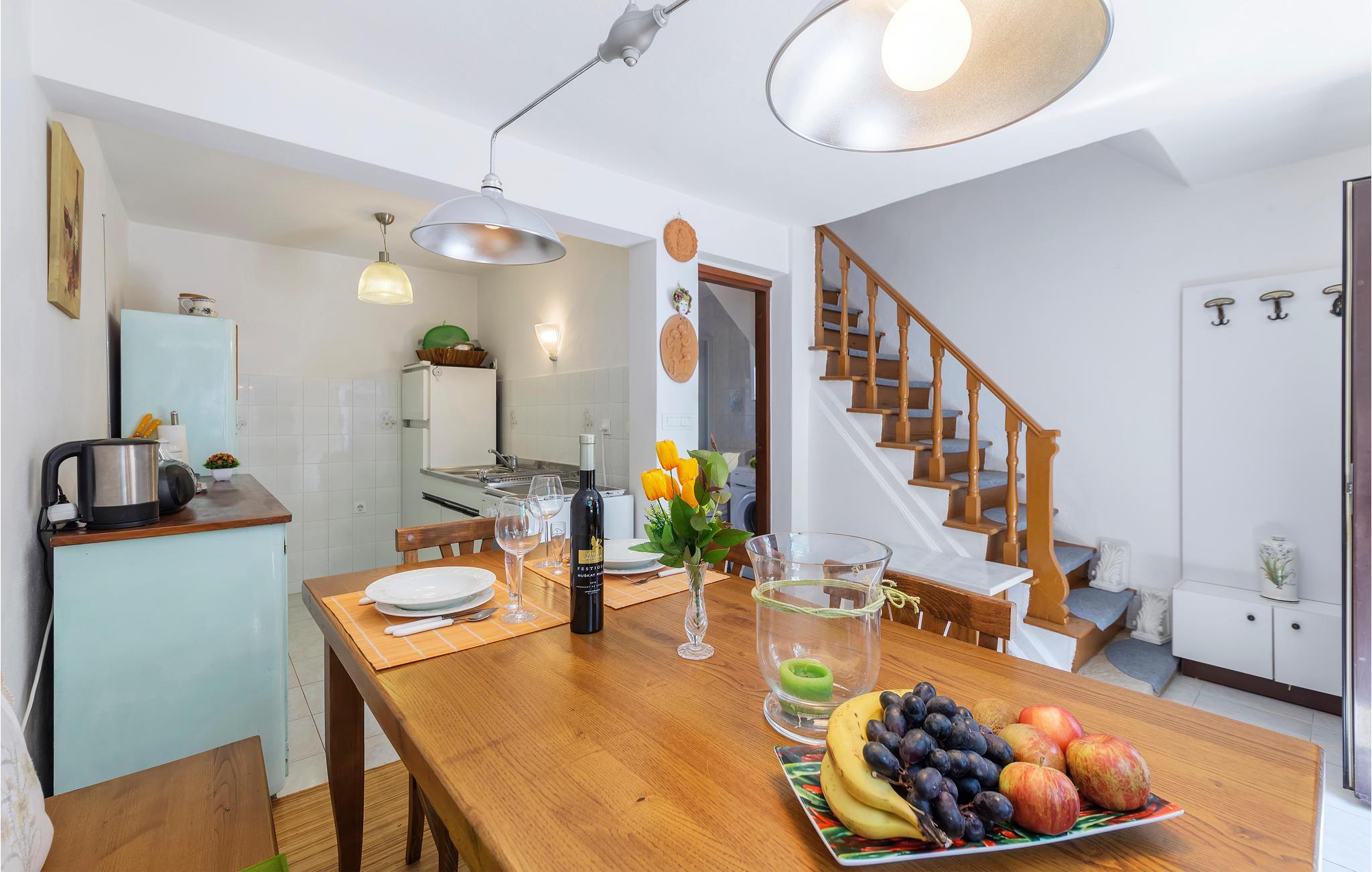Das Ferienhaus erstreckt sich über zwei Etagen, ist einfach, aber gemütlich eingerichtet und ist dank seiner Lage ideal für einen Urlaub ohne Auto. Die Wohnfläche des Hauses verteilt sich auf ein Schlafzimmer mit Doppelbett, einen Wohnraum mit extra Schlafgelegenheit, ein Badezimmer und eine Essküche. Für Unterhaltung ist mit WLAN und einem Fernseher gesorgt.