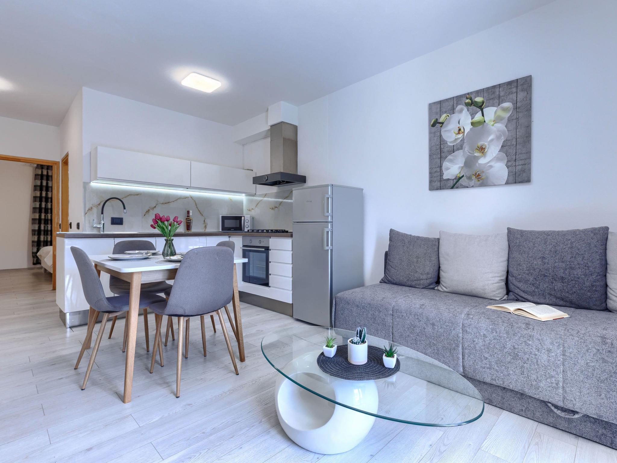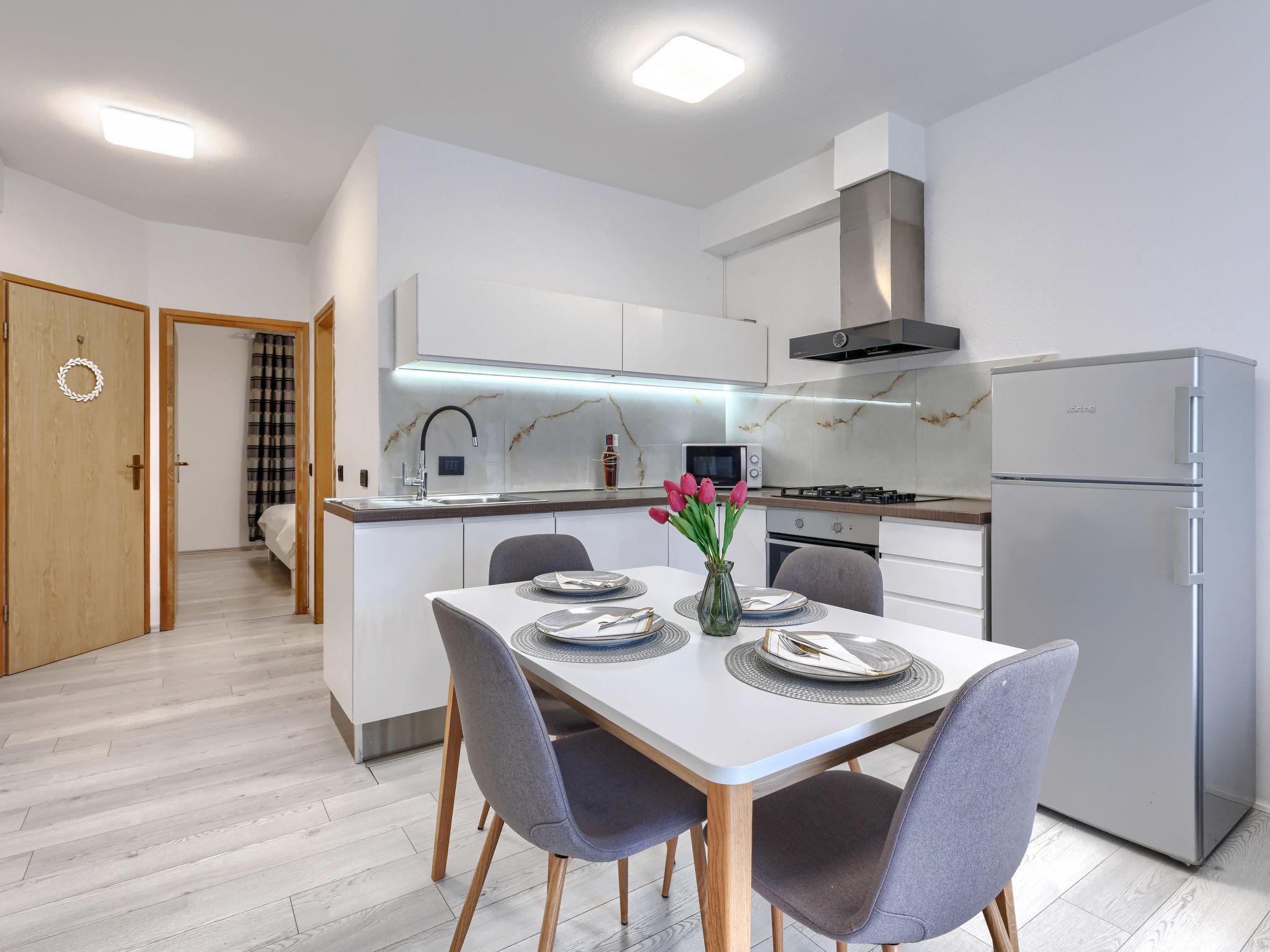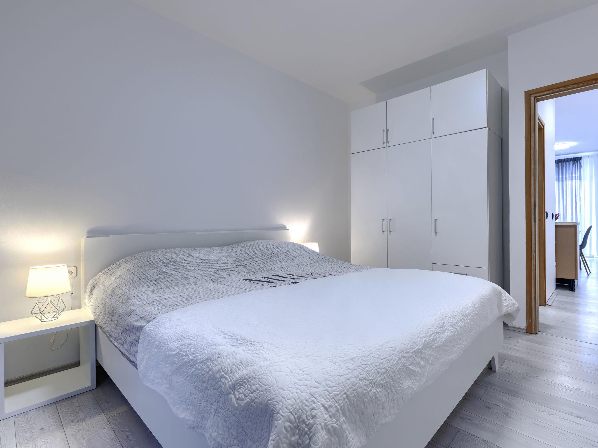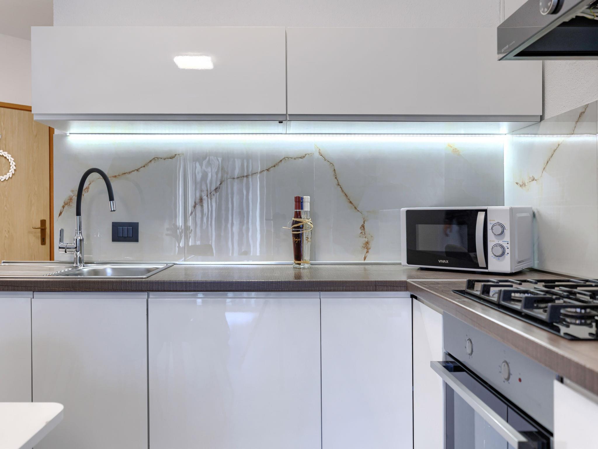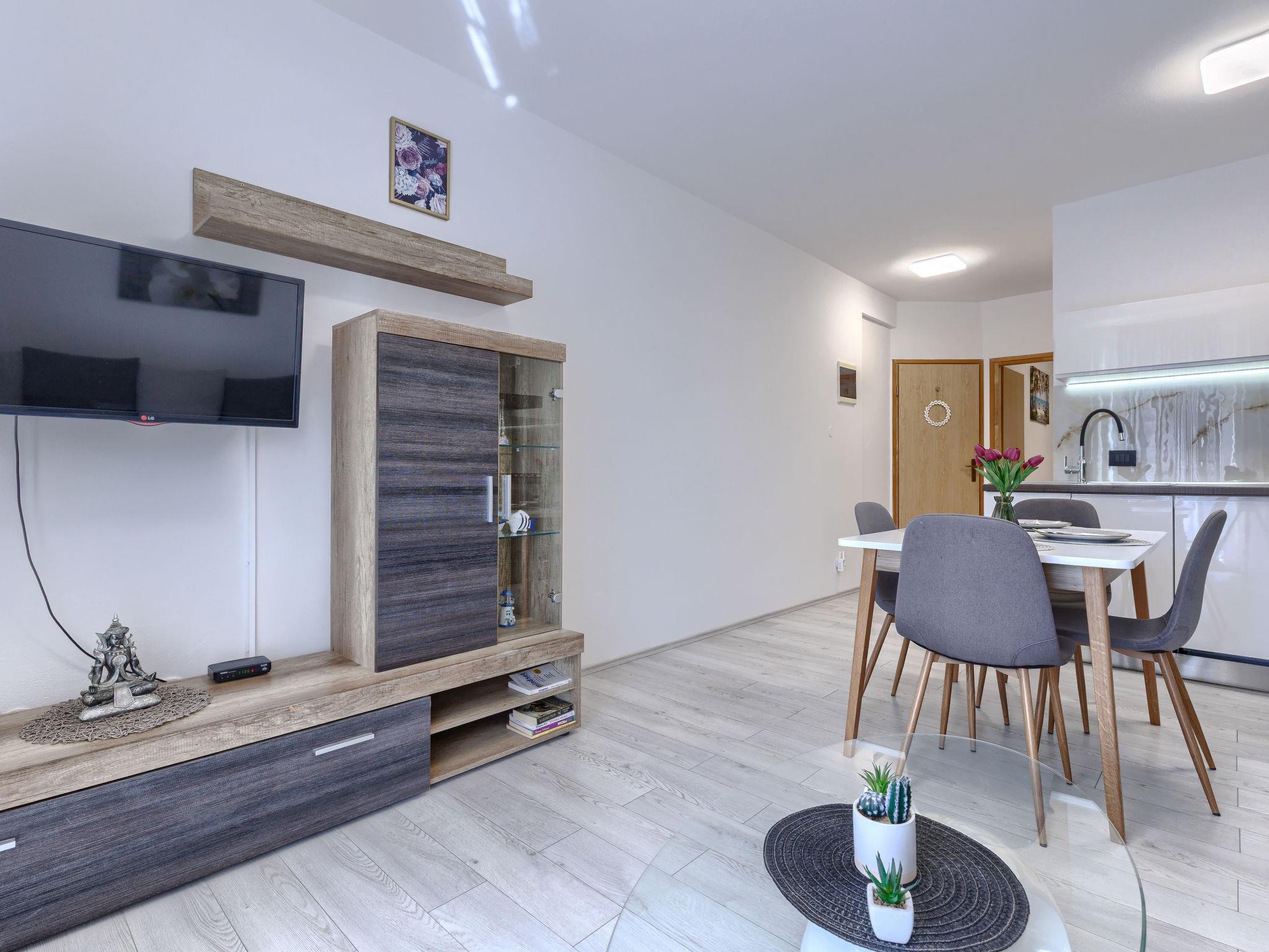 "A1", 2-Zimmer-Wohnung 50 m2 im 2. Stock. Schön eingerichtet: Wohn-/Esszimmer mit 1 Doppeldiwanbett (140 cm, Länge 200 cm), Sat-TV (Flachbildschirm), Klimaanlage. Ausgang zum Balkon. 1 Zimmer mit 1 franz. Bett (160 cm, Länge 200 cm). Offene Küche (Backofen, Geschirrspüler, 4 Glaskeramikplatten, Wasserkocher, Mikrowelle, Tiefkühler, elektrische Kaffeemaschine). Dusche/WC. Warmluftheizung. Balkon 4 m2. Balkonmöbel. Seitliche Sicht auf die Ortschaft und den Wald. Zur Verfügung: Waschmaschine. Internet (WLAN, gratis). Bitte beachten: Nichtraucher-Haus. Maximal 2 Haustiere/Hunde erlaubt.