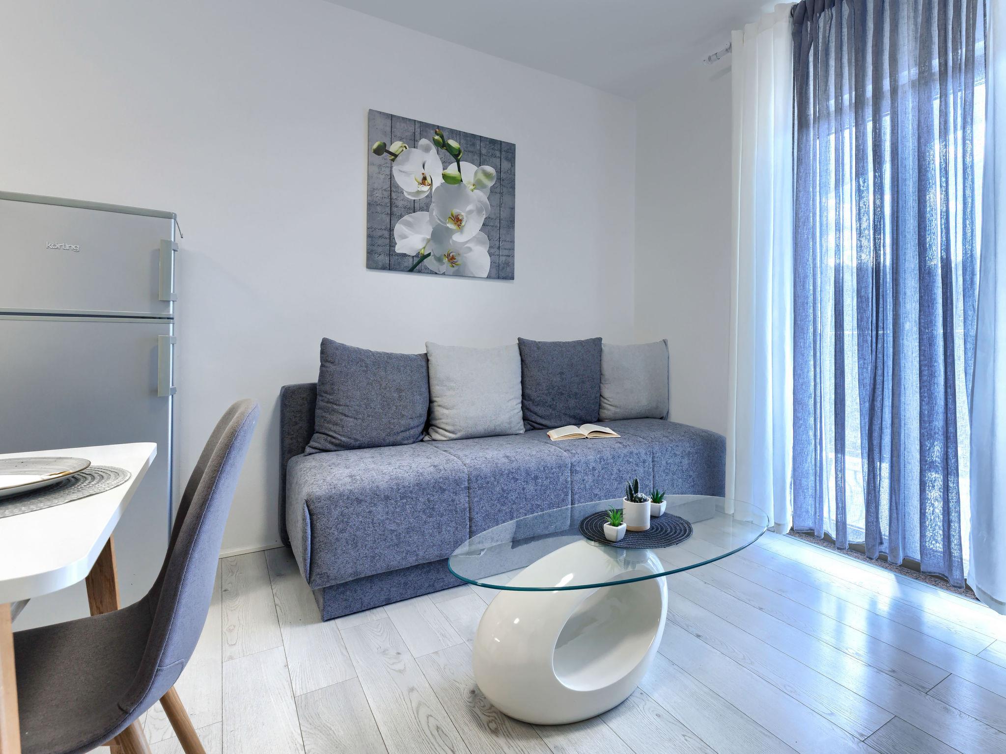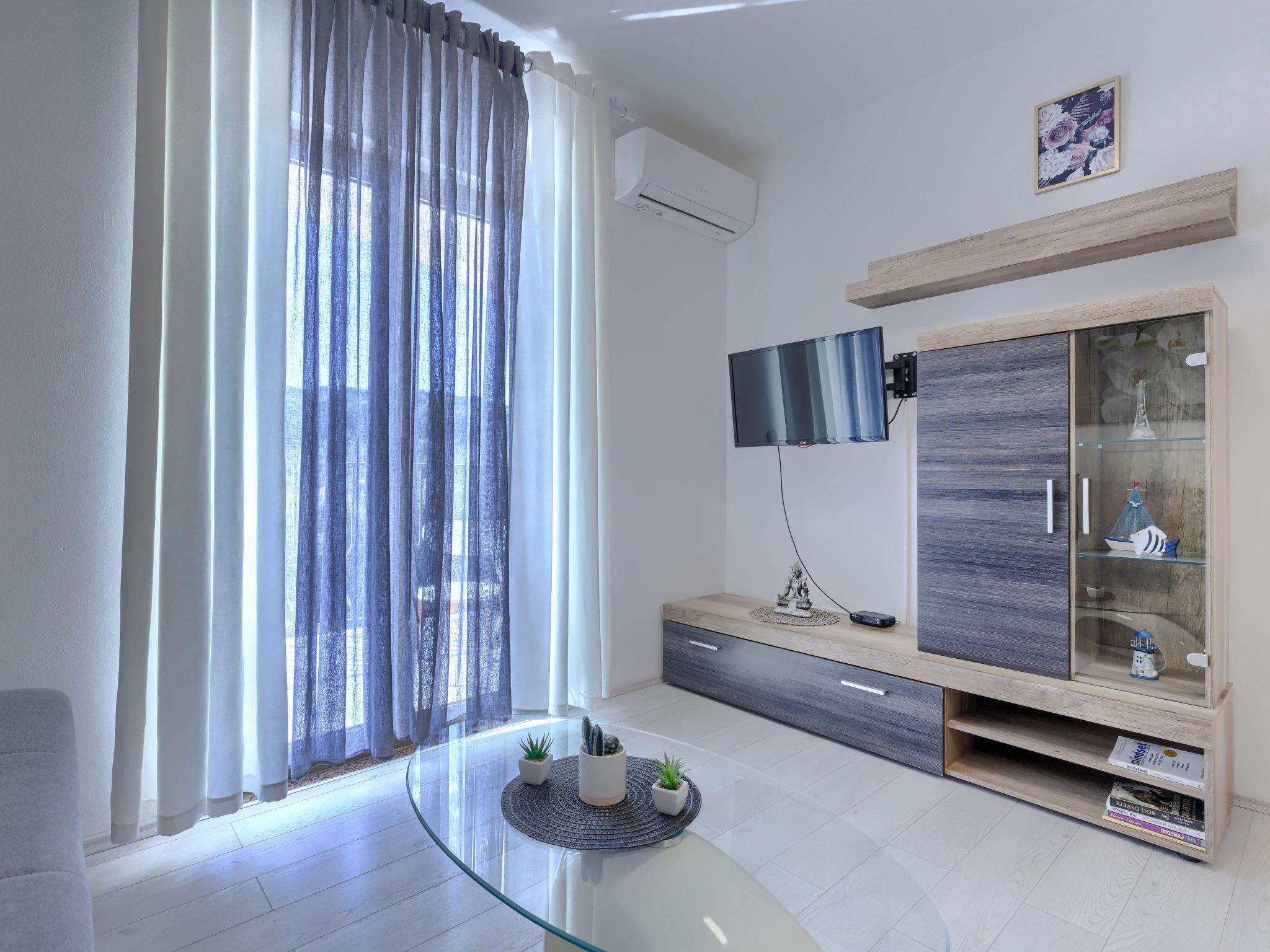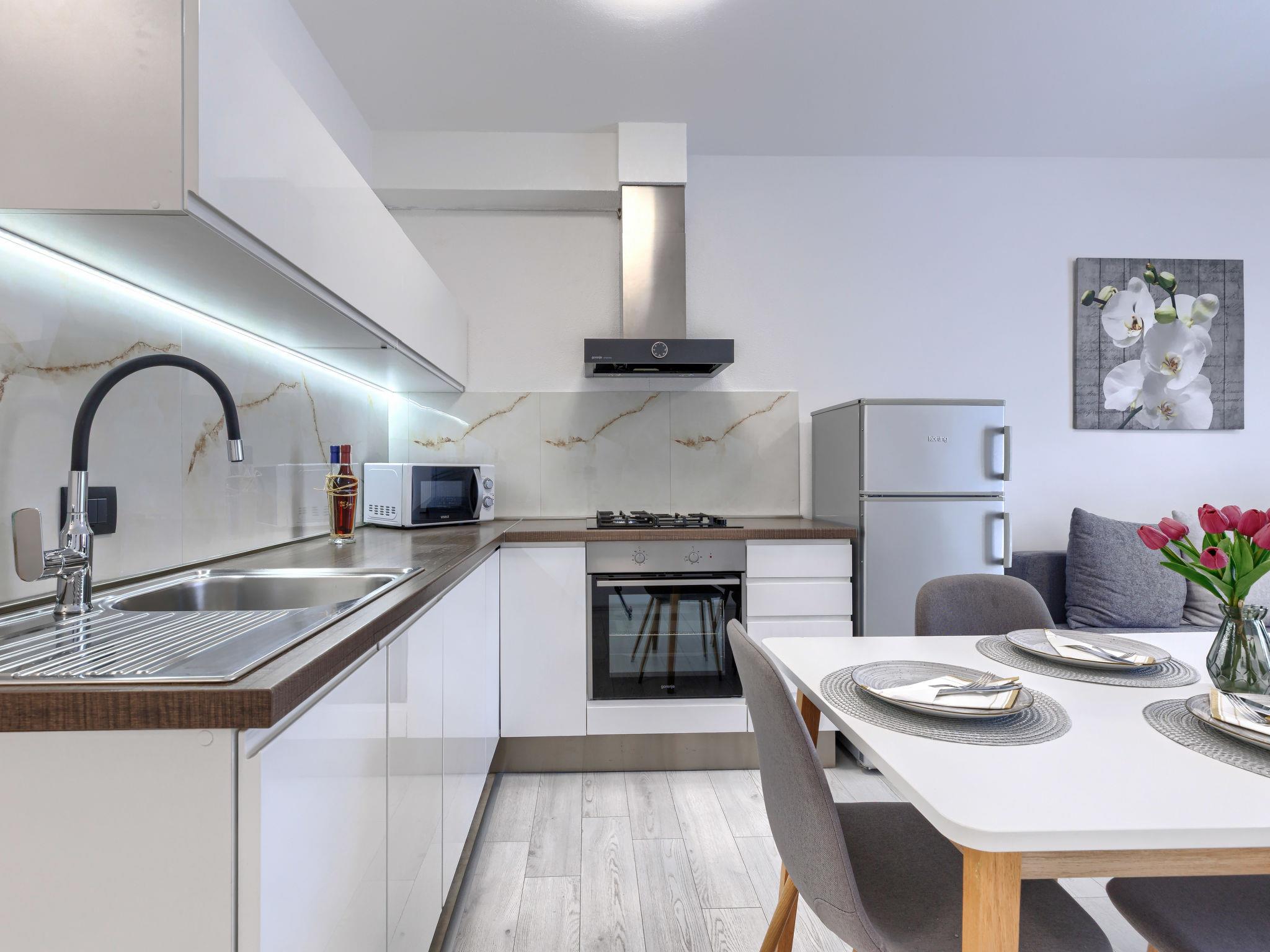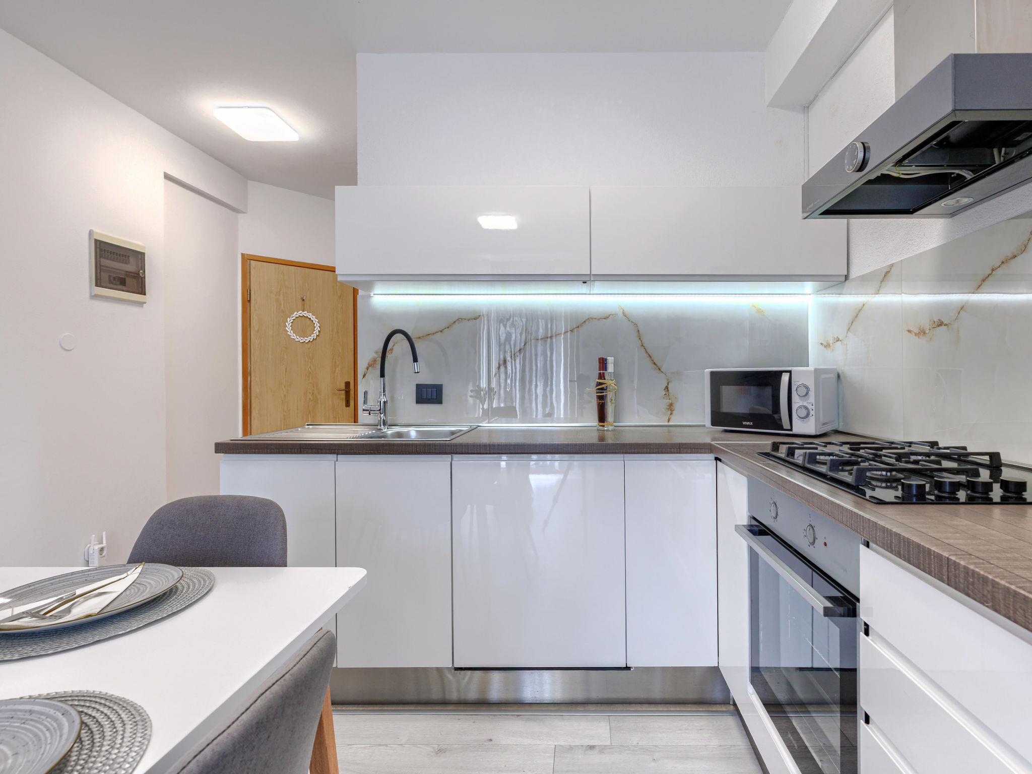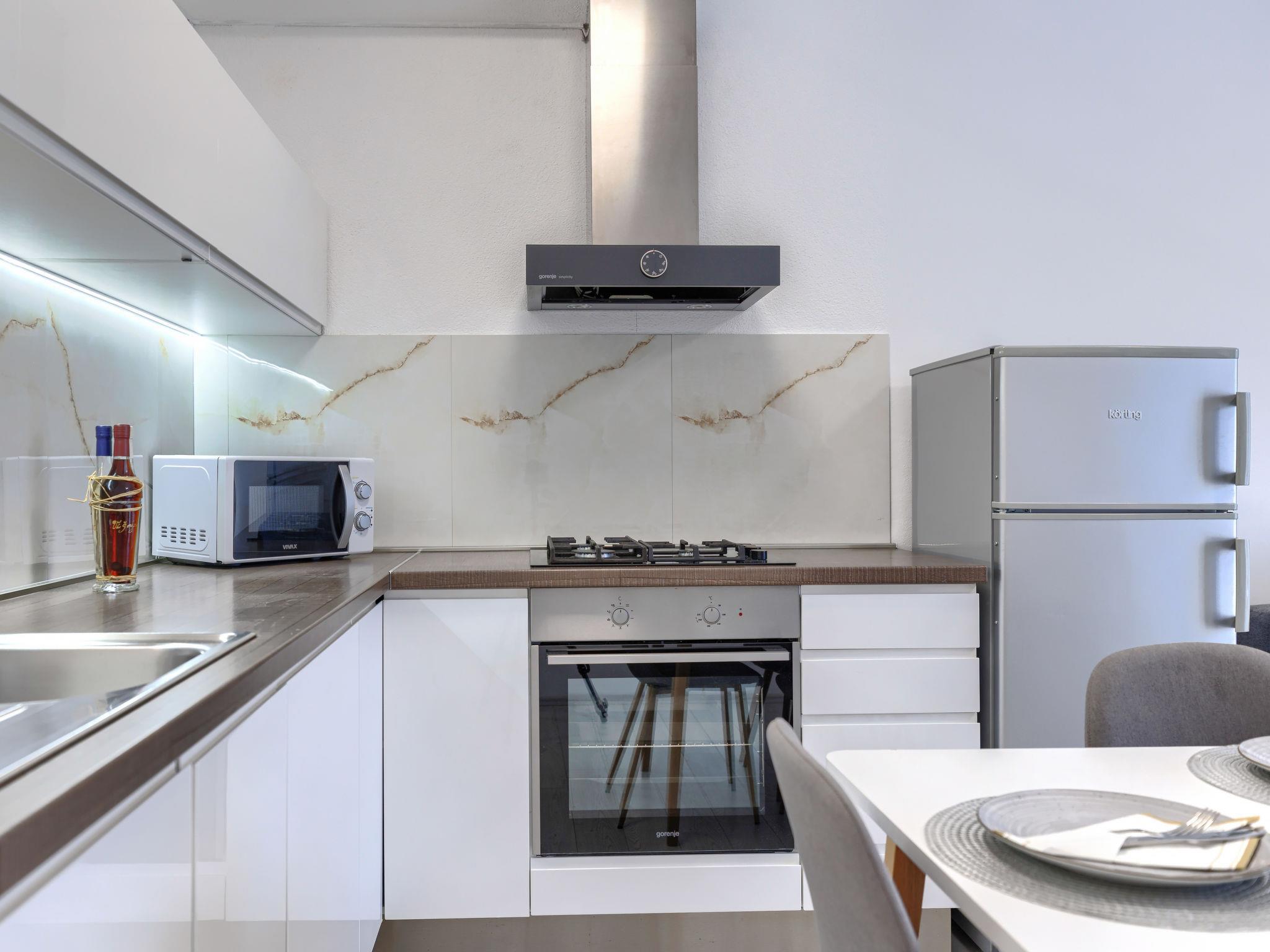 "A1", 2-Zimmer-Wohnung 50 m2 im 2. Stock. Schön eingerichtet: Wohn-/Esszimmer mit 1 Doppeldiwanbett (140 cm, Länge 200 cm), Sat-TV (Flachbildschirm), Klimaanlage. Ausgang zum Balkon. 1 Zimmer mit 1 franz. Bett (160 cm, Länge 200 cm). Offene Küche (Backofen, Geschirrspüler, 4 Glaskeramikplatten, Wasserkocher, Mikrowelle, Tiefkühler, elektrische Kaffeemaschine). Dusche/WC. Warmluftheizung. Balkon 4 m2. Balkonmöbel. Seitliche Sicht auf die Ortschaft und den Wald. Zur Verfügung: Waschmaschine. Internet (WLAN, gratis). Bitte beachten: Nichtraucher-Haus. Maximal 2 Haustiere/Hunde erlaubt.