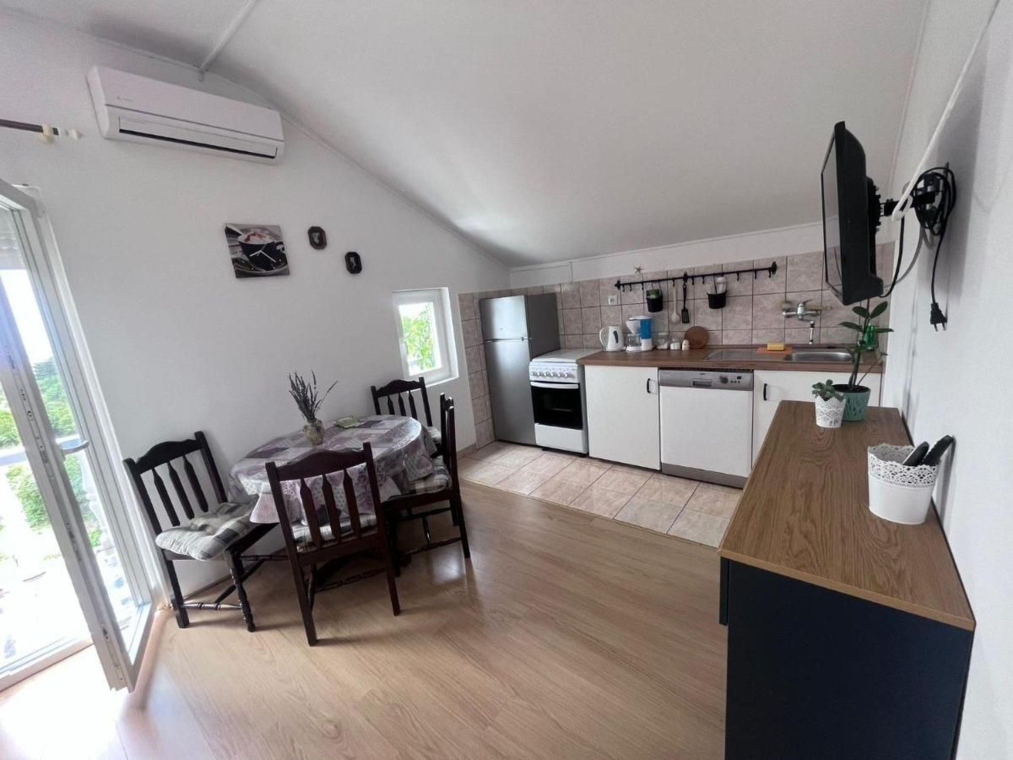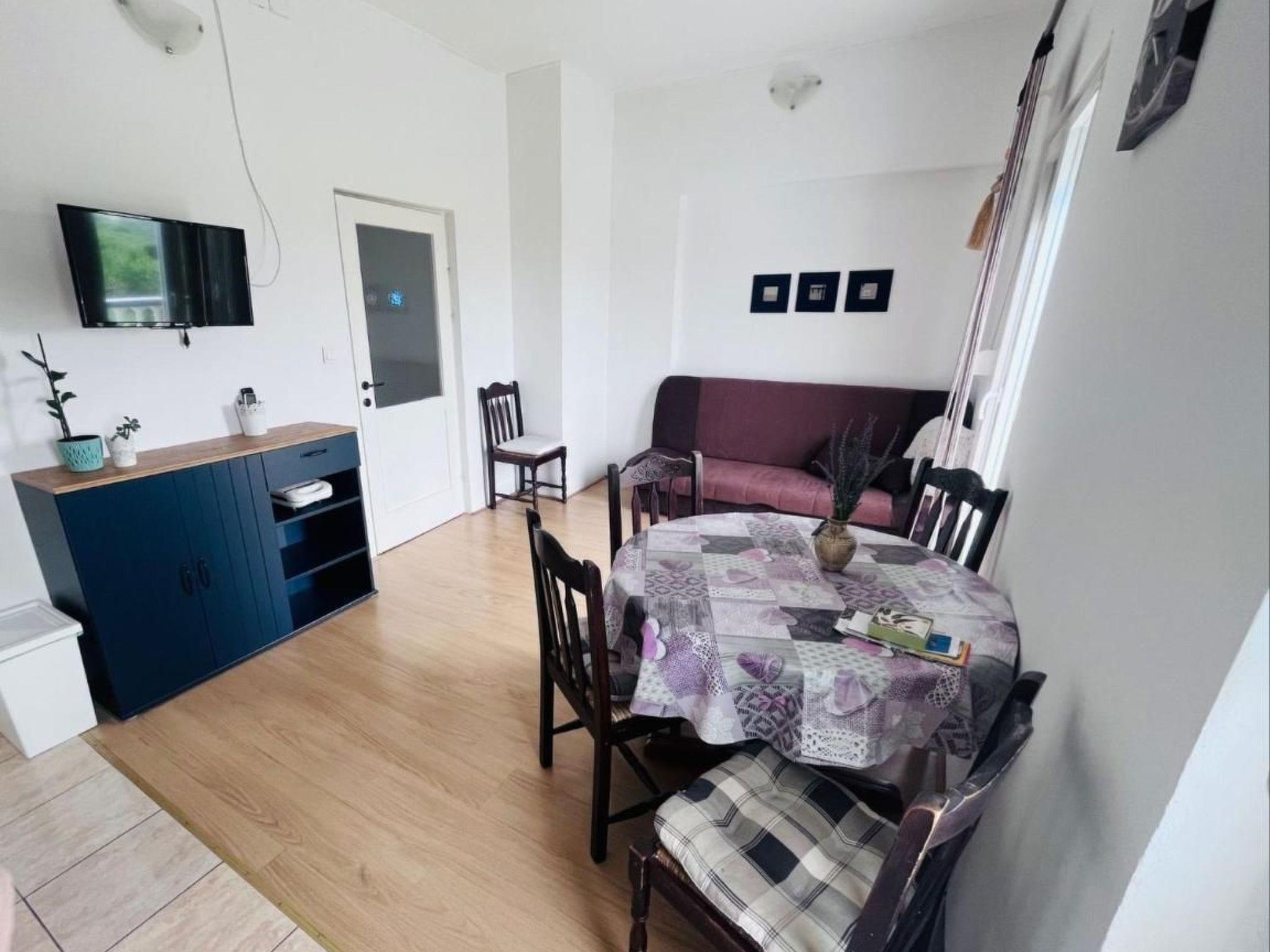 Das Apartment mit einem Schlafzimmer für 4 Personen befindet sich im ersten Stock. Es verfügt über ein Schlafzimmer mit einem großen Doppelbett und ein Schlafsofa für zwei Personen im Wohnzimmer. Die Gäste haben Zugang zu einer voll ausgestatteten Küche mit Geschirrspüler. Die Wohnung verfügt über ein Bad mit Dusche, ein Wohnzimmer und einen Balkon mit Meerblick und Gartenmöbeln. Es ist mit einer Waschmaschine, Klimaanlage und Internet ausgestattet. Der komplett eingezäunte Hof steht Ihnen mit allen Annehmlichkeiten (Grill, Parkplatz, Kinderspielplatz) zur Verfügung.