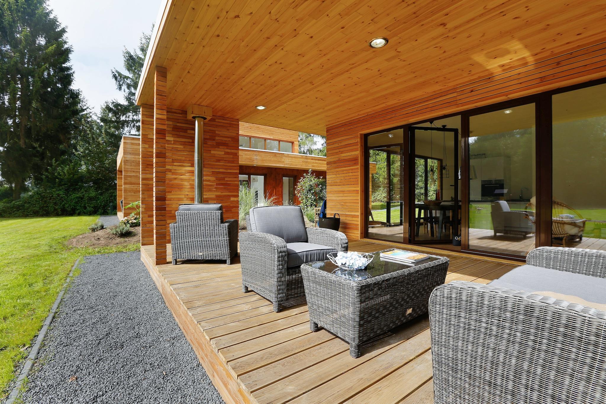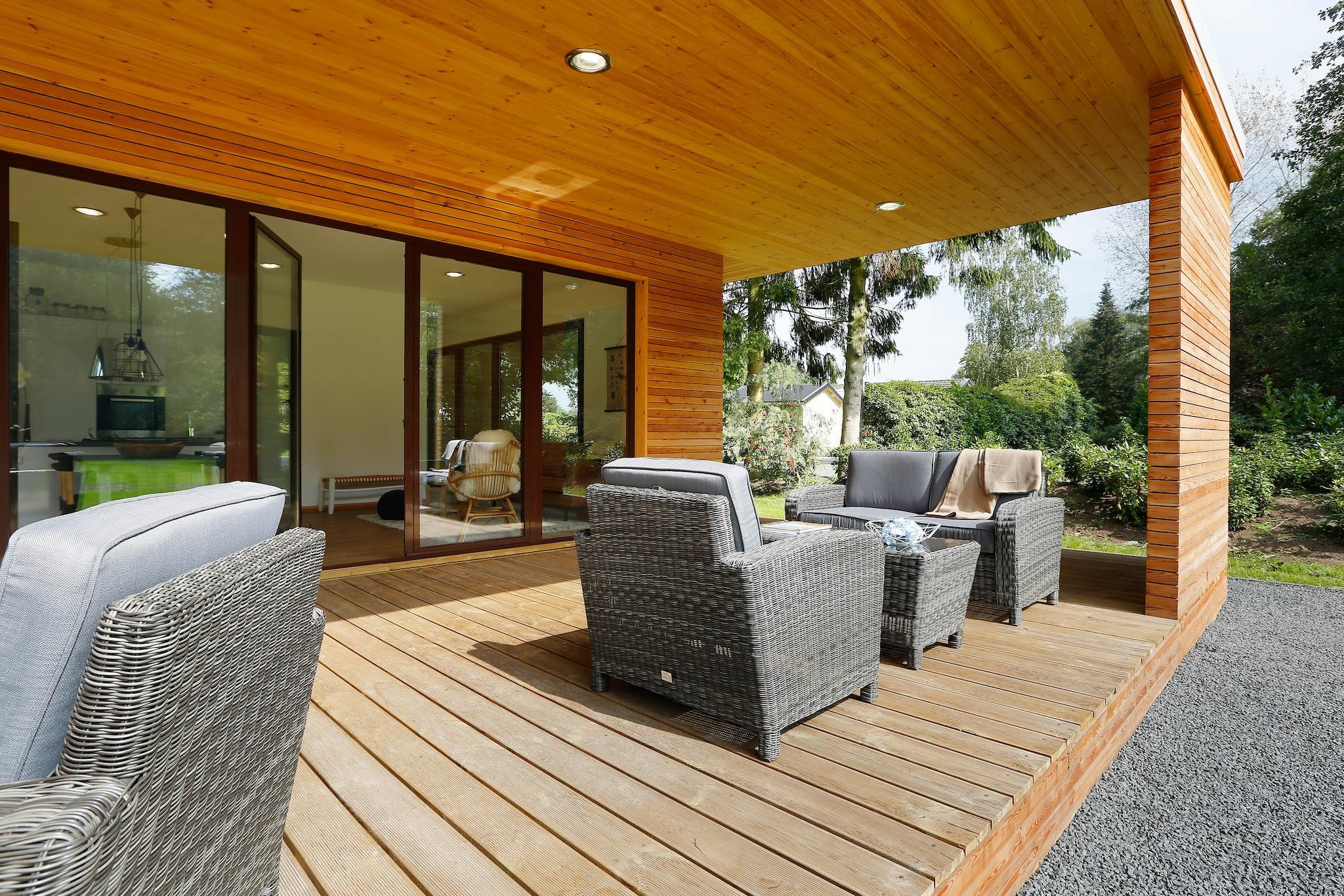 Parterre: (Eingangshalle(Toilette), Wohnzimmer(TV(Flatscreen)), offene Küche(Kochherd(4 Kochplatten, Induktion), Kombi-Mikrowelle, Spülmaschine, Kühlschrank), Schlafzimmer mit Badezimmer(2x Einzelbett, Dusche, Waschbecken, Toilette), Schlafzimmer mit Badezimmer(2x Einzelbett, Dusche, Waschbecken, Toilette)) Veranda(Ofen(Holz)), Garten, Gartenmöbel, Parkplatz, Pool(Gemeinschaftliche Nutzung mit anderen Gästen, im Garten)