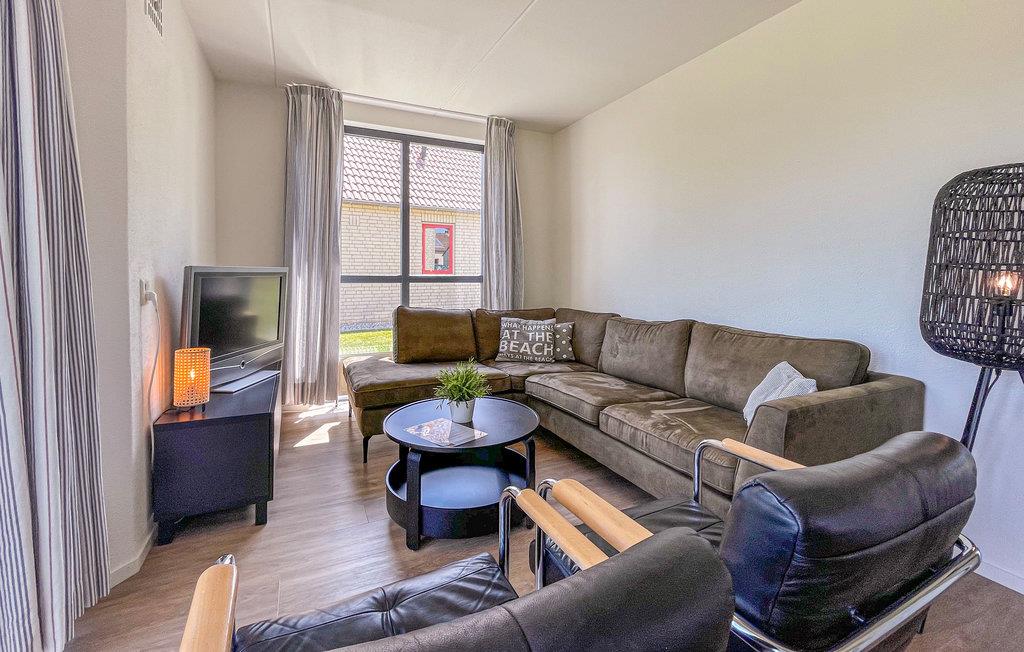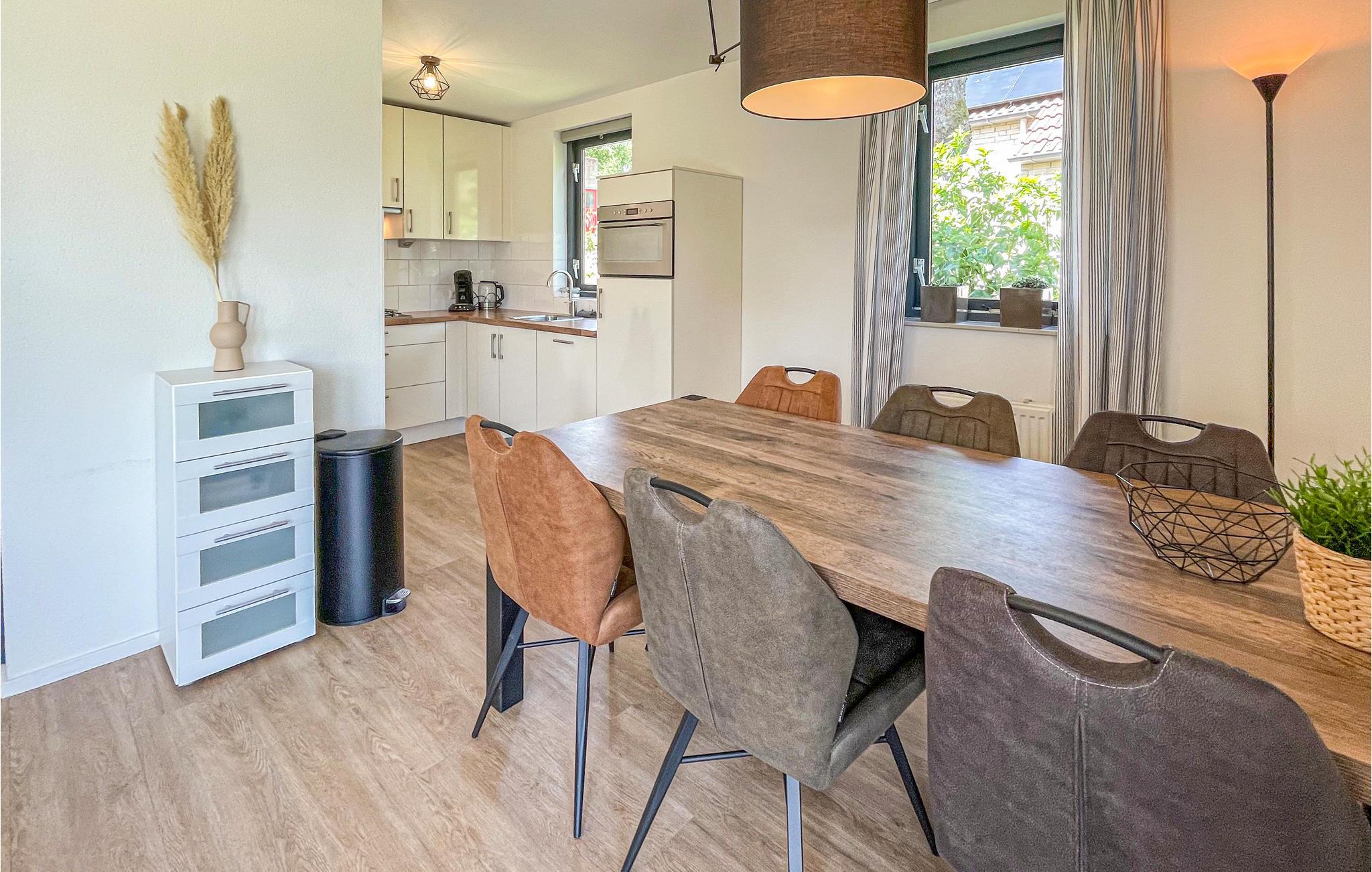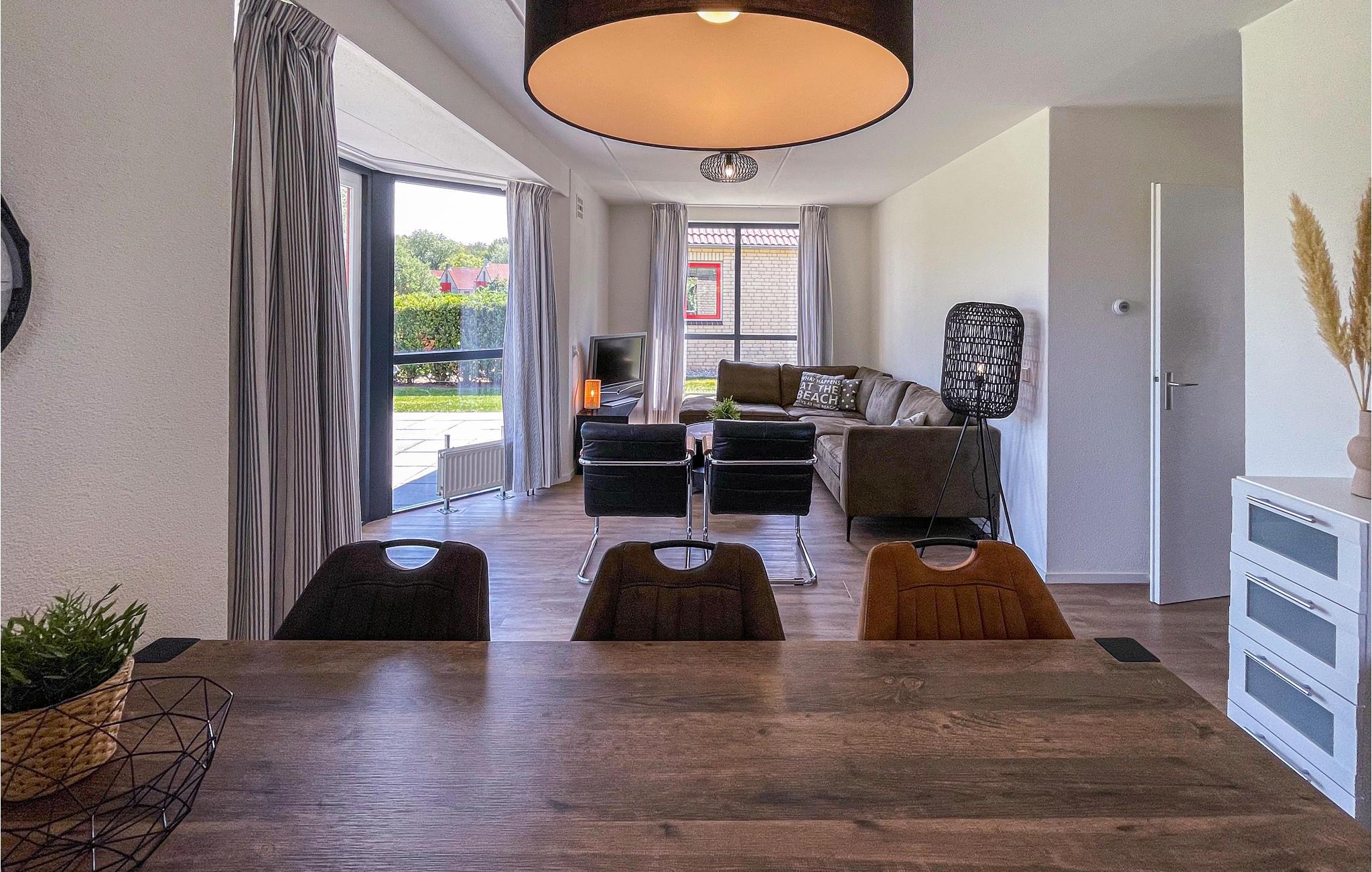 Dieses gemütliche Ferienhaus erstreckt sich über 2 Etagen und ist mit seiner modernen Einrichtung und hellen Zimmern sehr einladend. Das Herz des Hauses ist der Wohnbereich mit großen Fenstern und Essbereich, der mit der Küche verbunden ist. Verbringen Sie hier gesellige Abende mit der Familie und Freunden und genießen Sie vom Sofa den Ausblick in den Garten. Von hier gelangen Sie auch auf die offene Terrasse, auf der Sie den Tag mit einem leckeren Frühstück starten und die Aussicht auf die Landschaft und den Badesee genießen können.