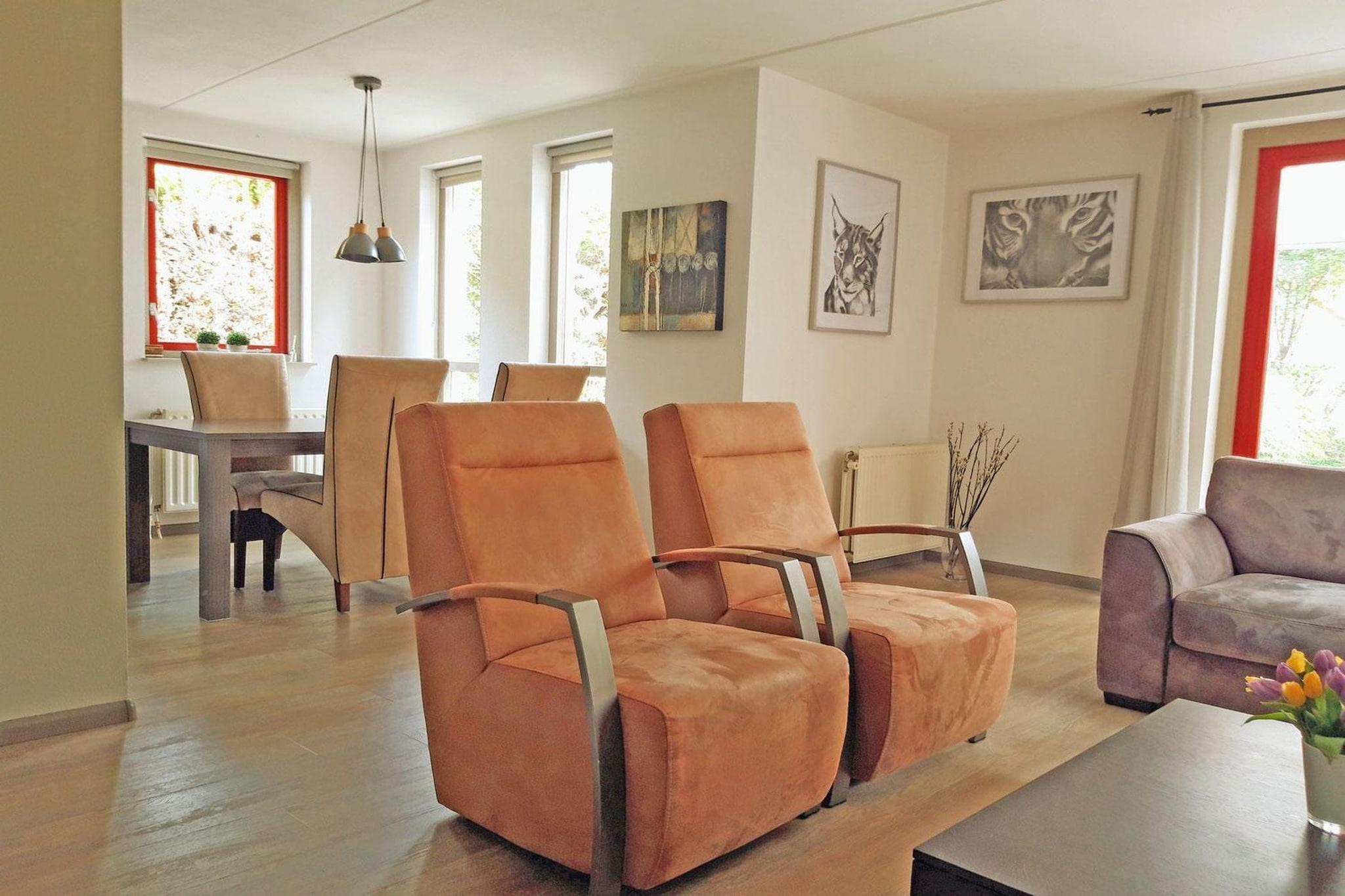 Erleben Sie einen erholsamen Urlaub in diesem komplett renovierten Bungalow in ruhiger Lage im Park. Das freistehende Haus besticht durch ein stilvoll renoviertes Interieur und eine moderne Raumaufteilung, die höchsten Wohnkomfort bietet. Der helle Wohnbereich lädt zum Verweilen ein, und die geräumige Küche ist mit Gasherd, Backofen und Kühl-/Gefrierkombination ausgestattet – ideal für die Zubereitung köstlicher Mahlzeiten. Jedes Detail der Innenräume wurde sorgfältig gestaltet, um eine elegante Atmosphäre zu schaffen, die durch das Highspeed-WLAN zusätzlich verstärkt wird. Die Unterkunft erstreckt sich über zwei Etagen und bietet so maximalen Platz und Privatsphäre. Im Erdgeschoss befindet sich ein großer Abstellraum mit Waschmaschine und Trockner – perfekt für längere Aufenthalte. Im Obergeschoss erwarten Sie zwei komfortable Schlafzimmer: eines mit einem extralangen Doppelbett für einen erholsamen Schlaf und das andere mit zwei Einzelbetten. Auf dieser Etage befindet sich außerdem ein zweites WC. Das geräumige Badezimmer ist ein echtes Highlight und bietet einen modernen Rückzugsort zum Entspannen nach einem Tag in der wunderschönen Waldlandschaft und auf den nahegelegenen Wanderwegen. Der Außenbereich ist ein besonderes Merkmal dieser Unterkunft: ein wunderschön angelegter und komplett umzäunter Garten. Dieser private Rückzugsort ist der perfekte Ort für ruhige Morgenstunden auf der Terrasse oder entspannte Nachmittage in der Sonne – ganz ungestört. Im Bungalow ist das Rauchen strengstens untersagt und Haustiere sind nicht erlaubt. So wird allen Gästen eine saubere und angenehme Umgebung geboten.