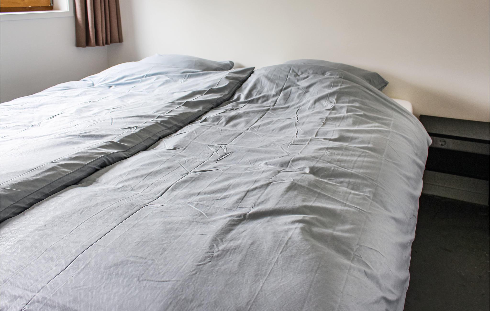 Es gibt zwei Schlafzimmer, von denen eines ein Doppel-Boxspringbett und zwei Einzel-Boxspringbetten für Sie bereit hält. Zudem freuen Sie sich über ein Badezimmer mit Dusche, Waschbecken und Toilette. Vom Wohnzimmer aus gelangen Sie durch die Schiebetüren auf die Terrasse, wo Sie den schönen Blick ins Grüne genießen können.